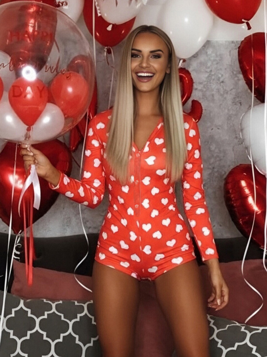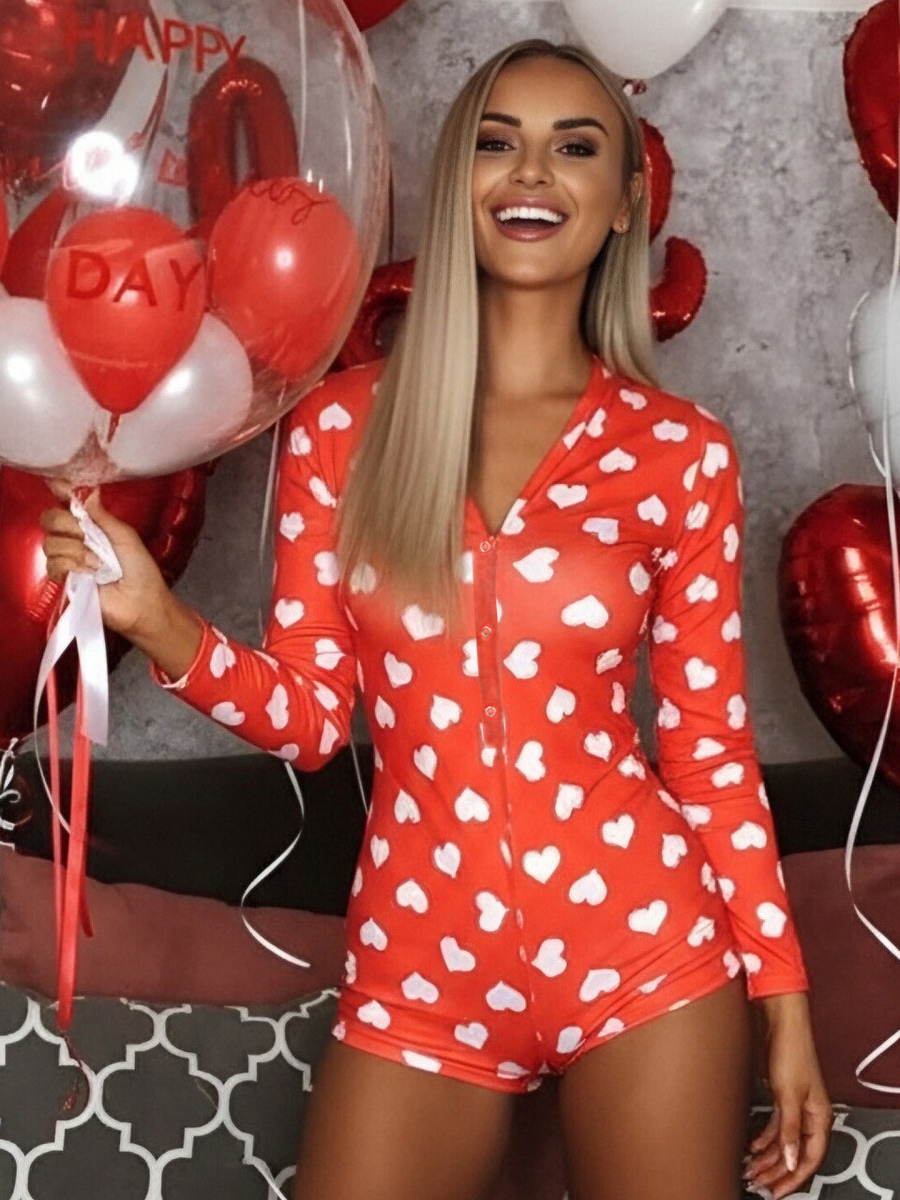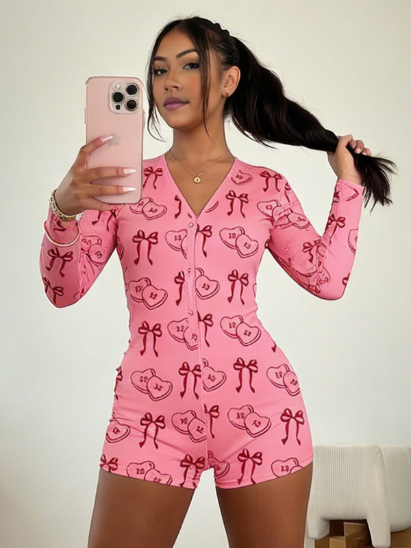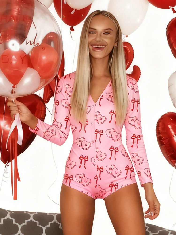 リッププリントロンパースパジャマ(女性用) - セクシーなVネック長袖ボタンフロントボディコンオールインワンパジャマ - バレンタインデー2026