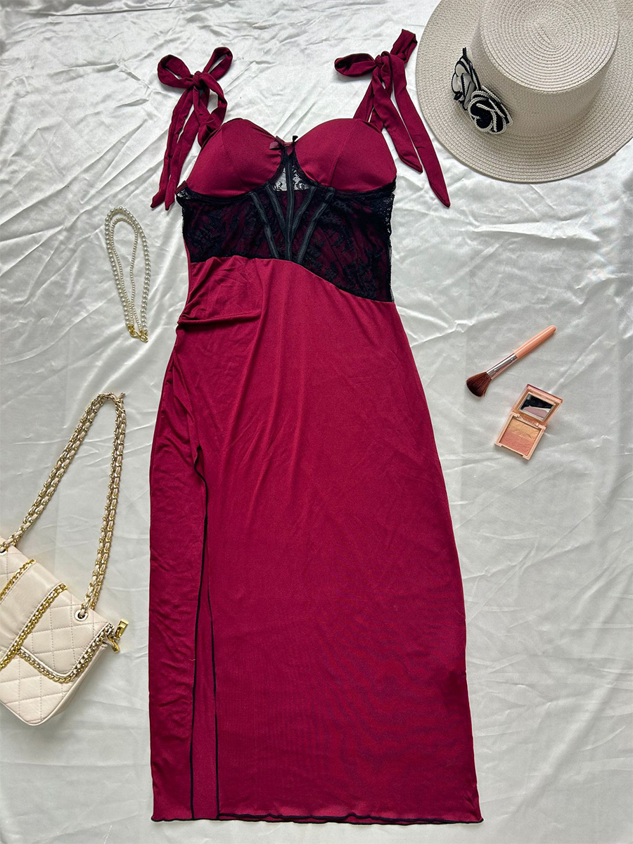 ロングナイトガウン バーガンディ セクシー バックレス ツートン ノースリーブ ボディコン レース ハイサイドスリット ランジェリー