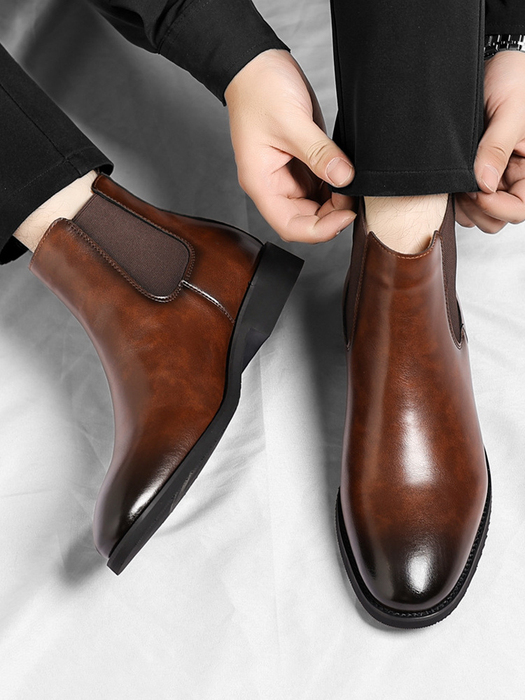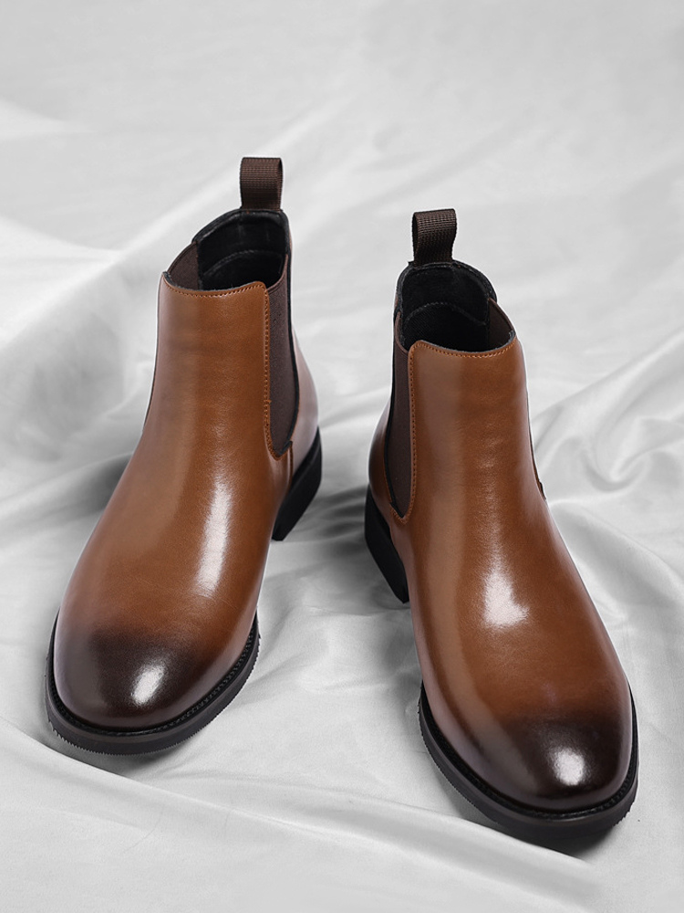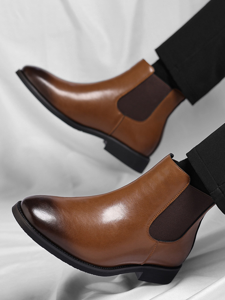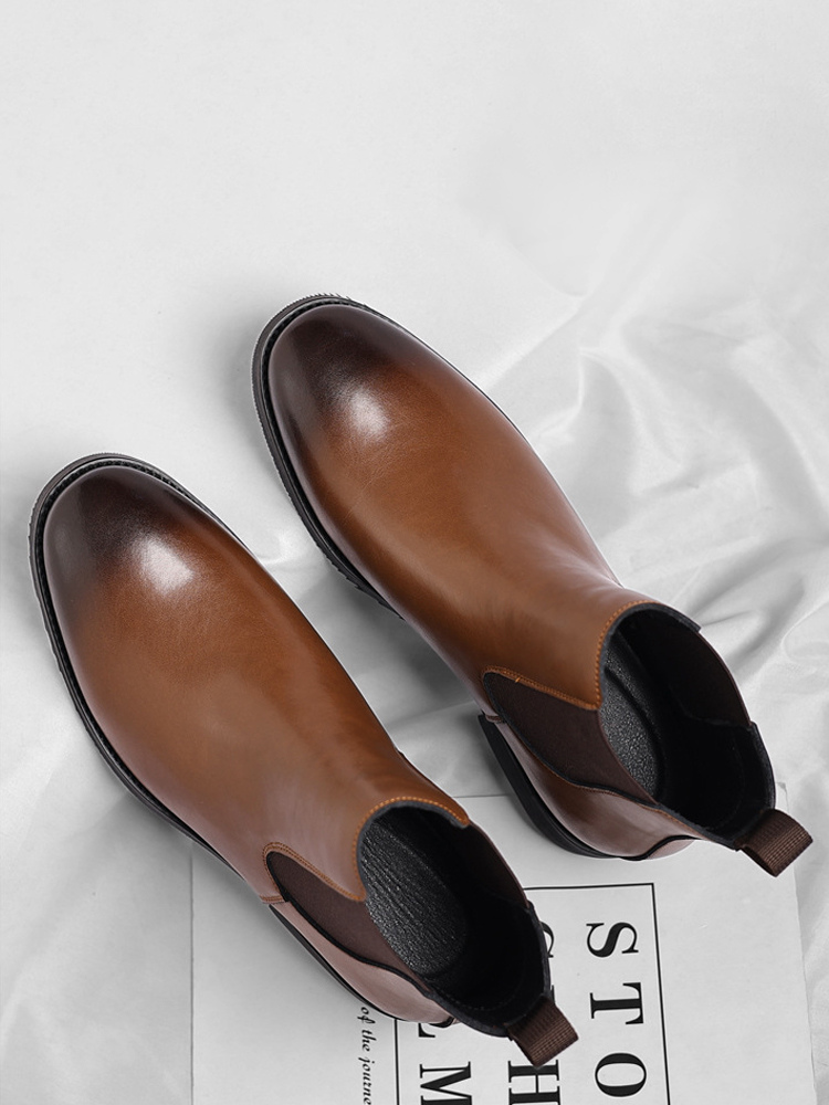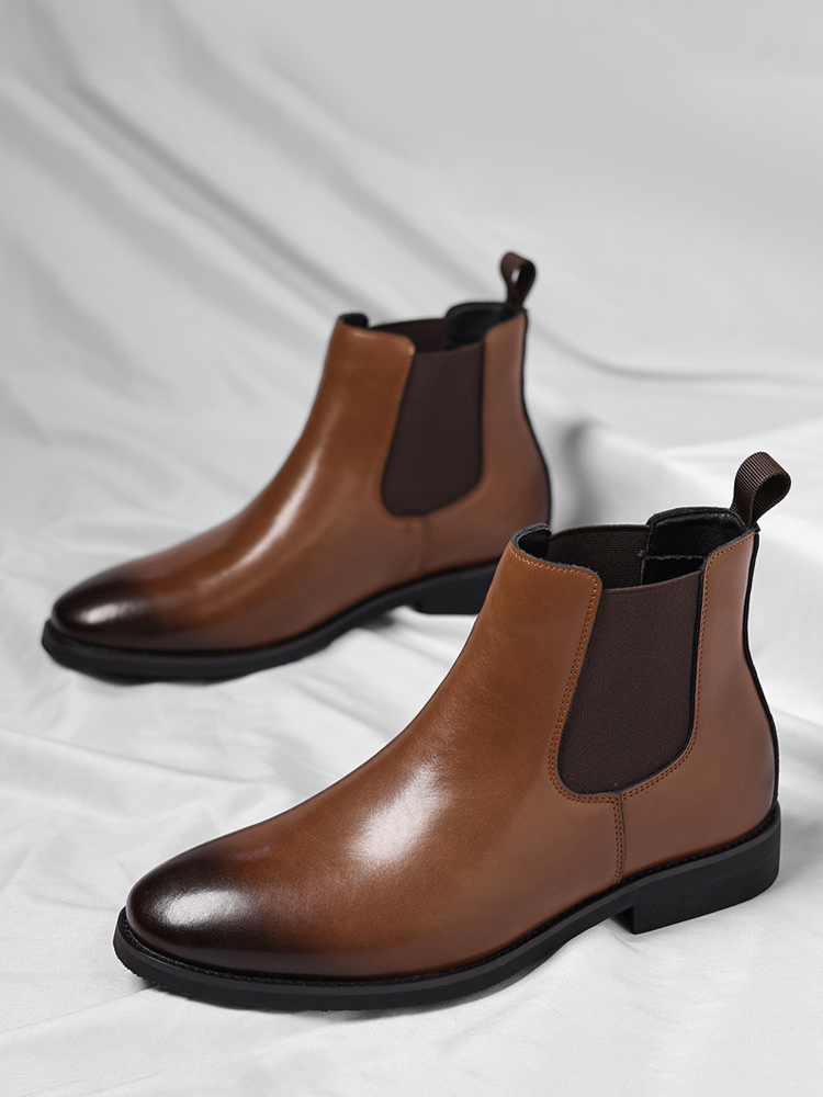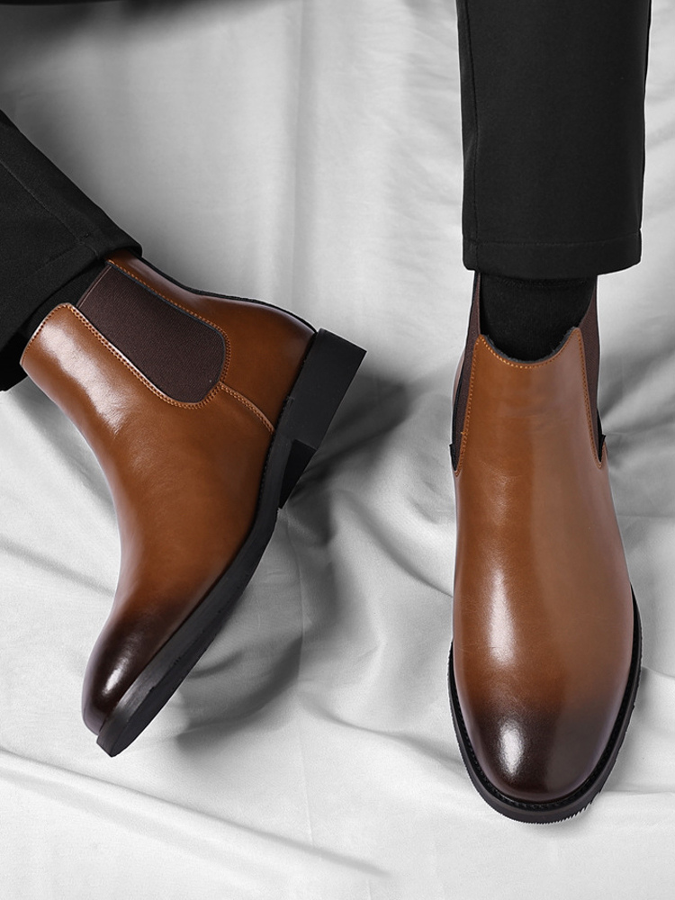 These men's Chelsea boots feature a sleek pointed toe and low heel, accented with a modern gradient color tip for a refined yet contemporary ankle boot design.