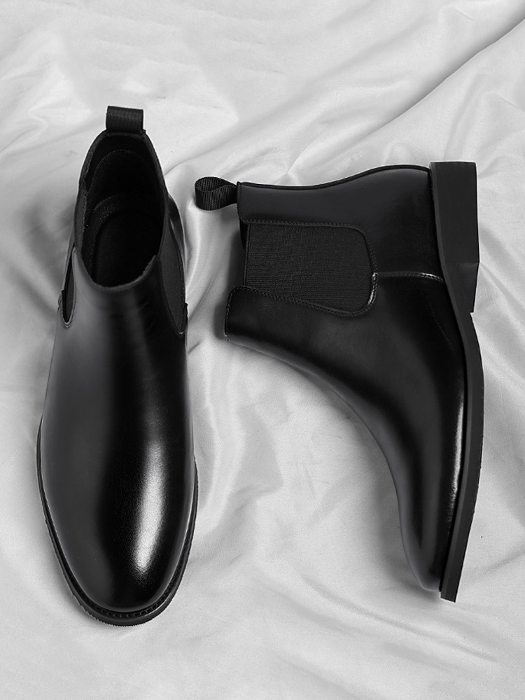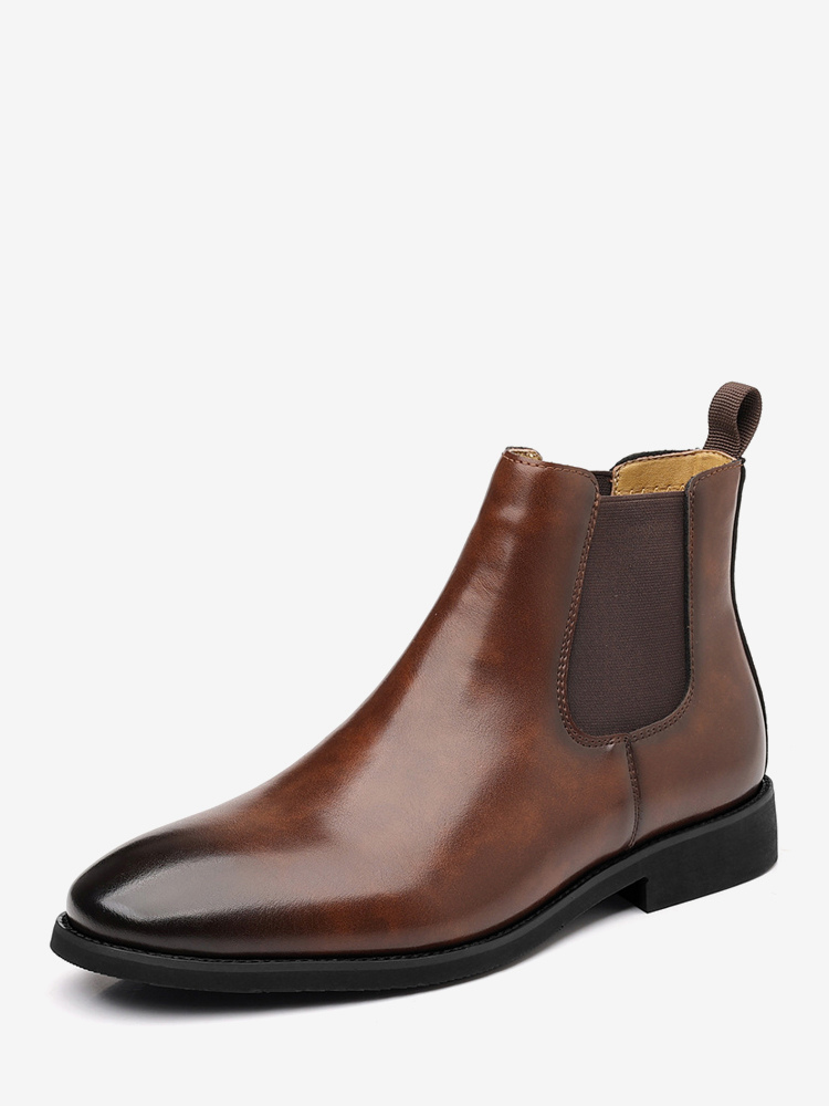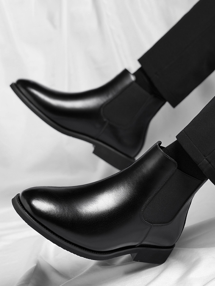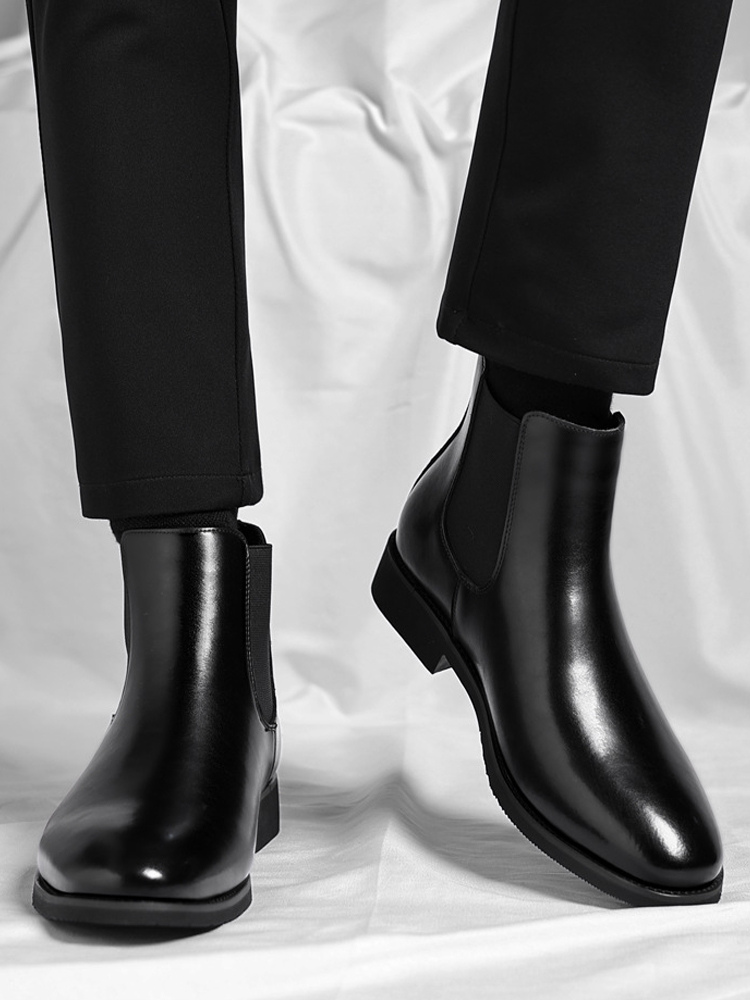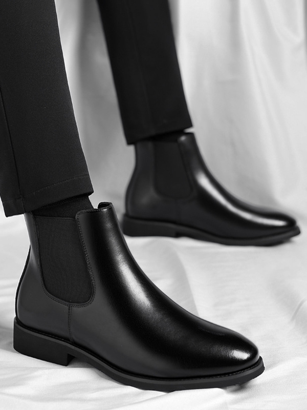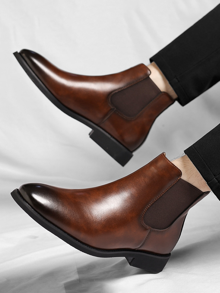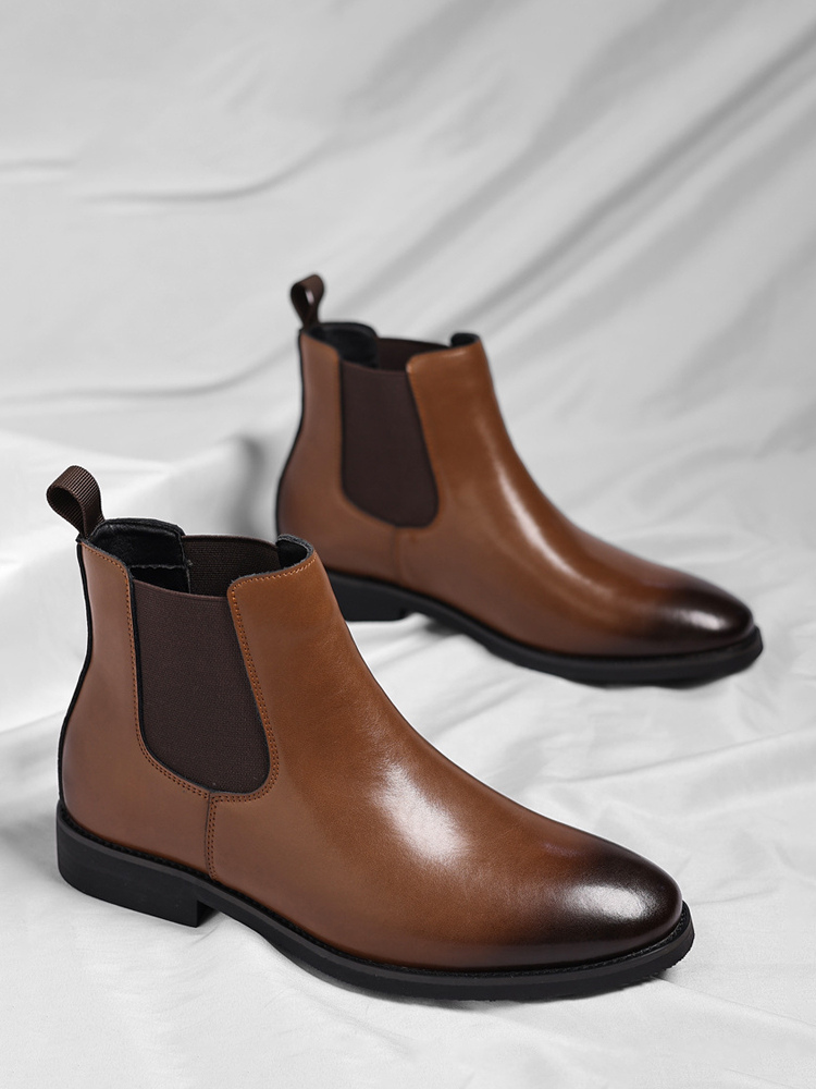 These men's Chelsea boots feature a sleek pointed toe and low heel, accented with a modern gradient color tip for a refined yet contemporary ankle boot design.