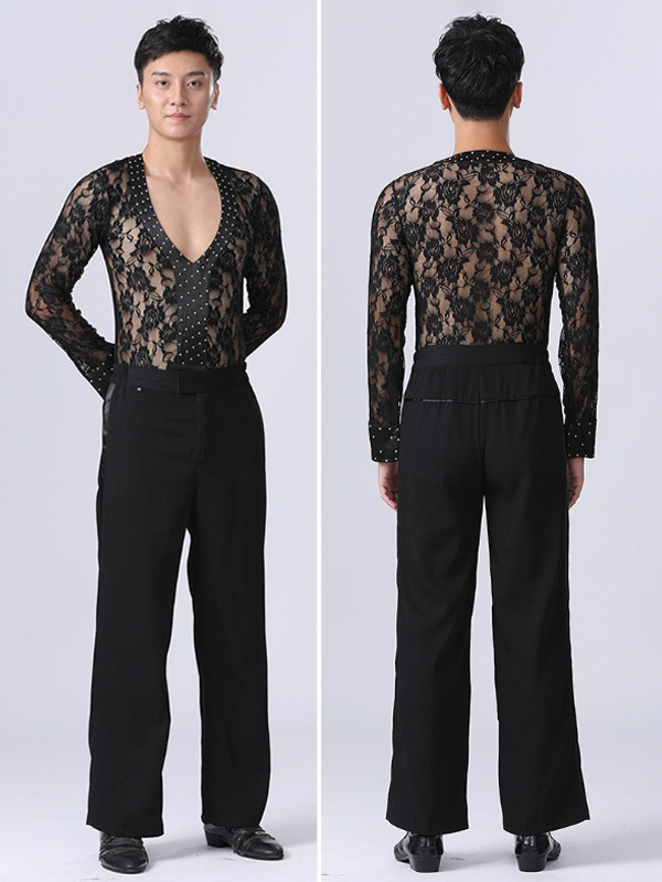 Product Description: Command attention on the dance floor with this Men's Latin Dance Shirt, a daring lace mesh ballroom performance costume that blends bold style with functional design! Crafted from stretch mesh panels (85% polyester/15% spandex) and contrast satin trim, this shirt offers strategic breathability for intense routines while the ornital lace detailing adds sensual drama. The slim-fit cut enhances muscle definition, with reinforced shoulder seams for partner work and lifts. Features a deep V-neckline with snap-button closure for quick changes, and elastic cuffs to keep sleeves in place during spins. Perfect for Latin competitions, cabaret shows, or theatrical performances where visual impact matters—pair with sequin pants or matador-inspired costumes for maximum stage presence!