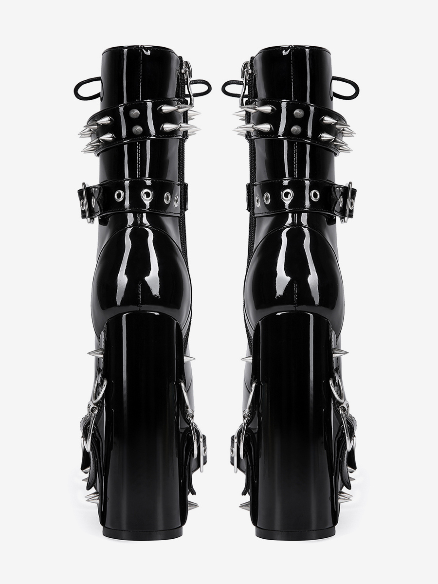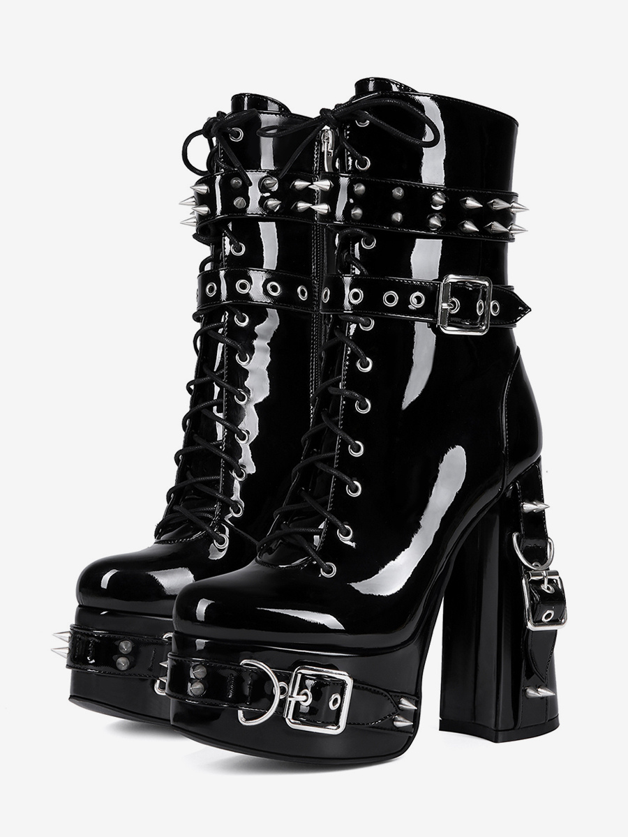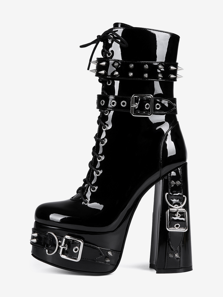 Crafted from high-gloss black patent leather, these men's ankle boots combine a lace-up design with button fastenings and a platform heel, creating a provocative fusion of classic tailoring and bold elevation.