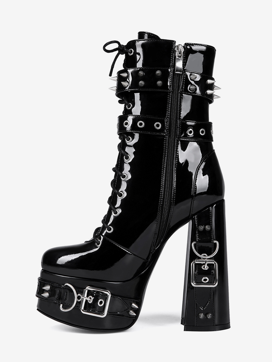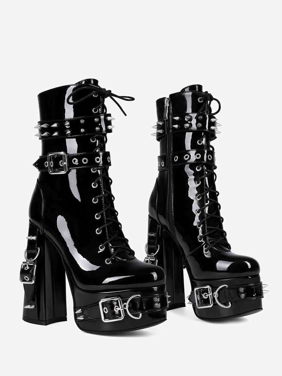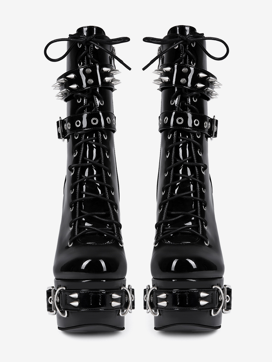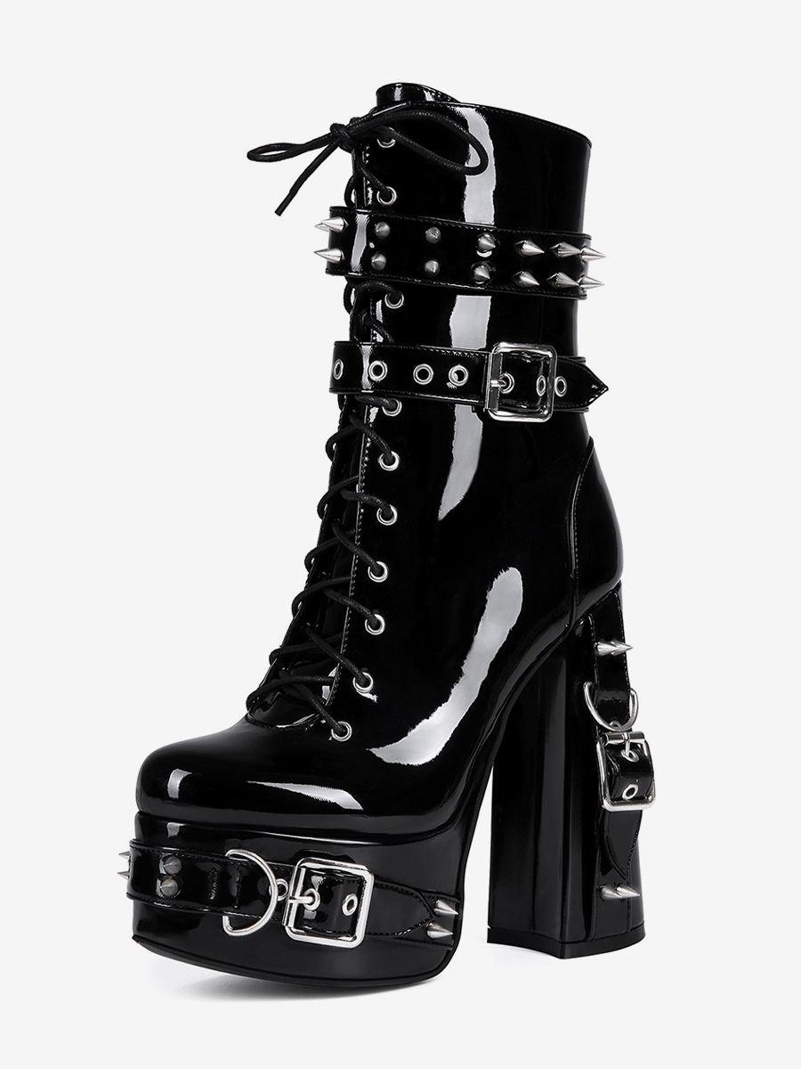 Crafted from high-gloss black patent leather, these men's ankle boots combine a lace-up design with button fastenings and a platform heel, creating a provocative fusion of classic tailoring and bold elevation.