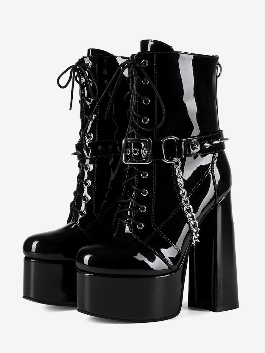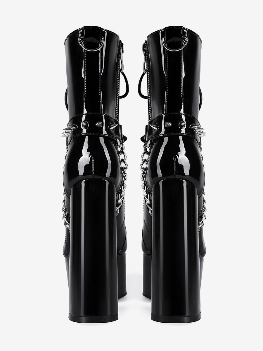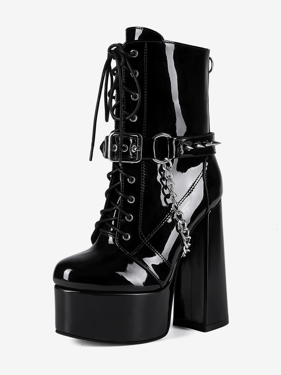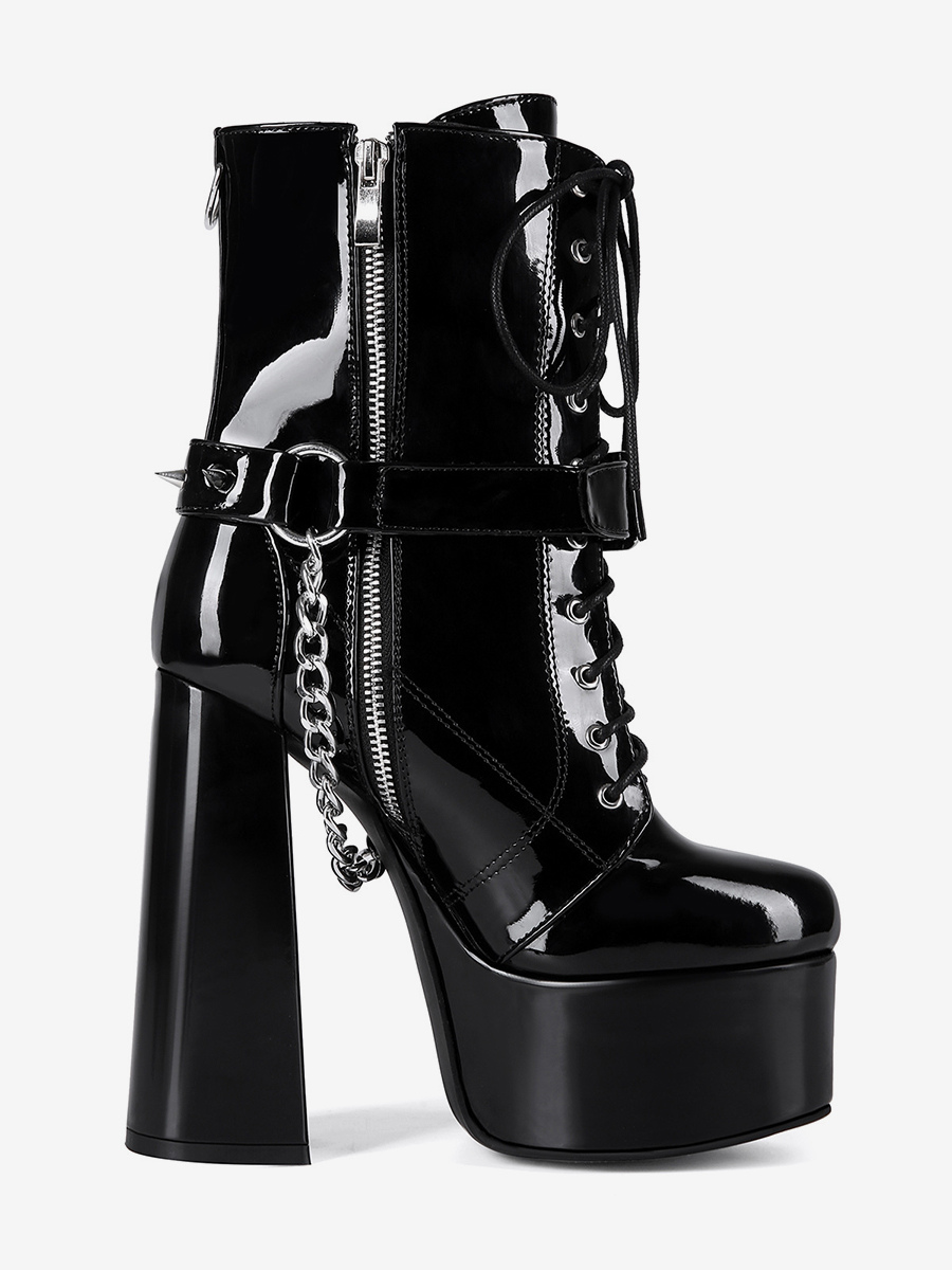 Crafted from high-gloss black patent leather, these men's ankle boots feature a lace-up design with edgy chain details and a platform heel, blending rebellious aesthetics with elevated sophistication.
