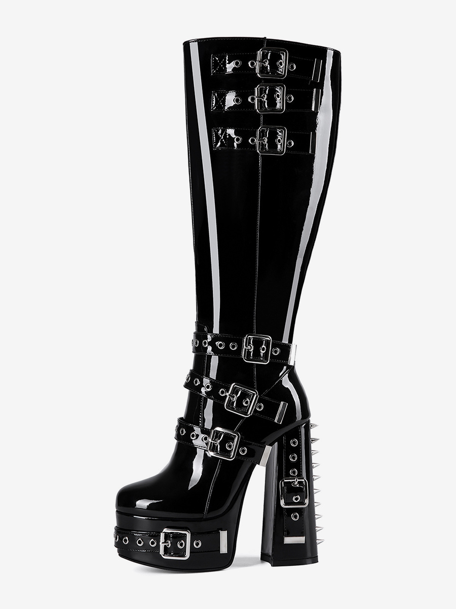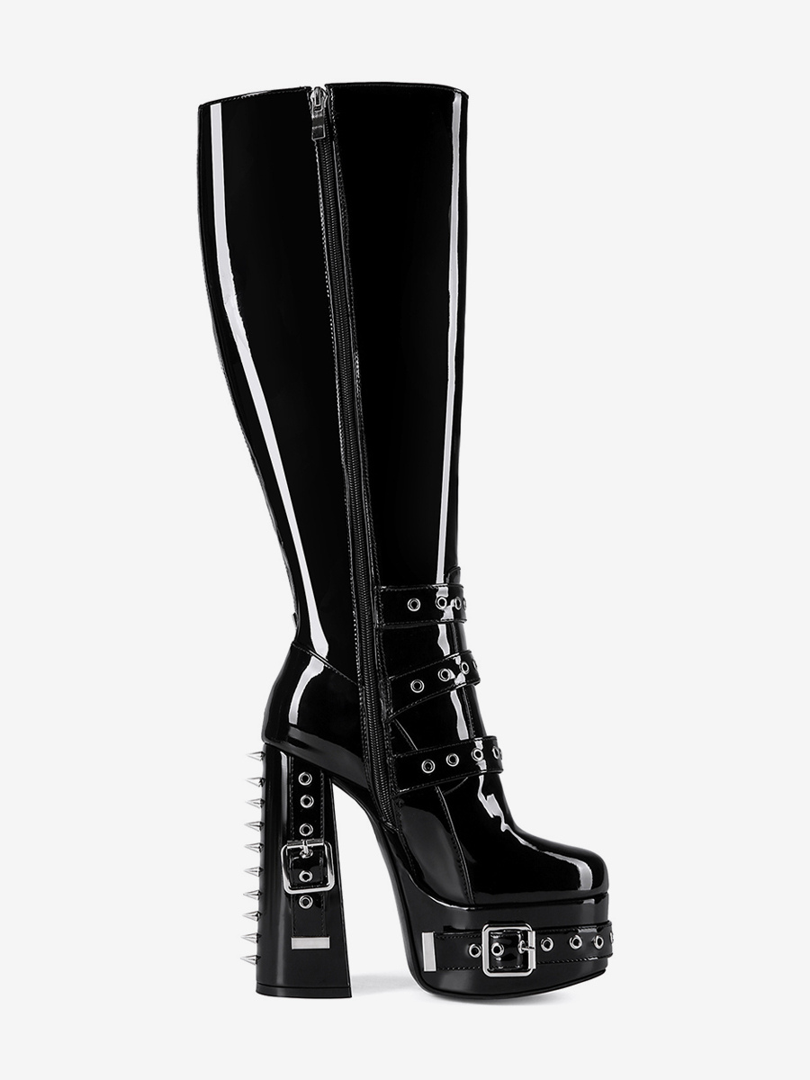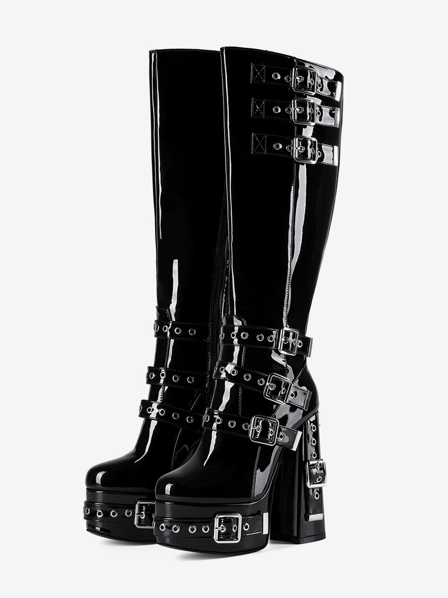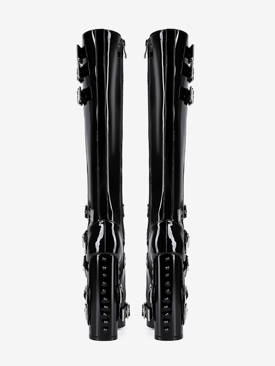 Crafted from high-gloss black patent leather, these men's knee-high boots feature a platform heel and bold metal buckle details, creating a striking silhouette that blends rebellious edge with elevated sophistication.