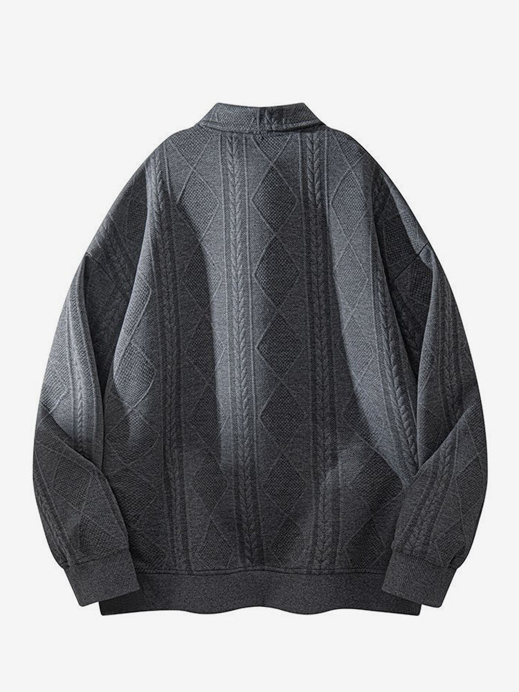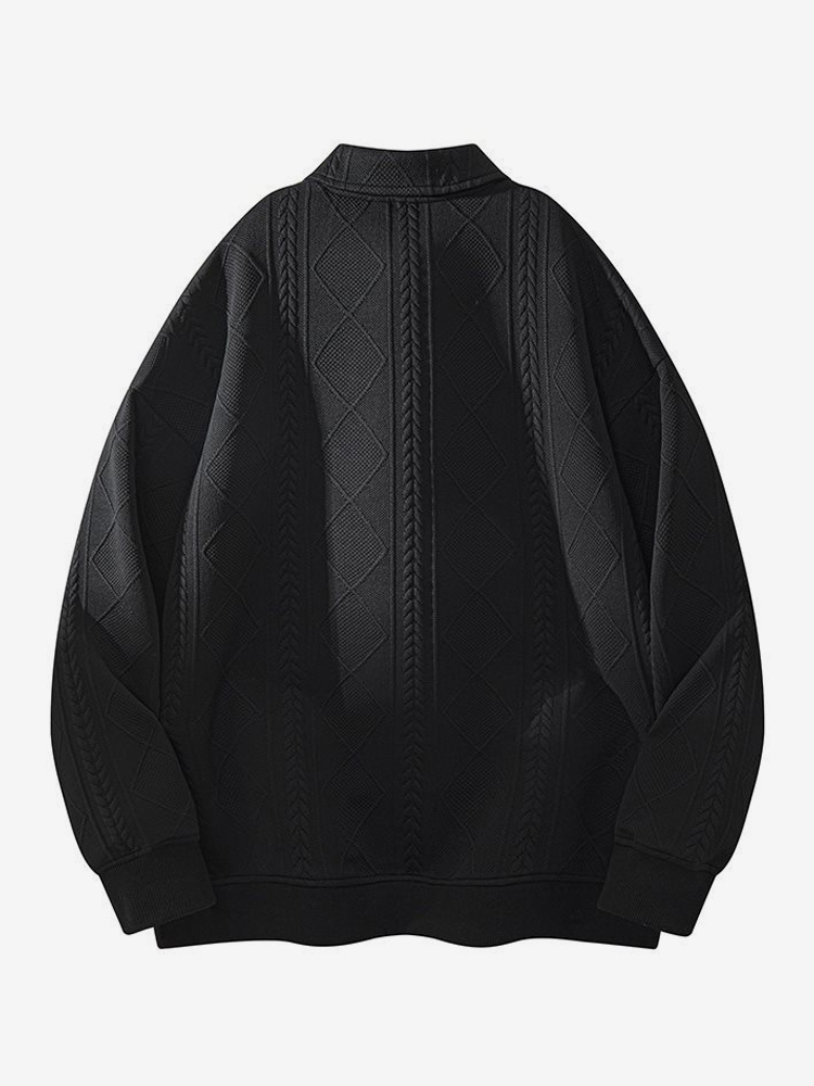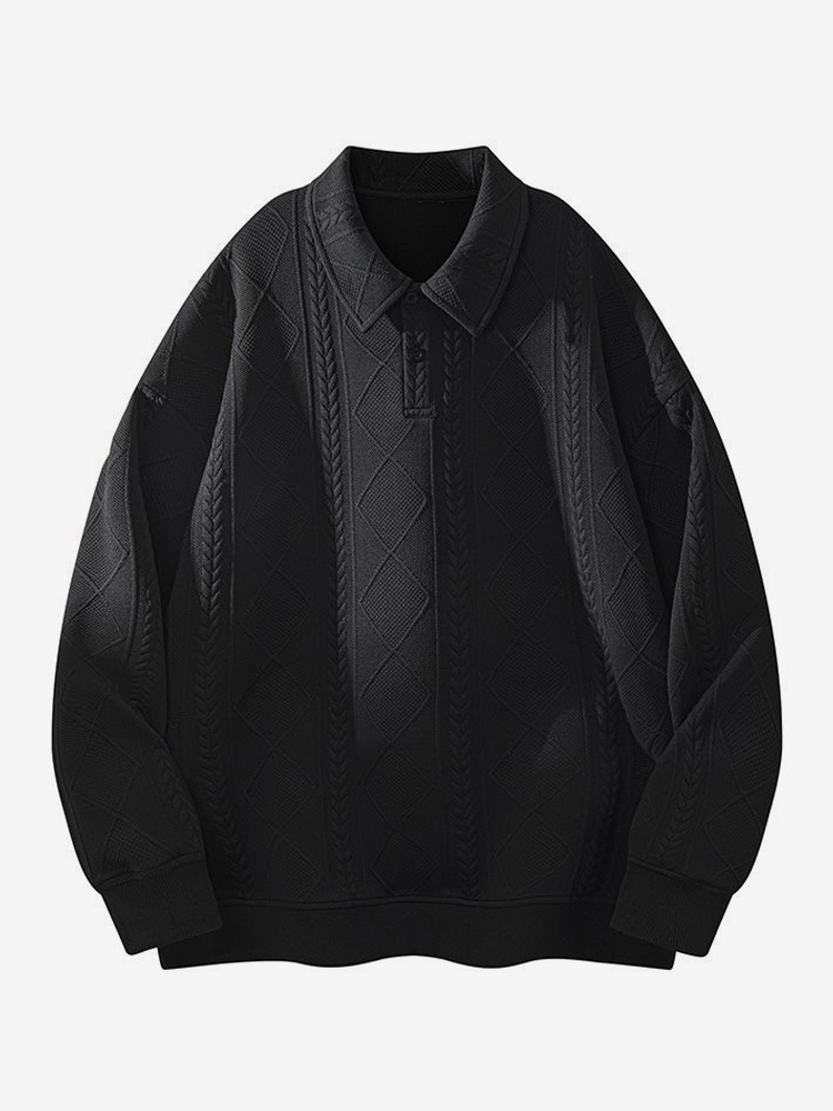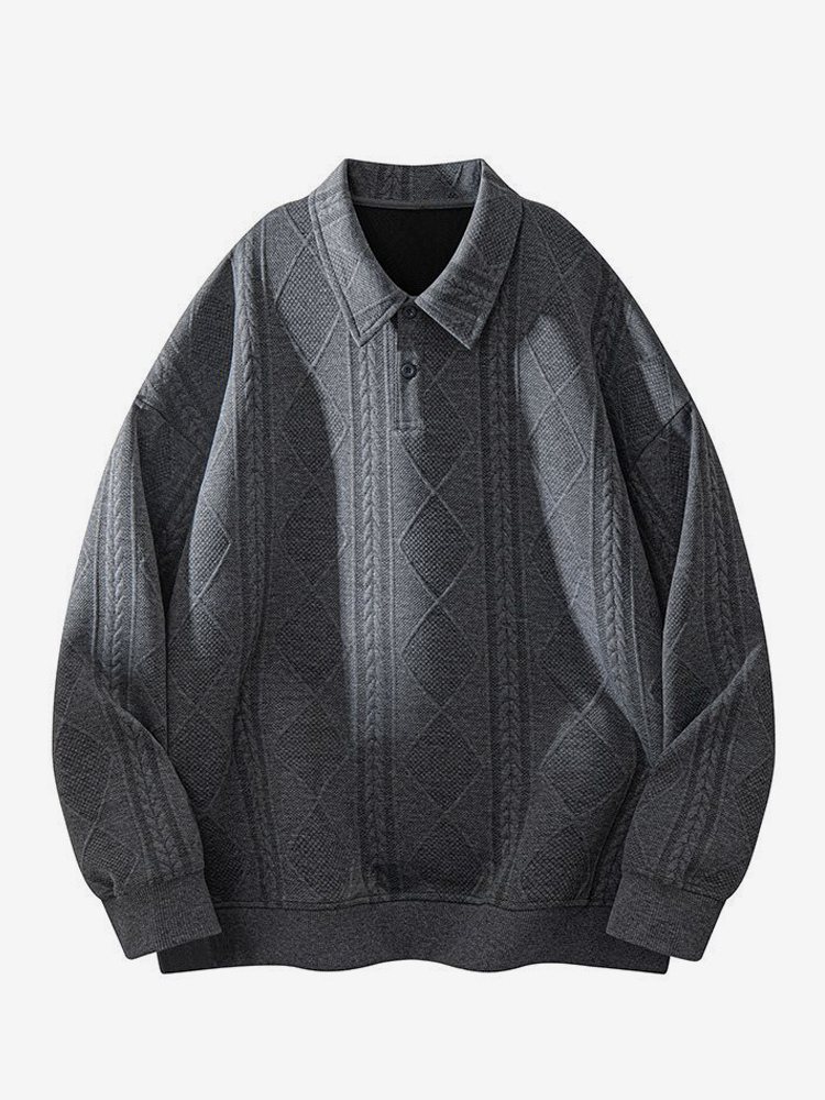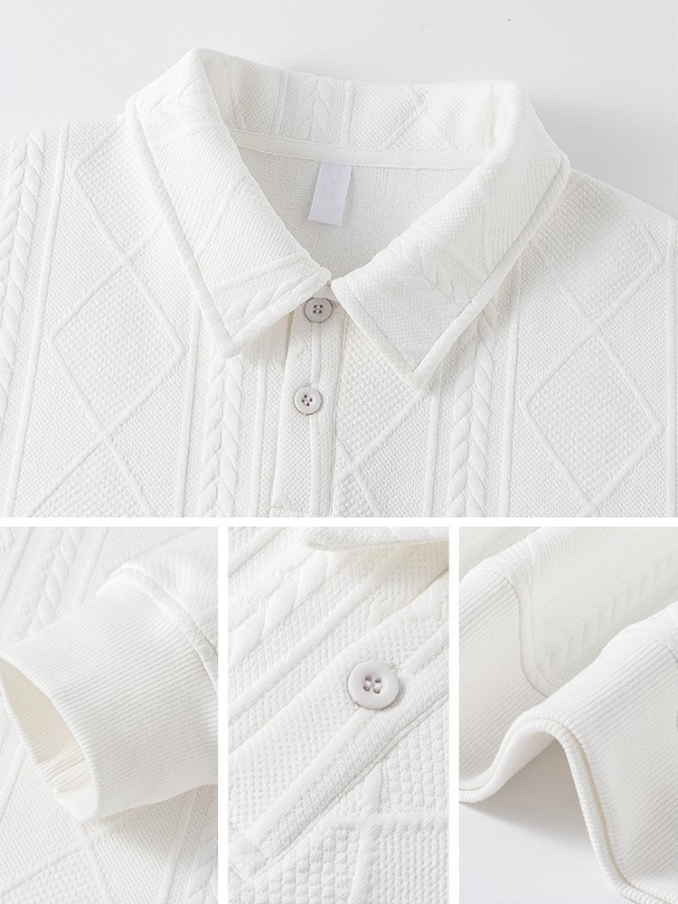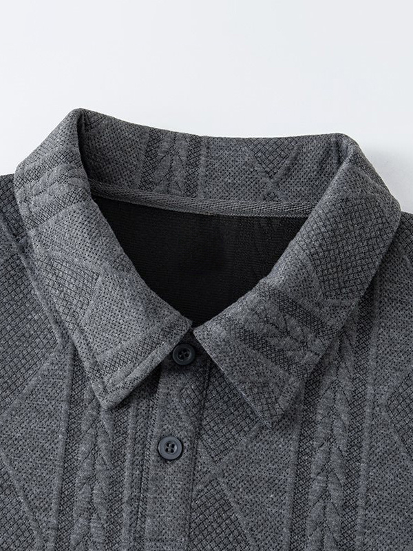 メンズ テクスチャード スウェットシャツ ターンダウンカラー 長袖 レトロスタイル ポロジャケット リブ編みの袖口と裾