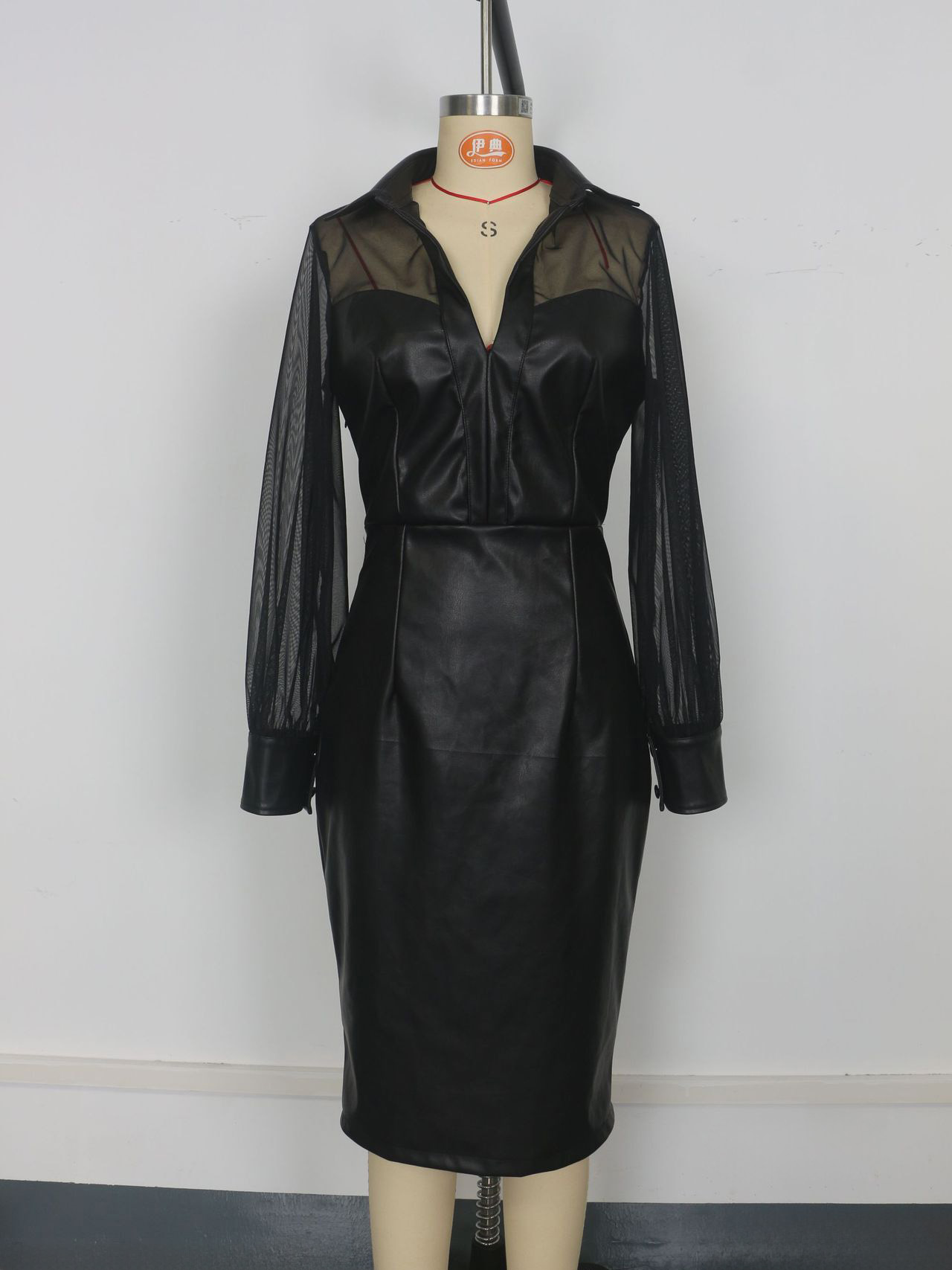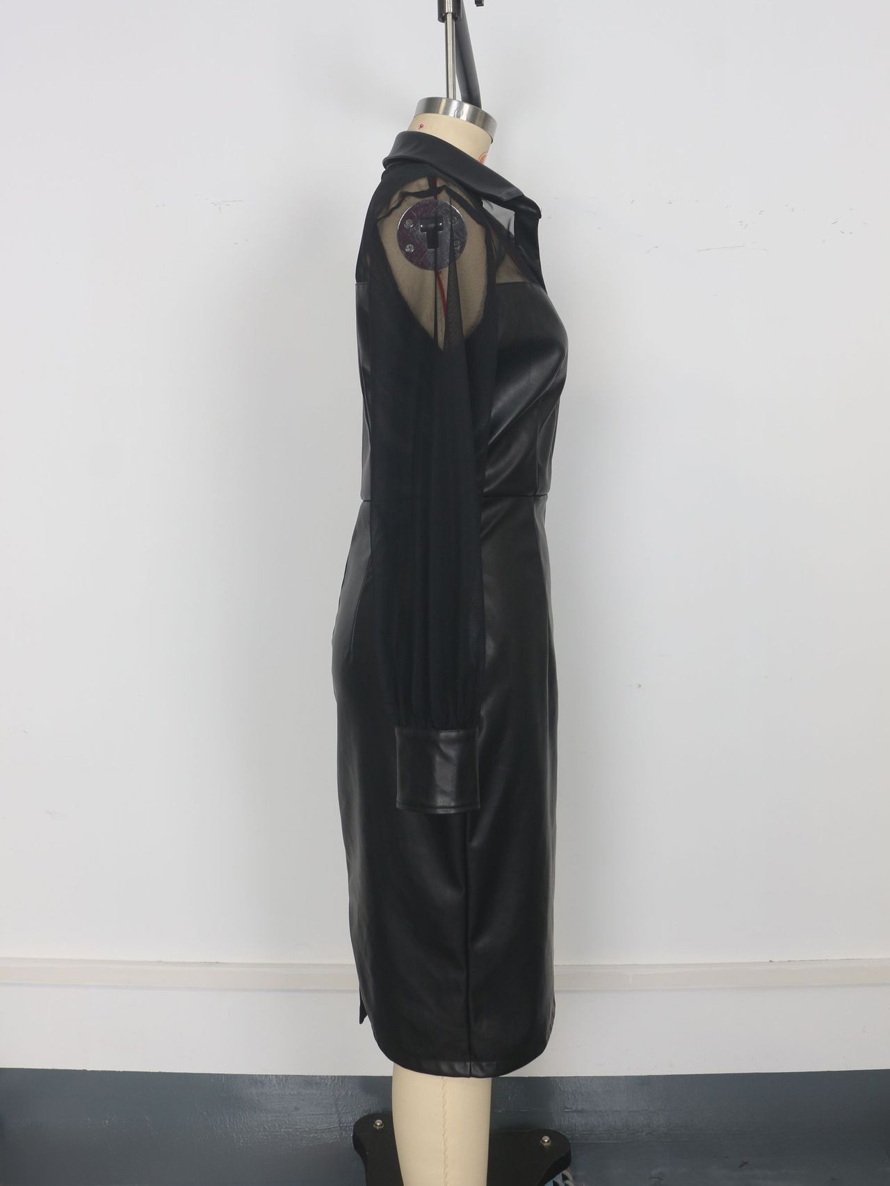 メッシュパッチワーク Vネック フェイクレザー スリムフィット パフスリーブ ミディドレス(ブラック、レディース)2026