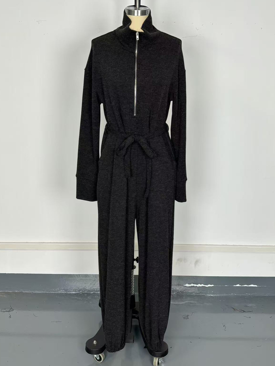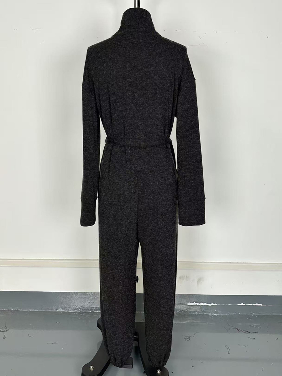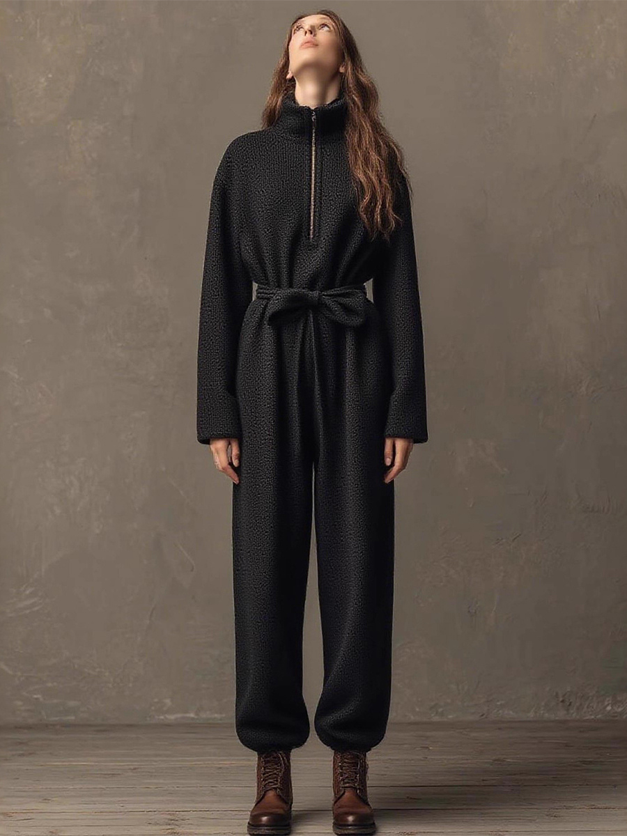 ミニマリストスタイルのブラックジップアップベルト付きジャンプスーツ(レディース)2025