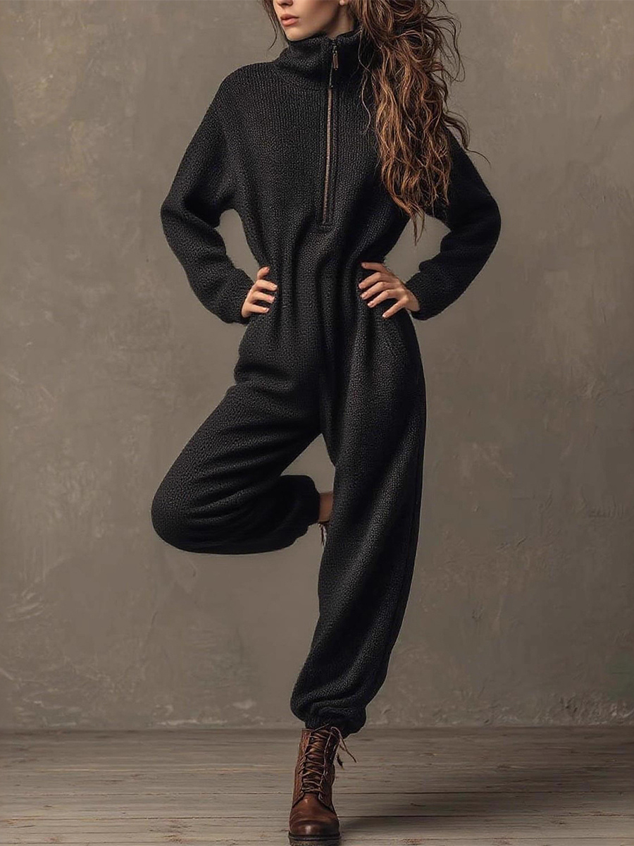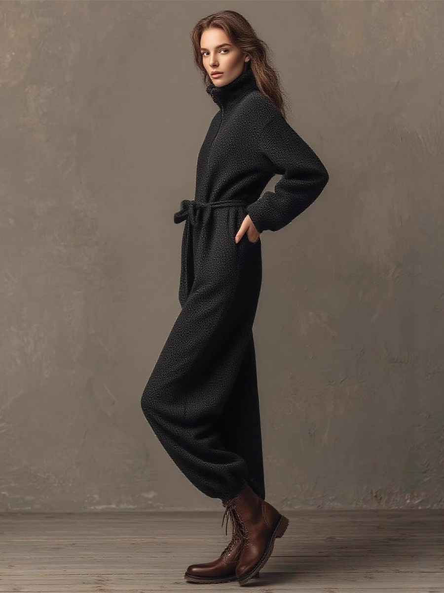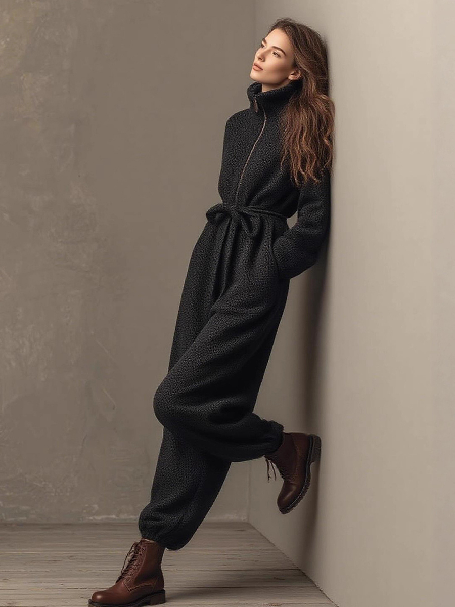 ミニマリストスタイルのブラックジップアップベルト付きジャンプスーツ(レディース)2025