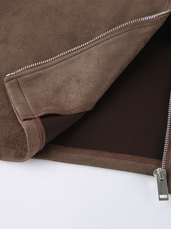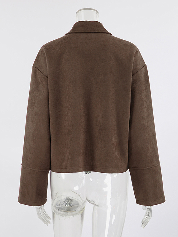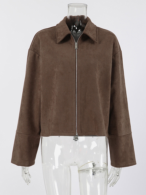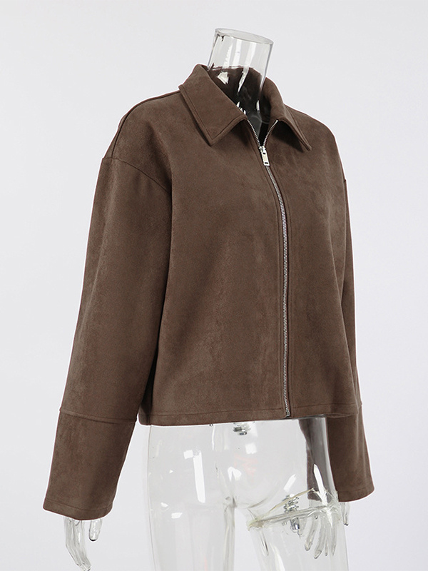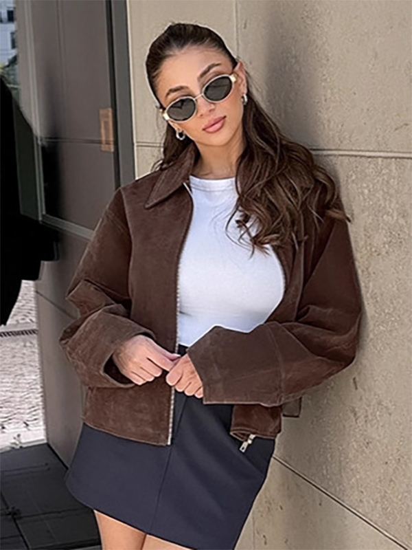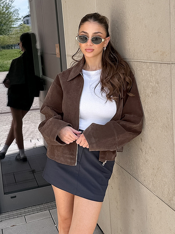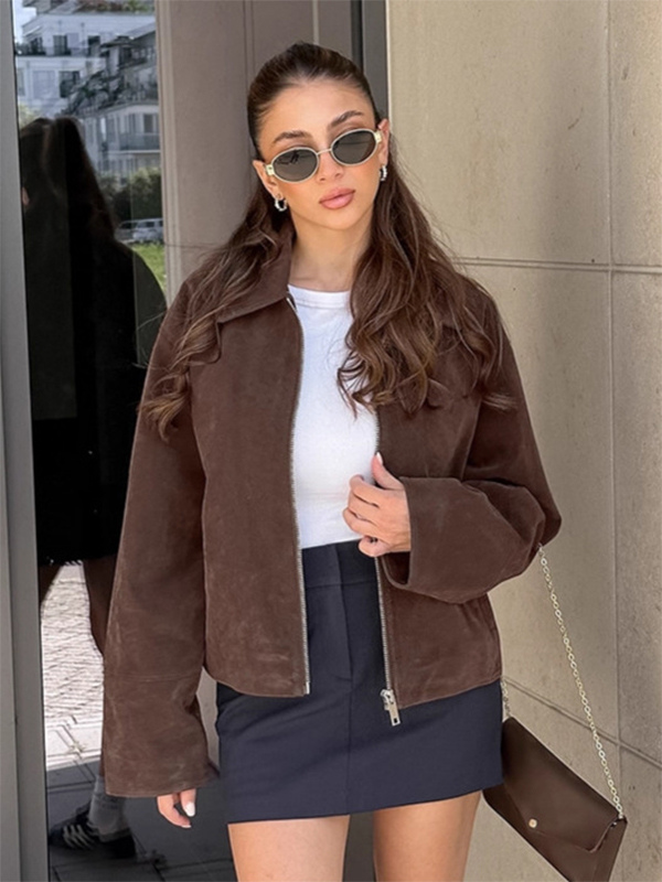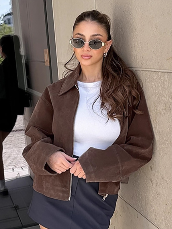 モカスエード レディース クロップドジャケット - ミニマルなジップアップ ポロカラー ボックスフィット - ストリートカジュアル 春のデイリーコーディネート 2026