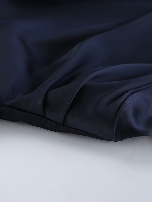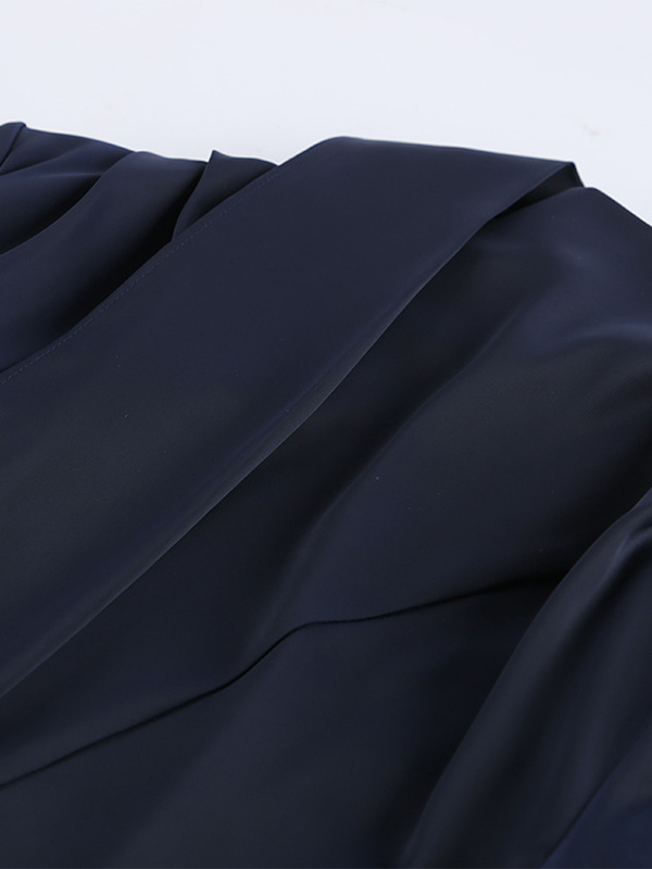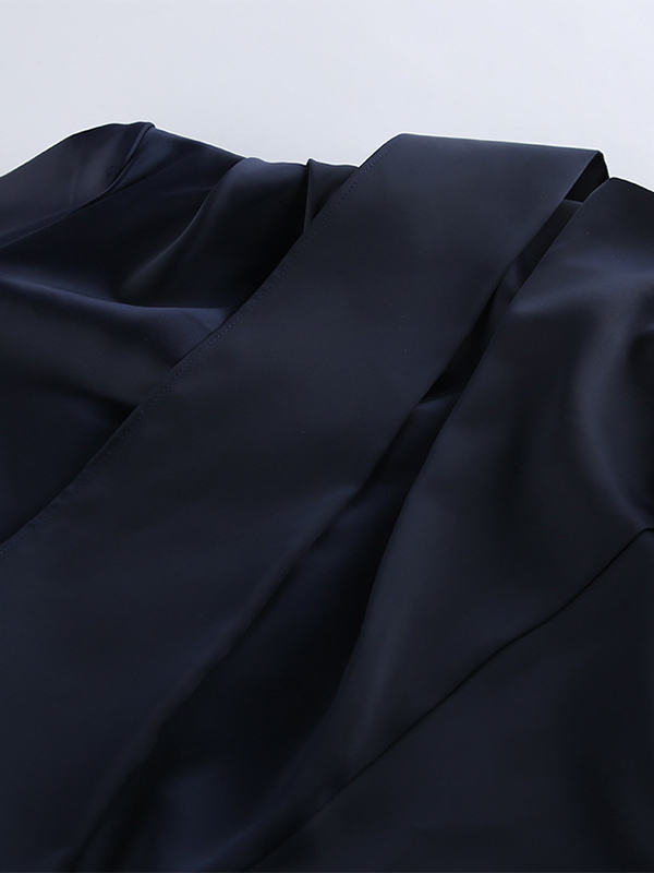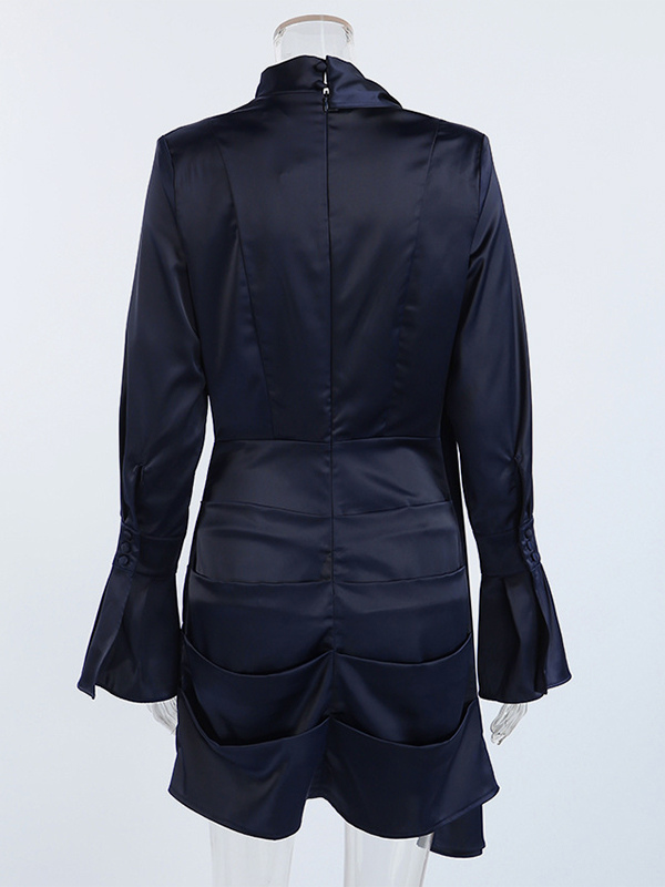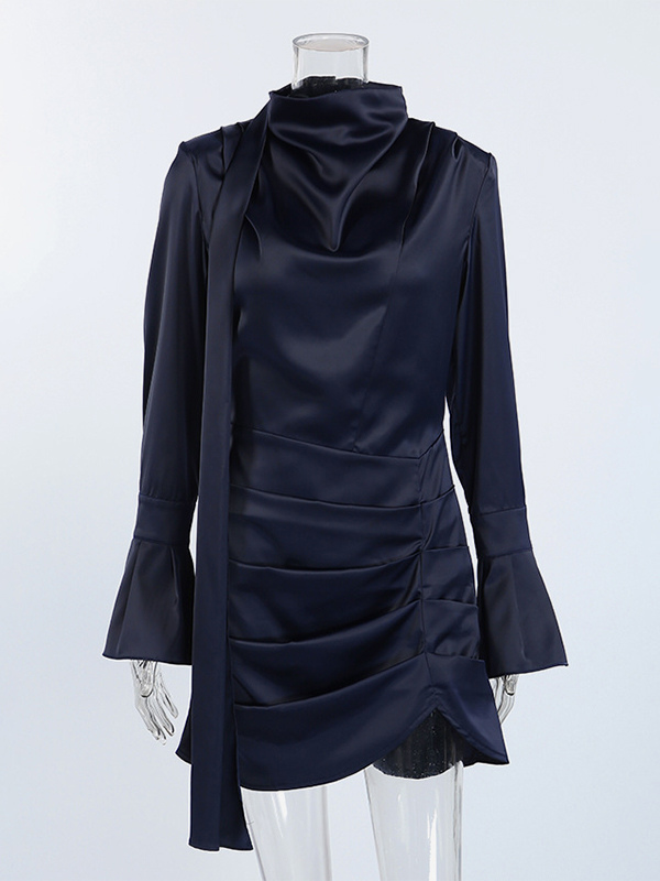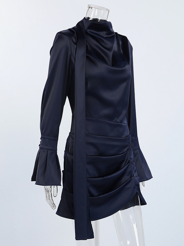 ネイビーブルーのサテンミニドレス(レディース) - エレガントなギャザー入りスタンドカラー、フレアスリーブ - 2026年春のカクテルパーティーに最適