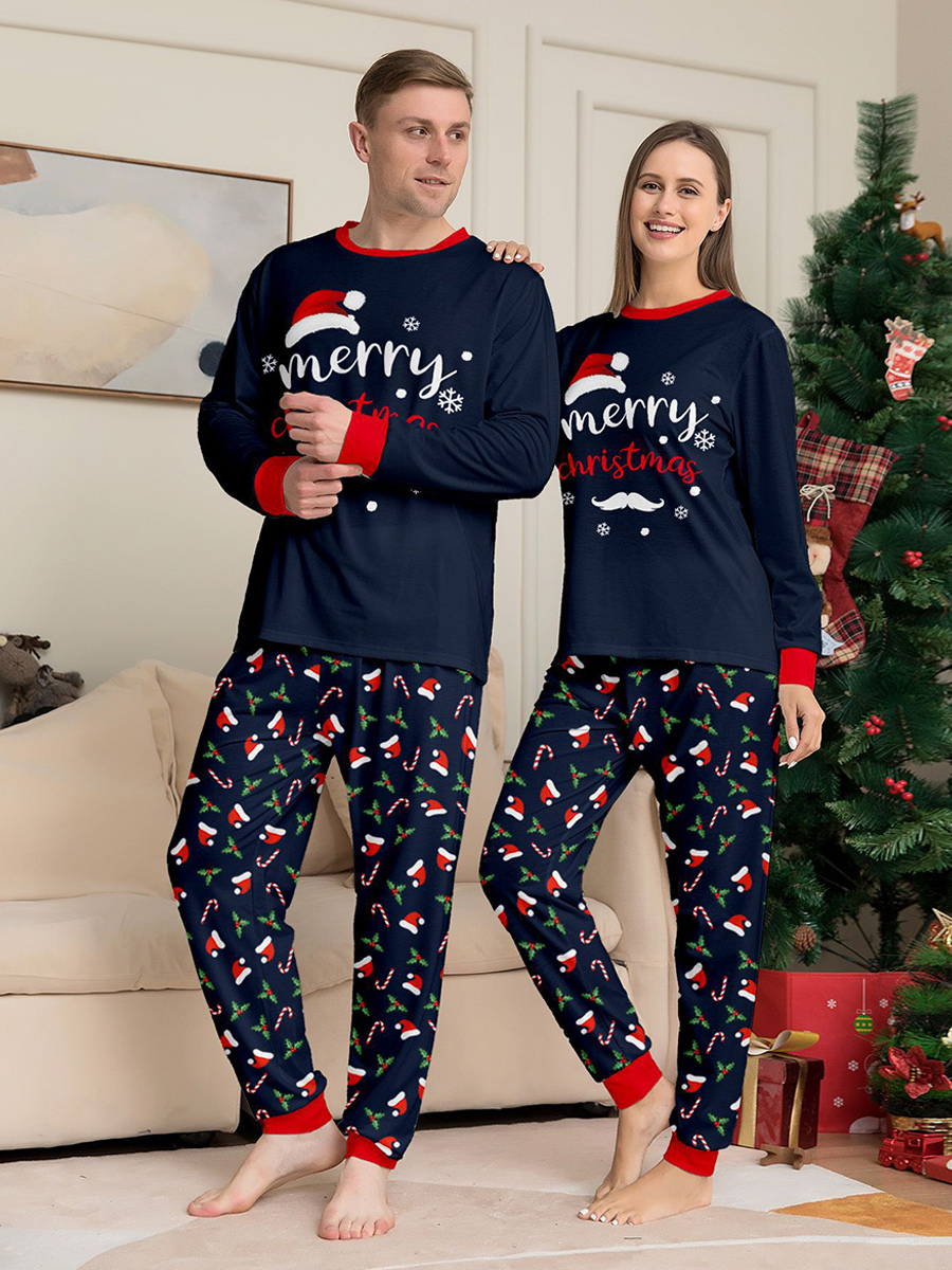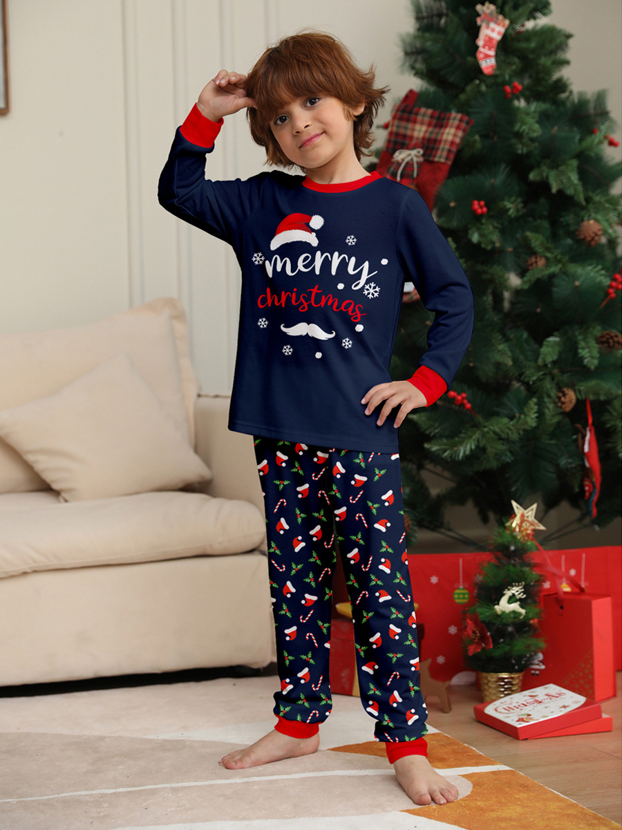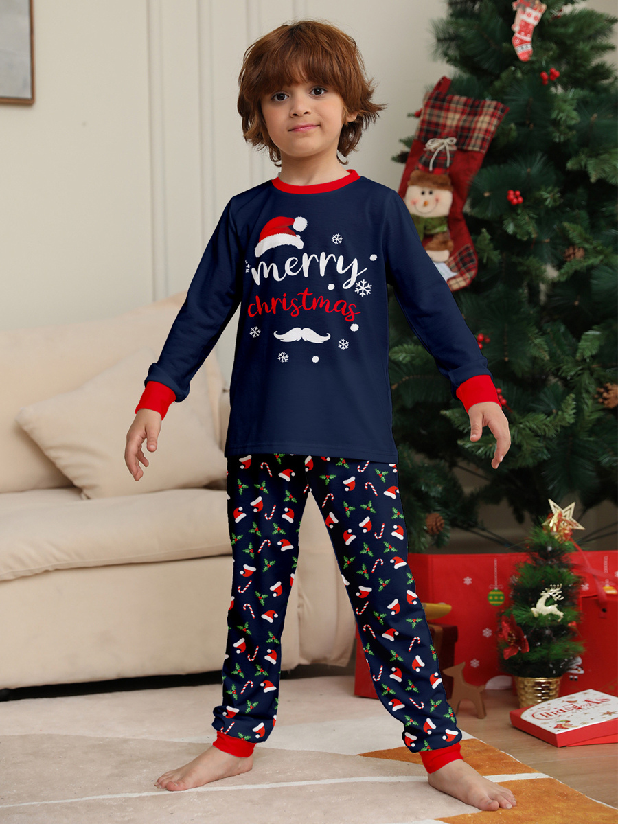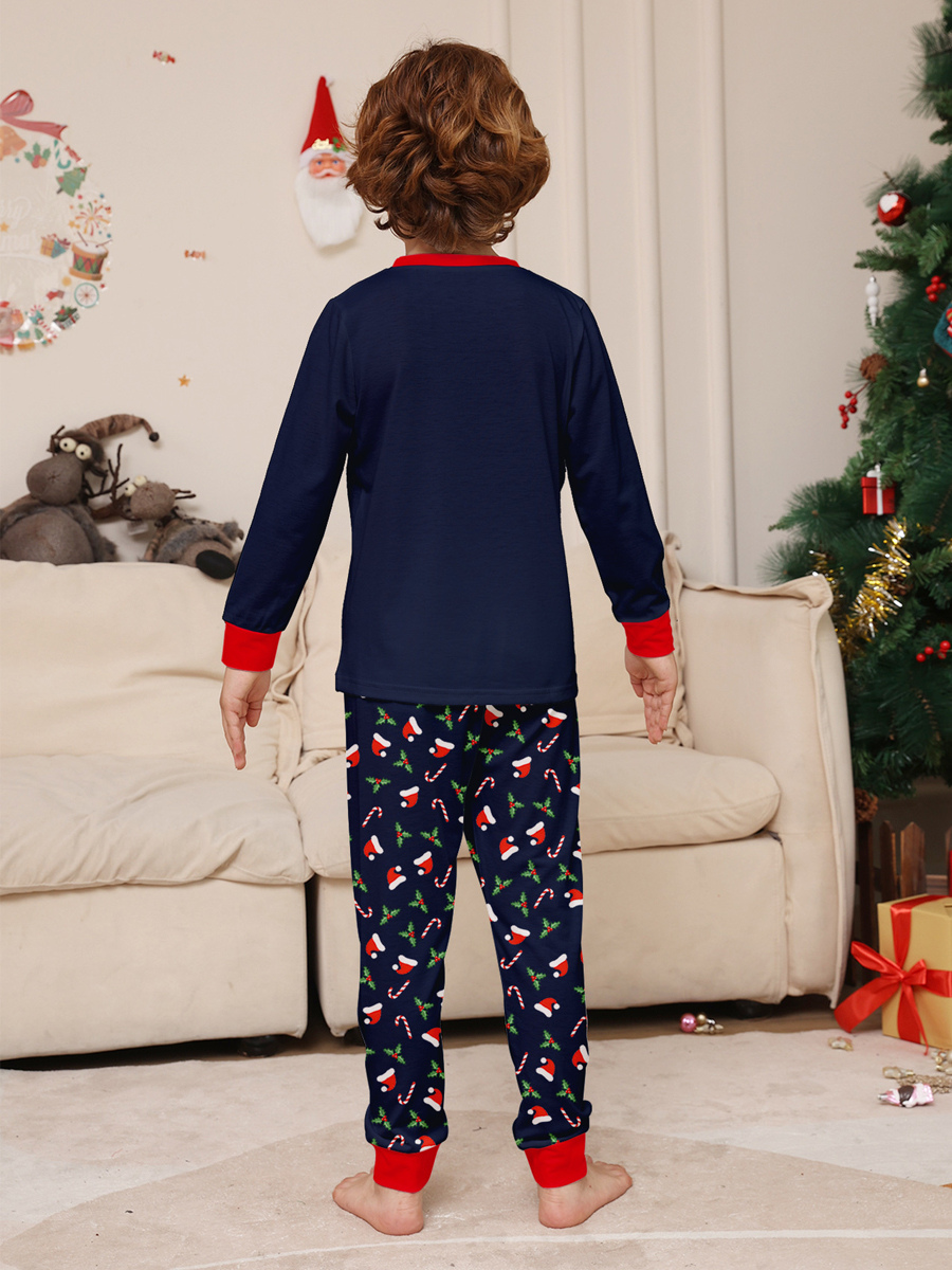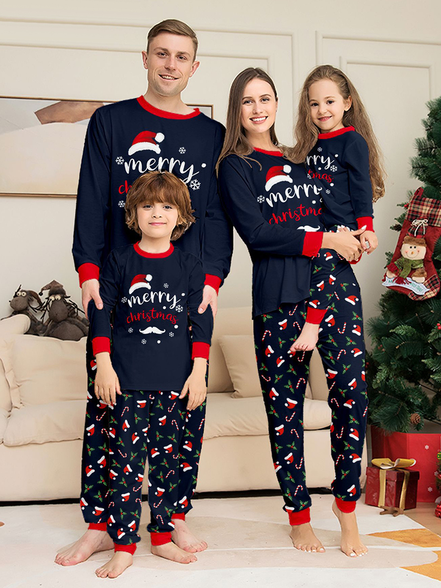 ネイビーレッドのメリークリスマスファミリーパジャマ、キャンディケインプリント、2025
