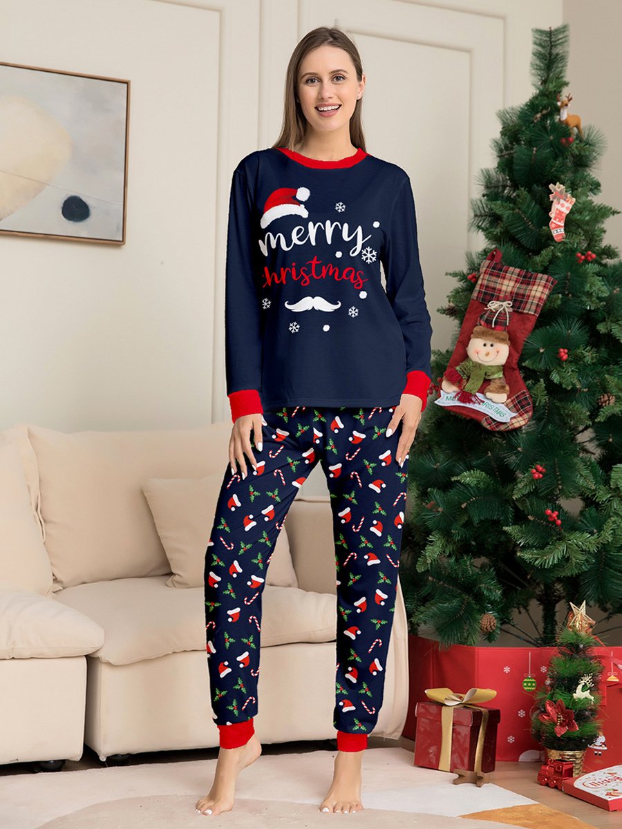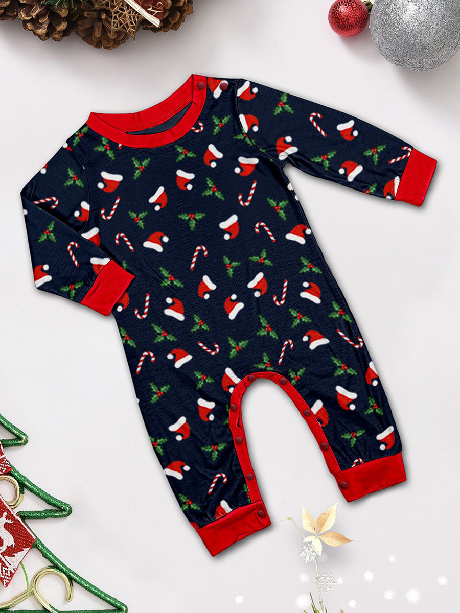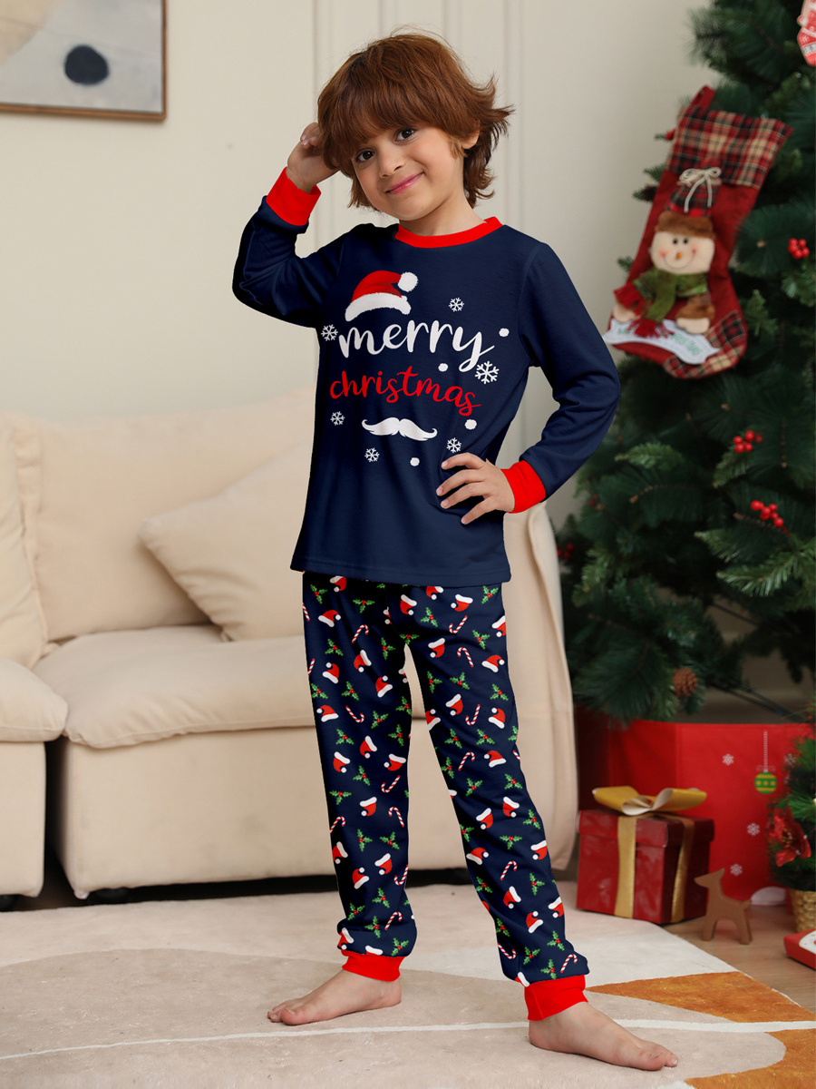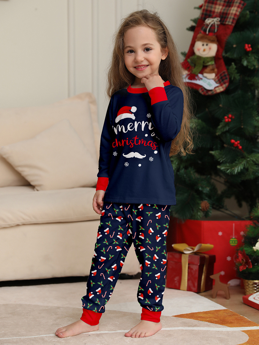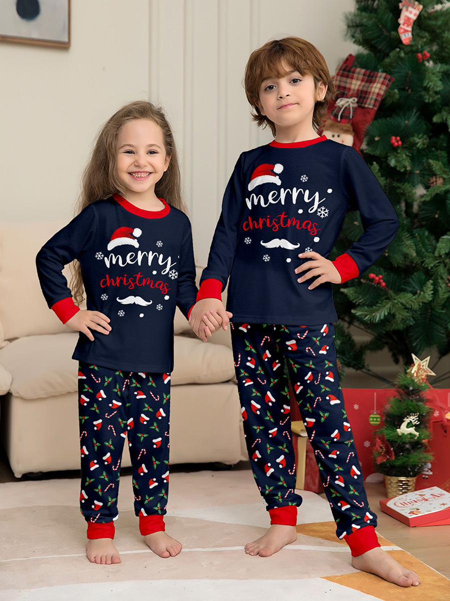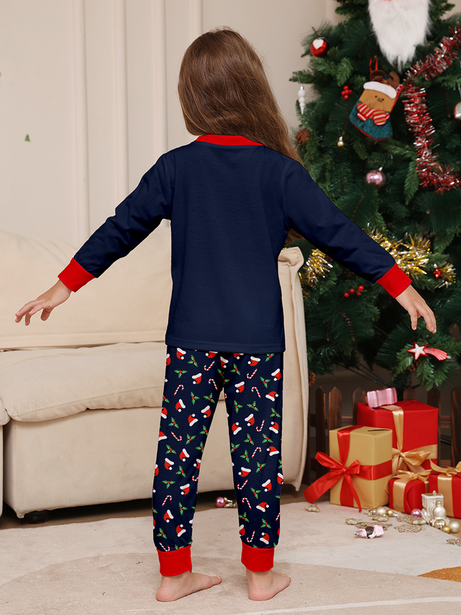 ネイビーレッドのメリークリスマスファミリーパジャマ、キャンディケインプリント、2025