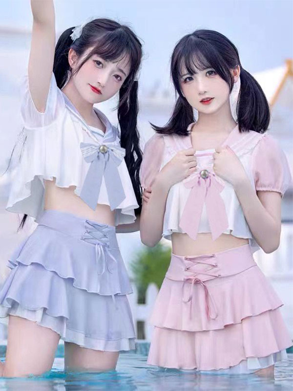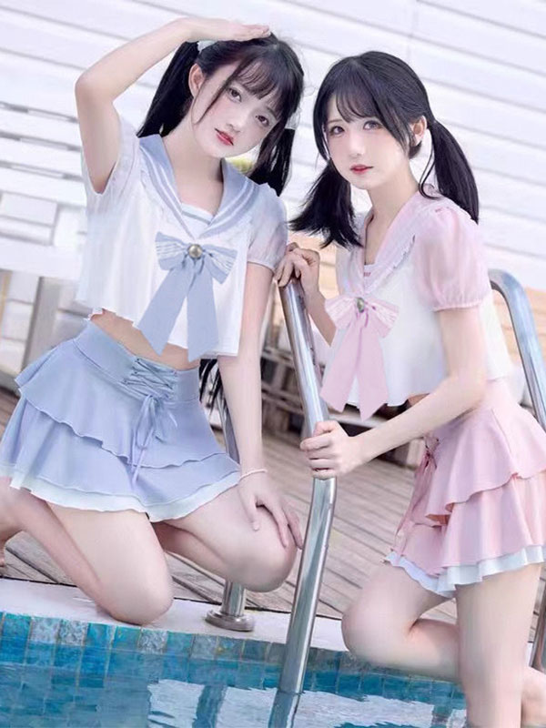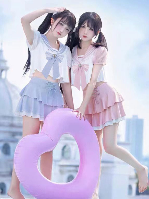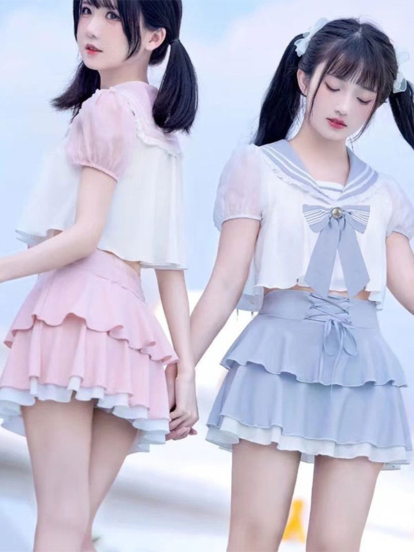 ネイビースタイルのロリータ衣装 ライトスカイブルー リボン レースアップ フリル 半袖 パンツトップ