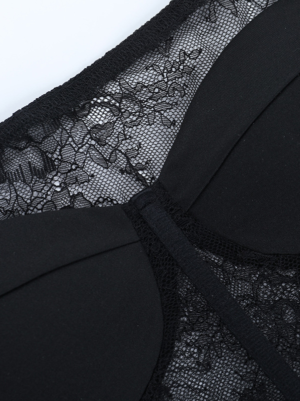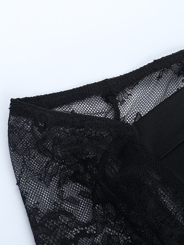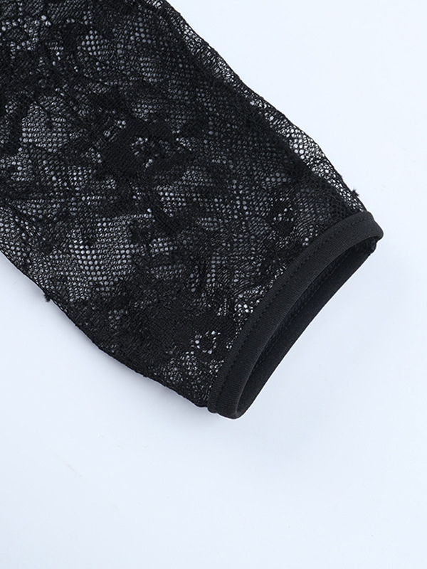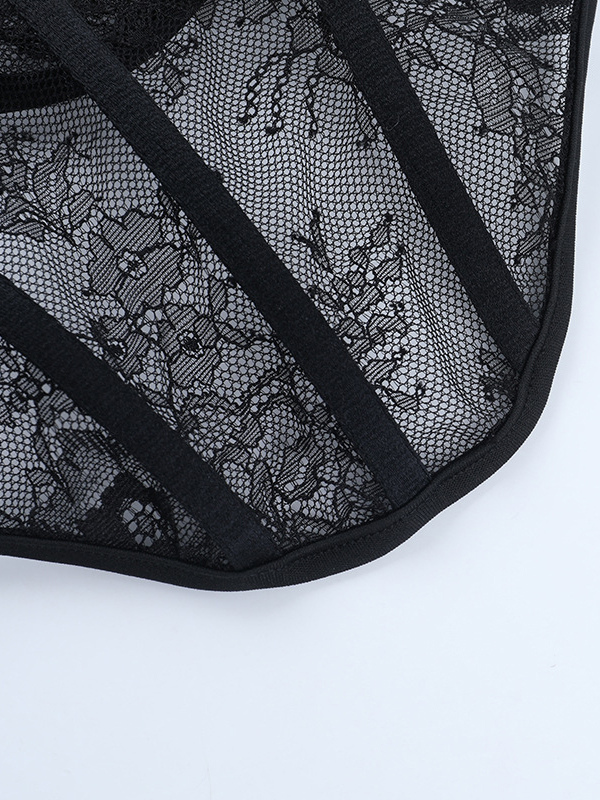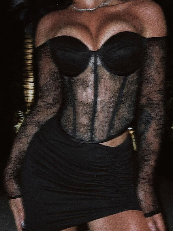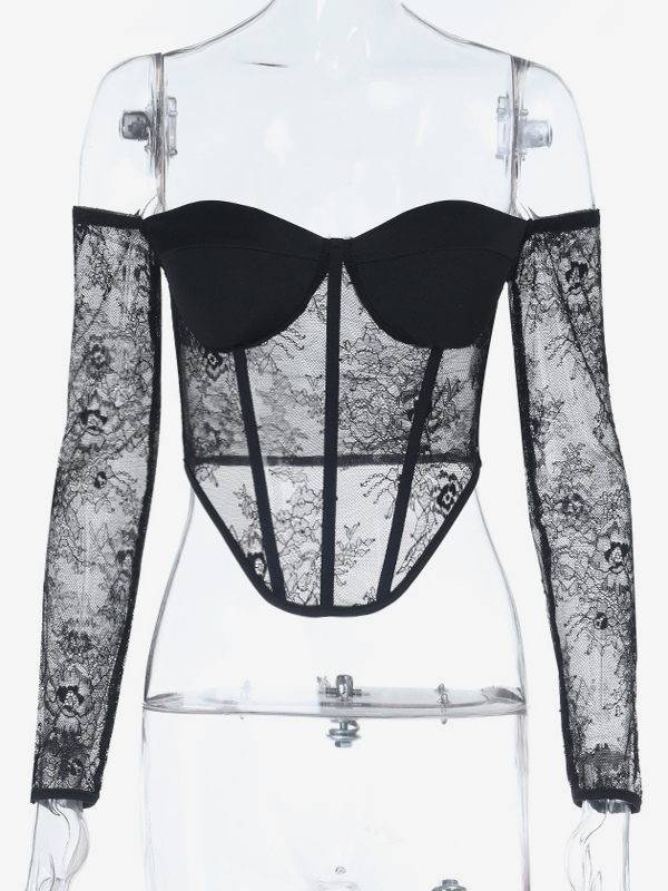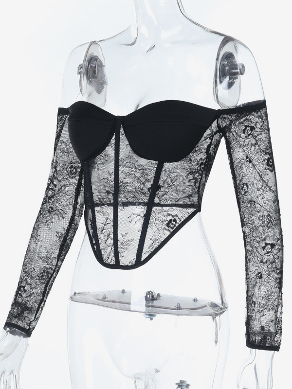 レディース用オフショルダーレースコルセットブラウス - ブラックシースルーメッシュ長袖ビスチェトップ - 春のナイトアウトクラブウェア 2026