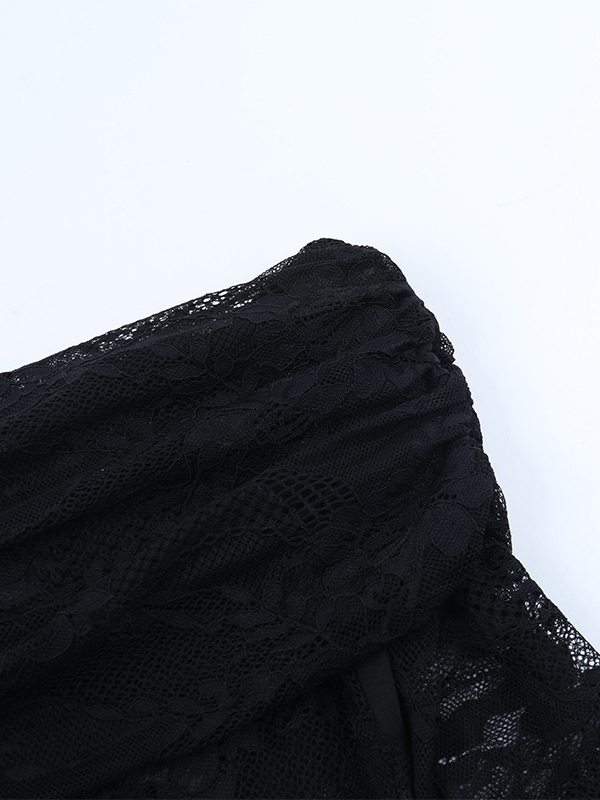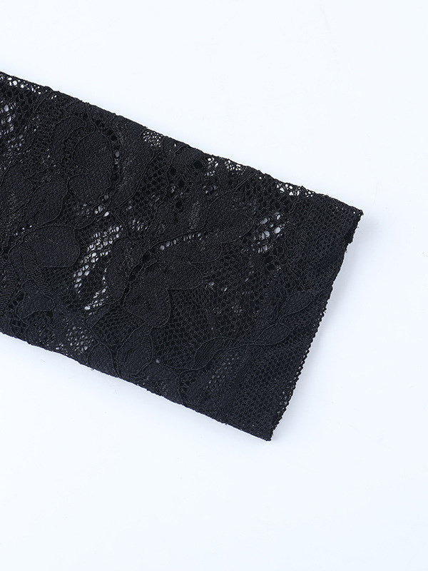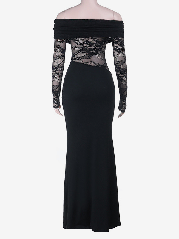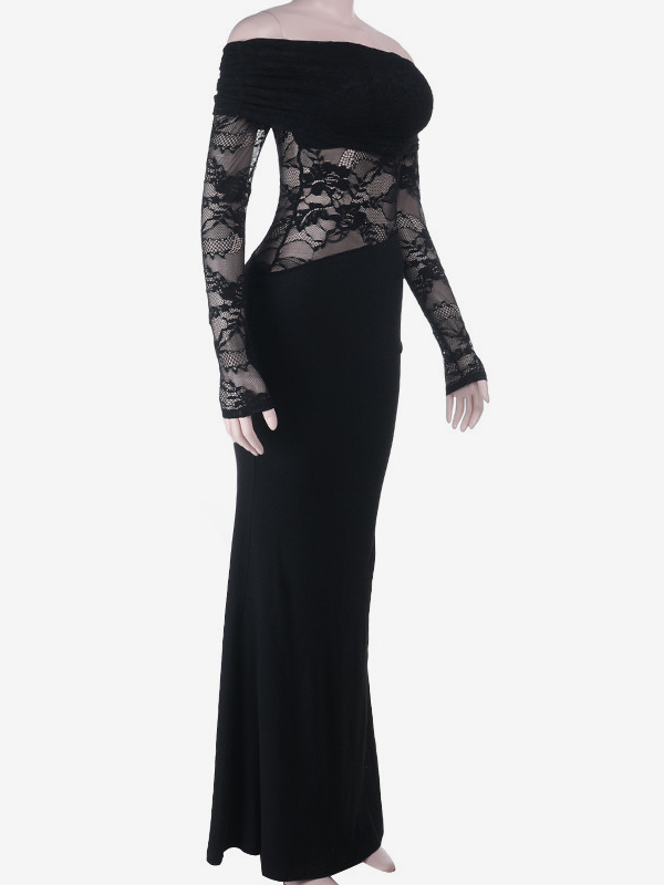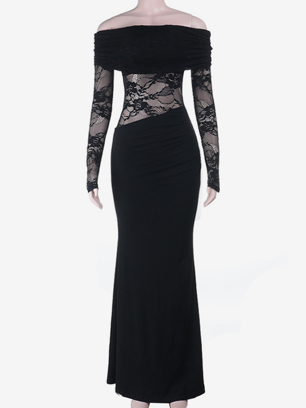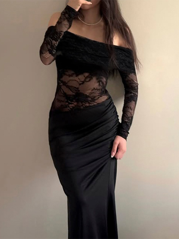オフショルダーレースパッチワークマキシドレス(レディース) - ブラックゴシックシースルー袖ボディコンガウン - 2026年春のガラパーティー衣装
