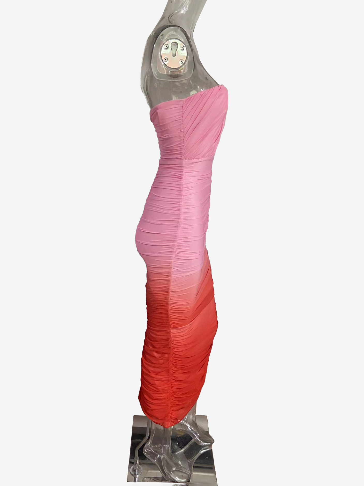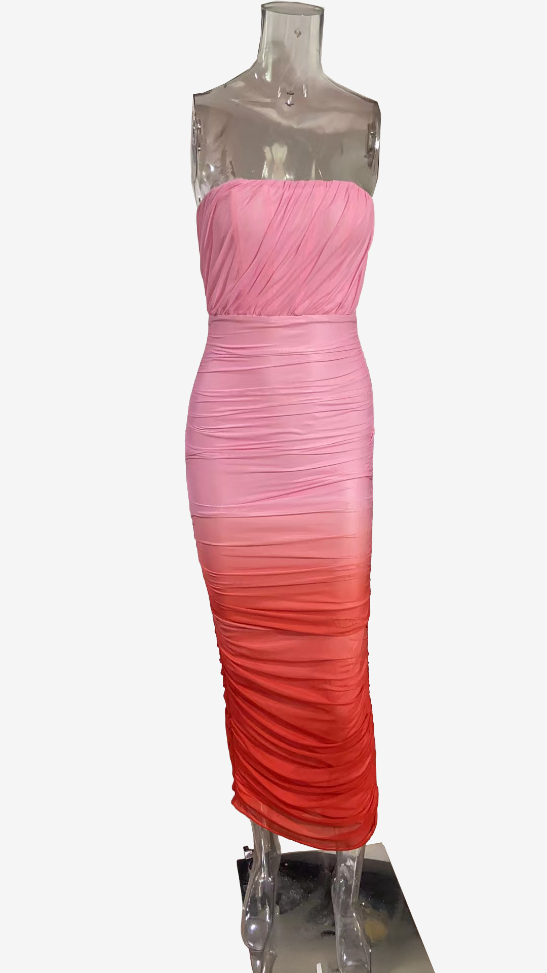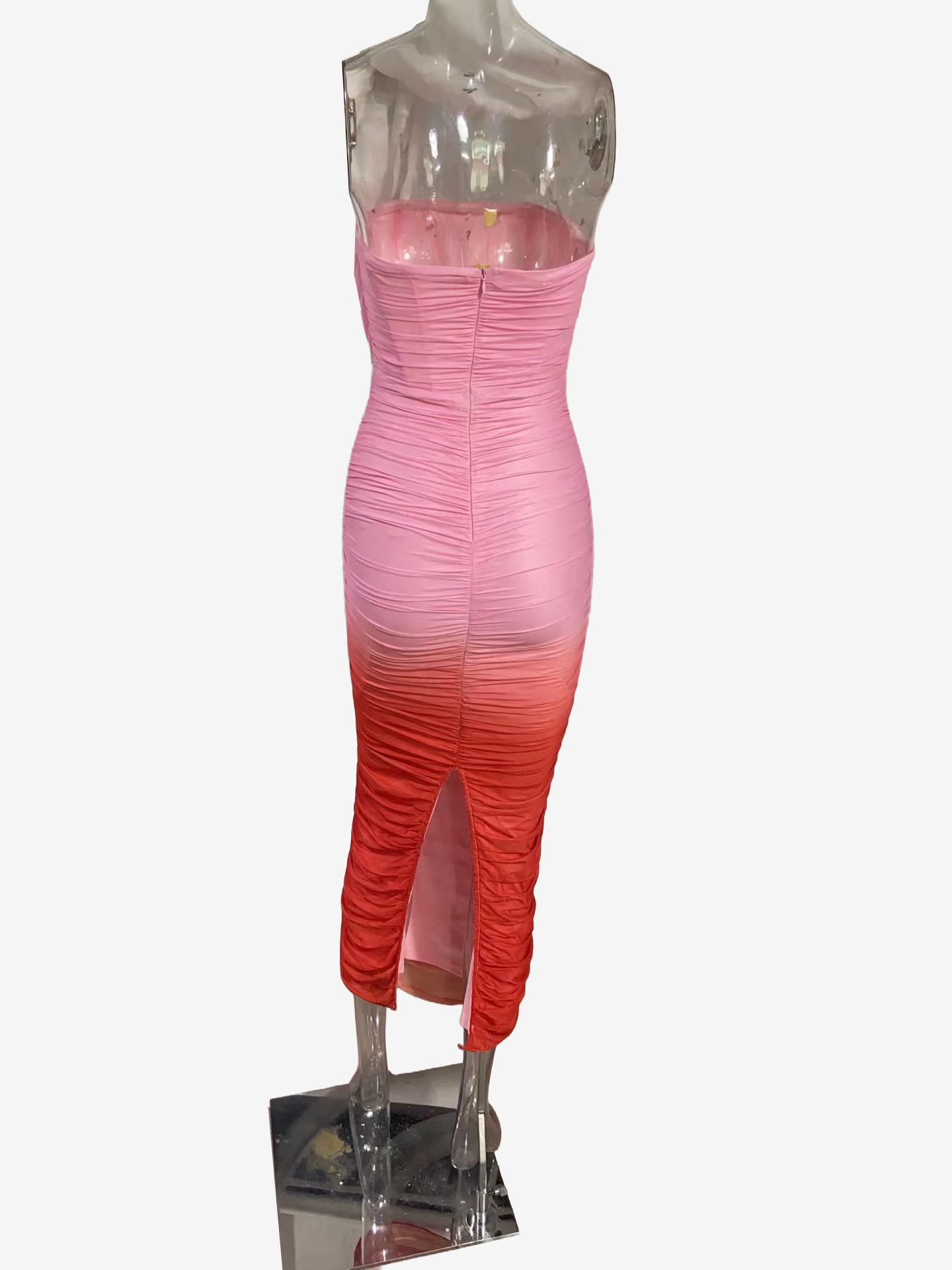 グラデーションカラーのストラップレスマキシドレス(レディース) - ピーチカラーのギャザー入りボディコンチューブドレス(バックスリット付き) - 2026年夏リゾートウェア