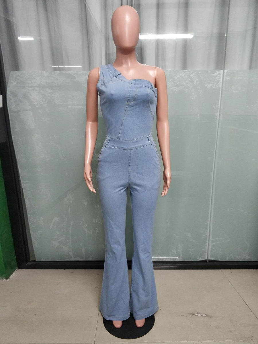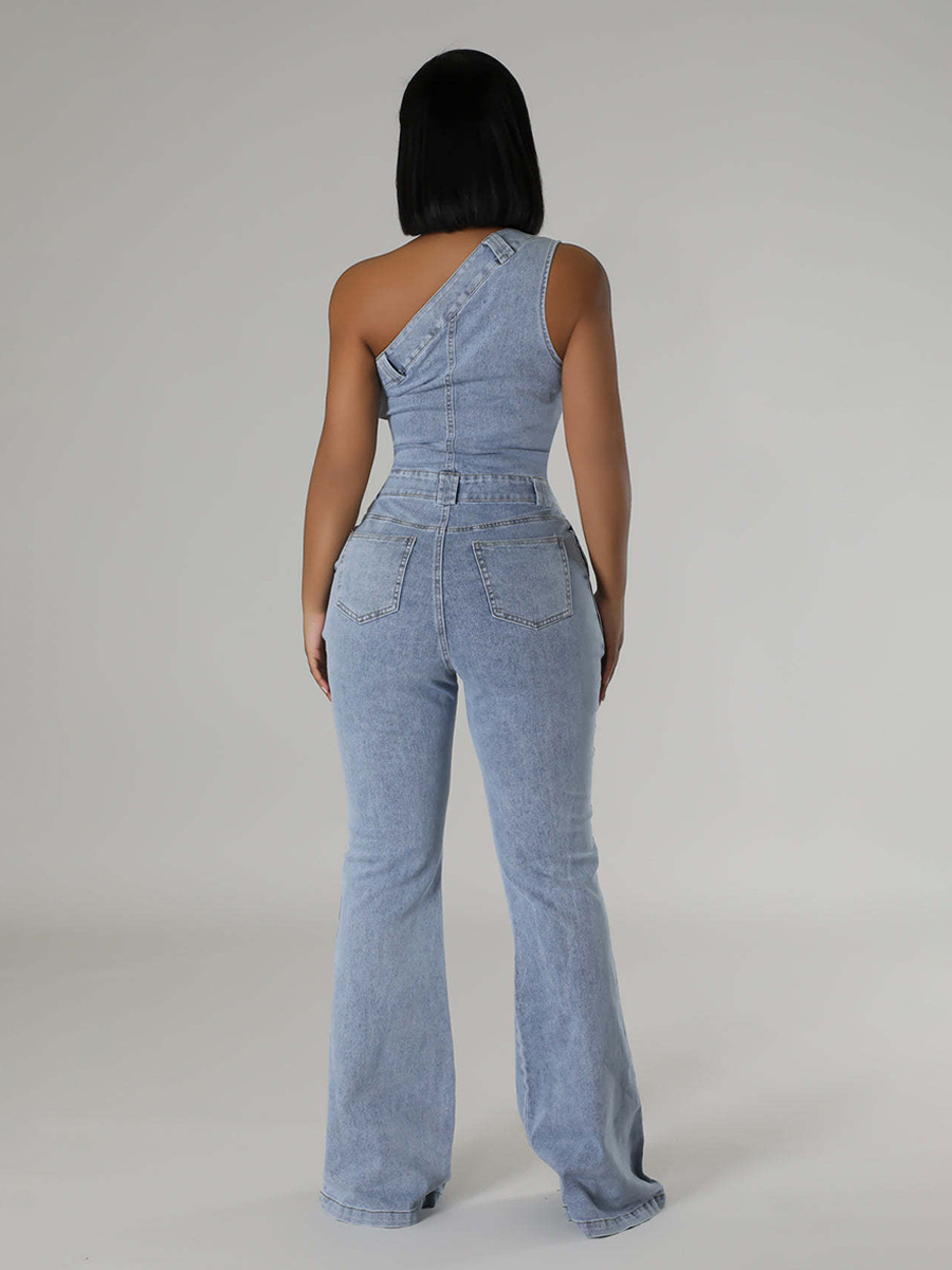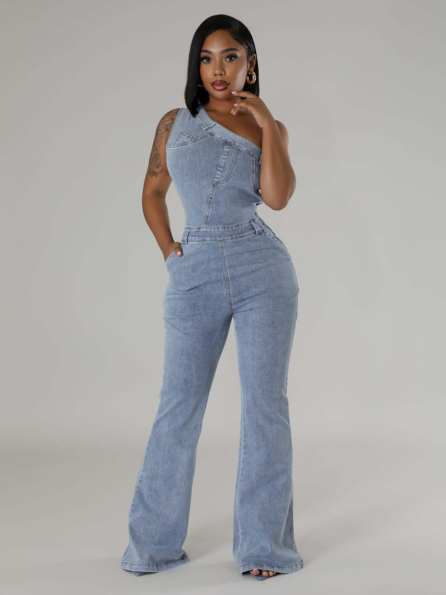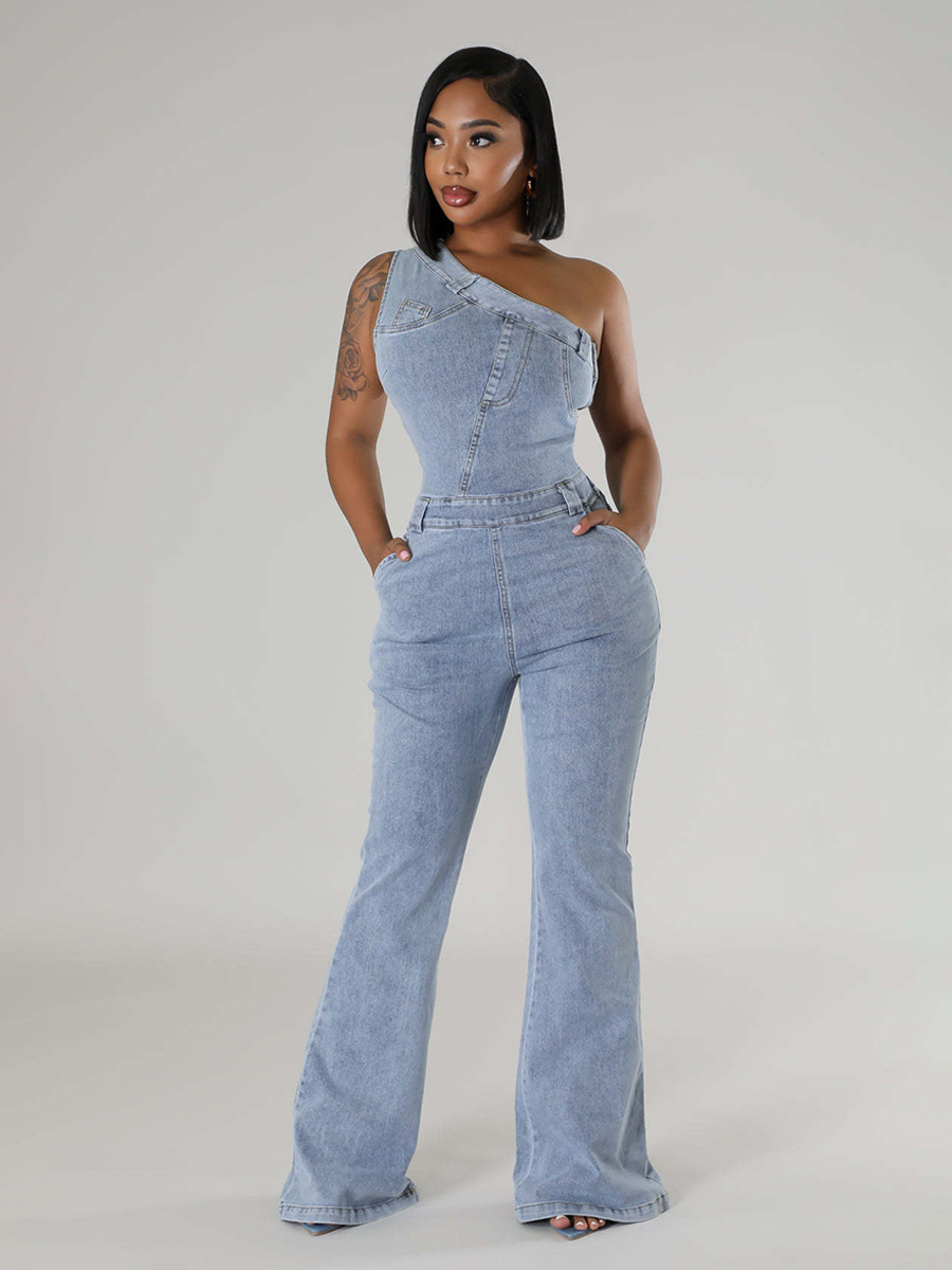 ワンショルダーウォッシュドデニムジャンプスーツ(レディース) - ライトブルー Y2K セクシーフレアスリムロンパース - 夏の夜のクラブウェア 2026