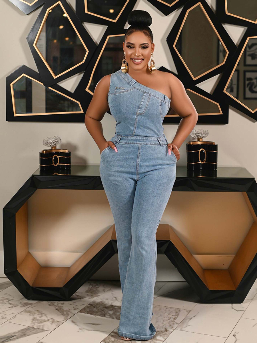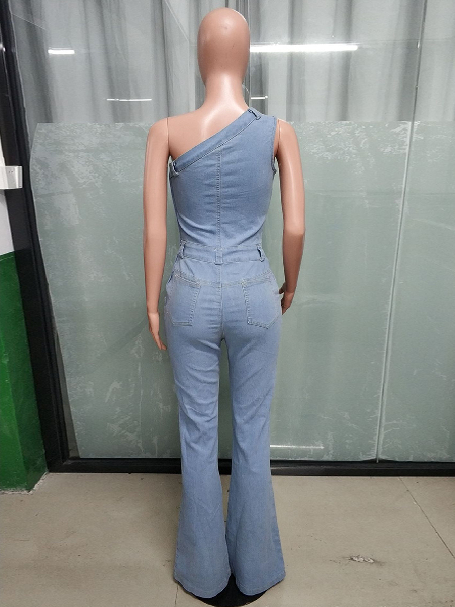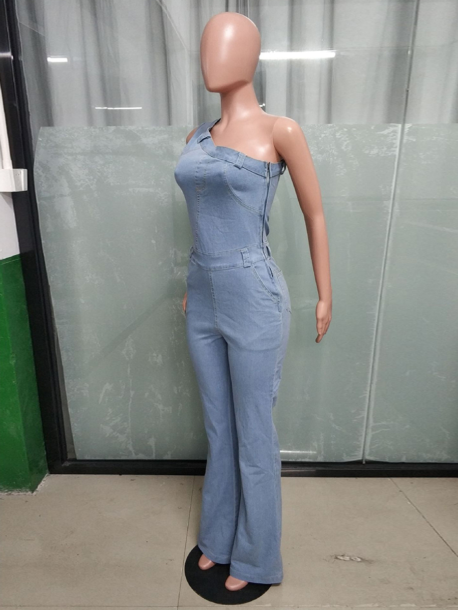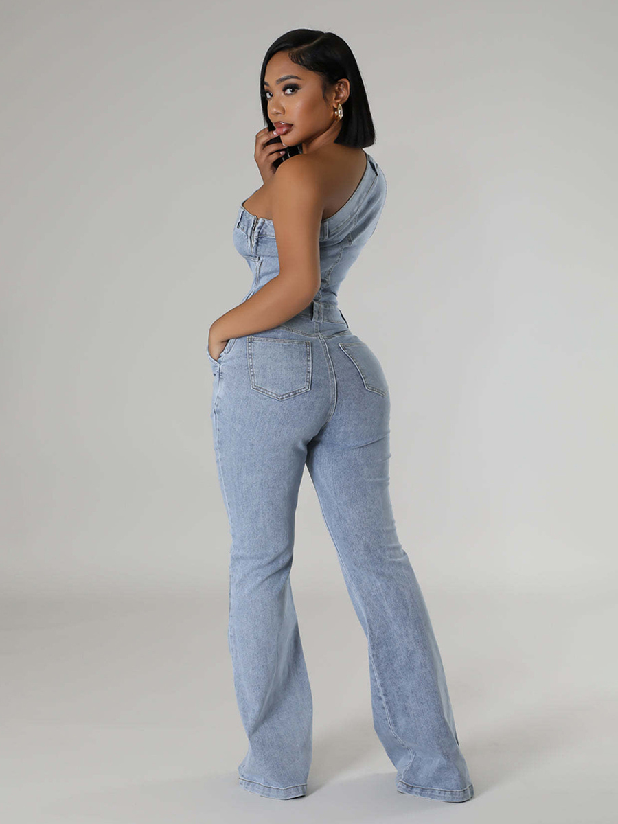 ワンショルダーウォッシュドデニムジャンプスーツ(レディース) - ライトブルー Y2K セクシーフレアスリムロンパース - 夏の夜のクラブウェア 2026