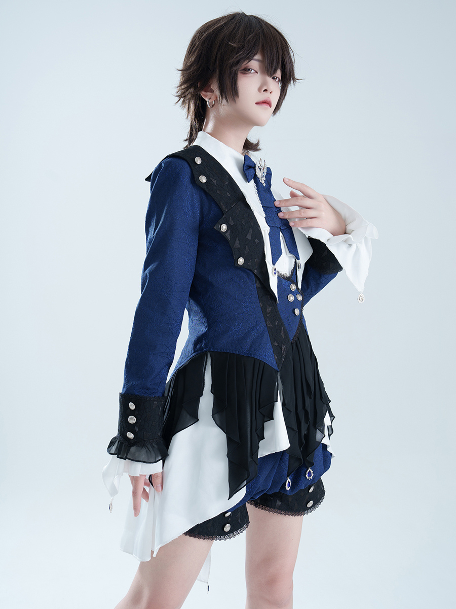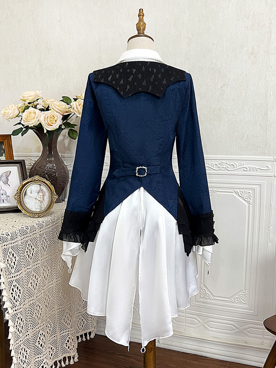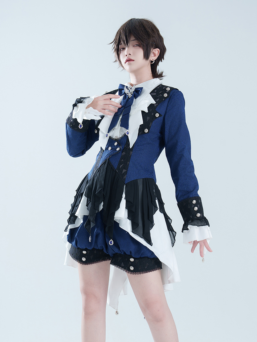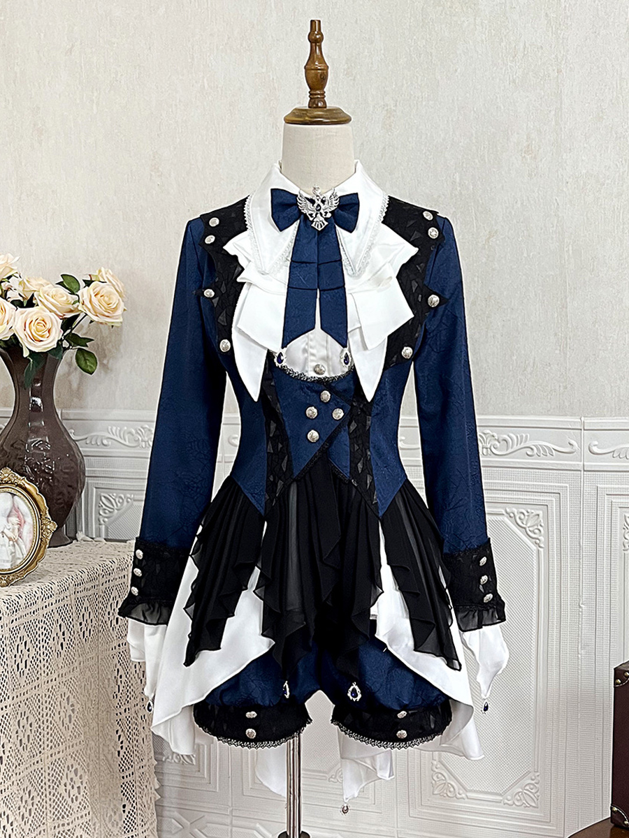 王子ロリータドレス ダークネイビー 長袖 クラシックリボン オーバーコート パンツドレスセット