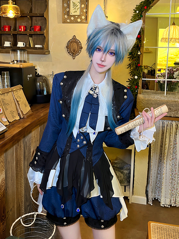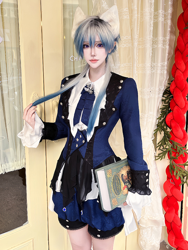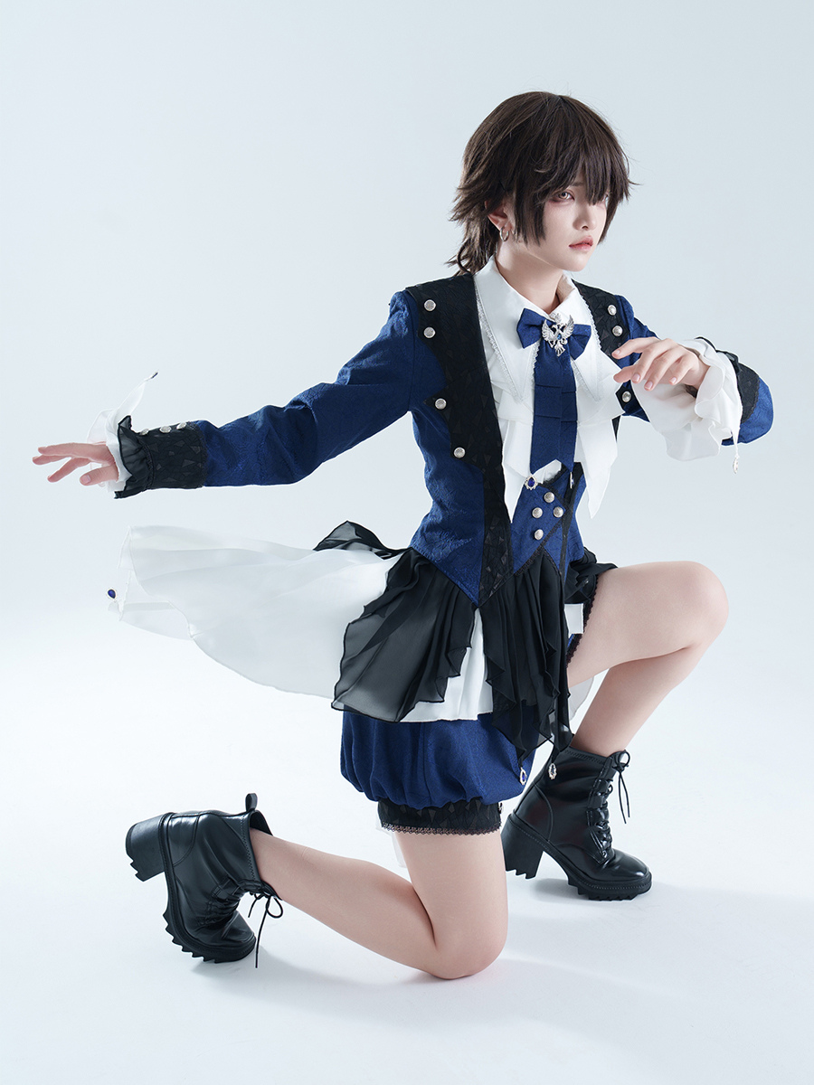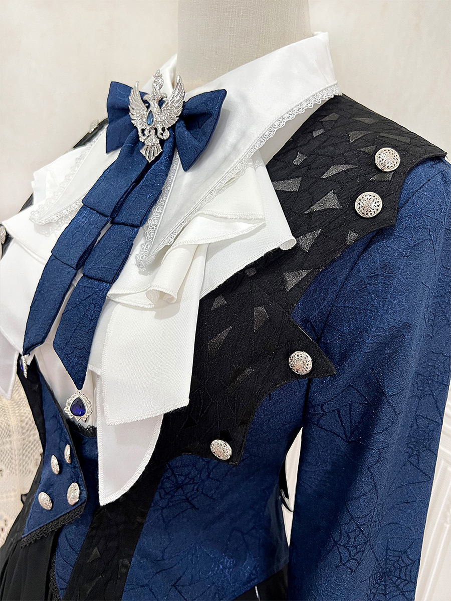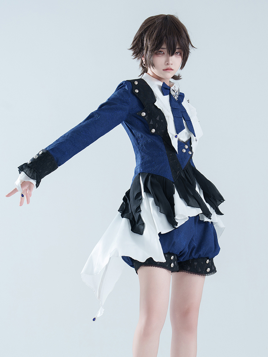 王子ロリータドレス ダークネイビー 長袖 クラシックリボン オーバーコート パンツドレスセット