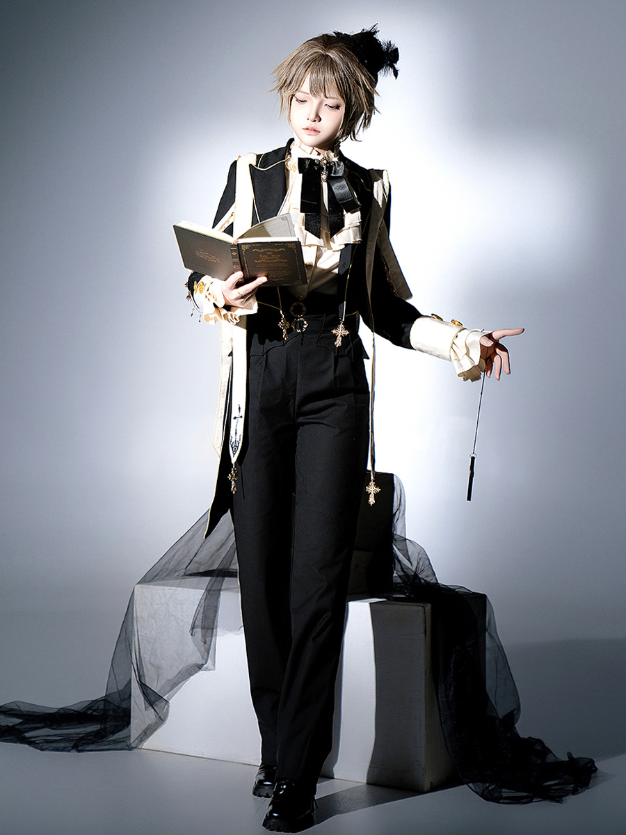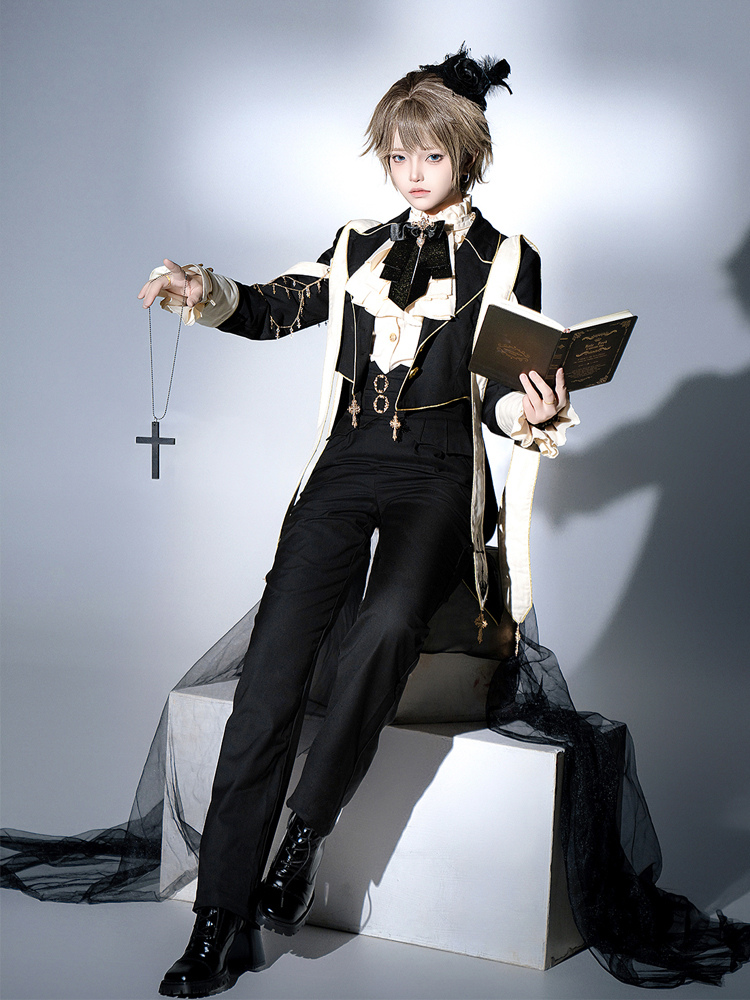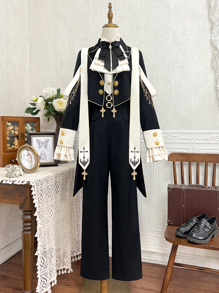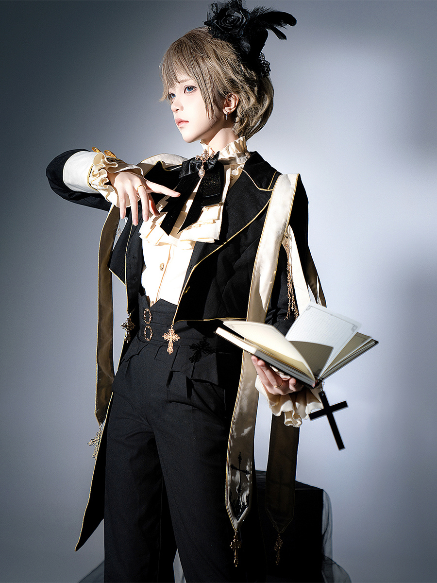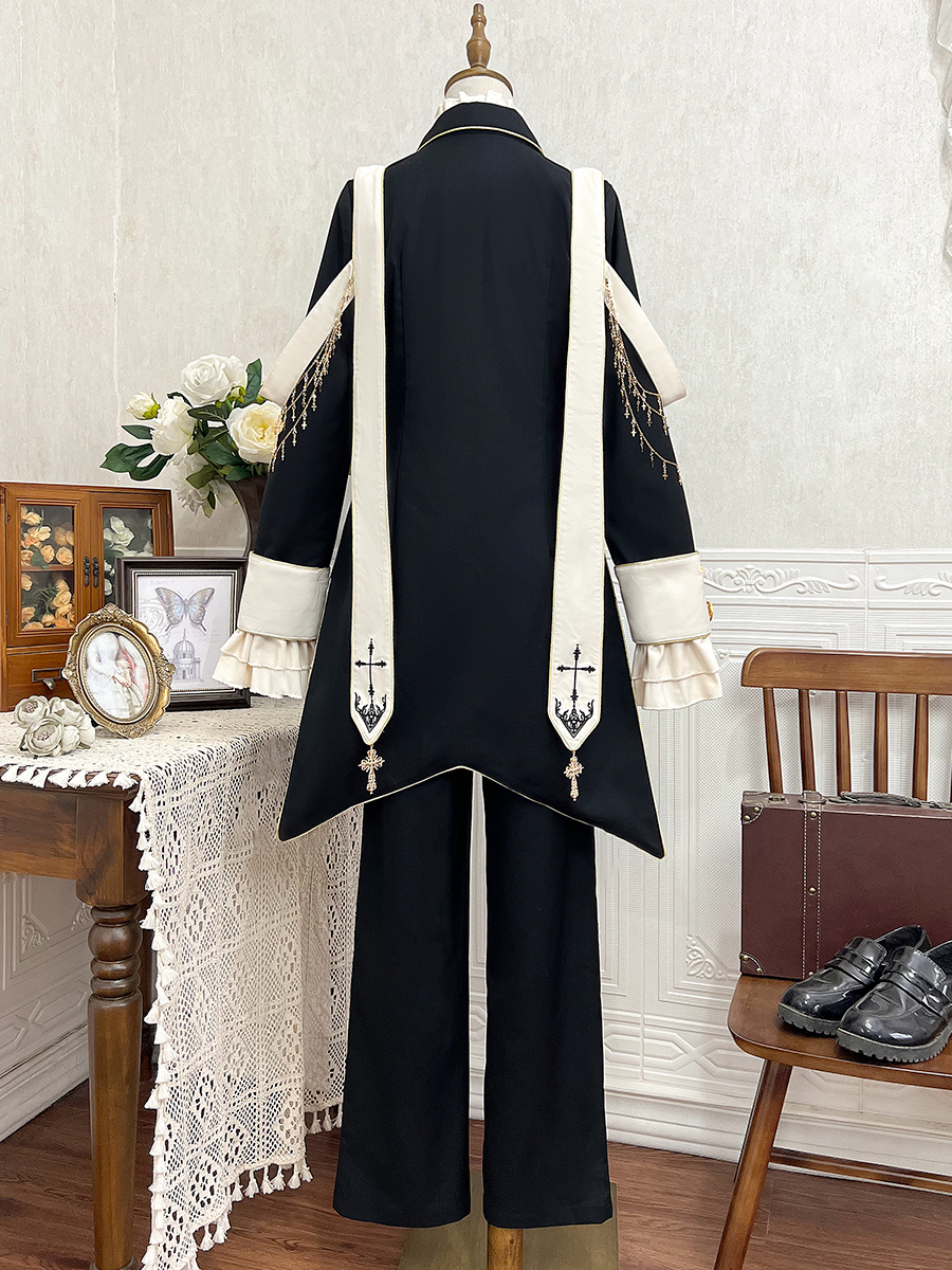 王子 ロリータ ドレス ゴシック ブラック クラシック フリル クロス 長袖 シャツ オーバーコート パンツ セット