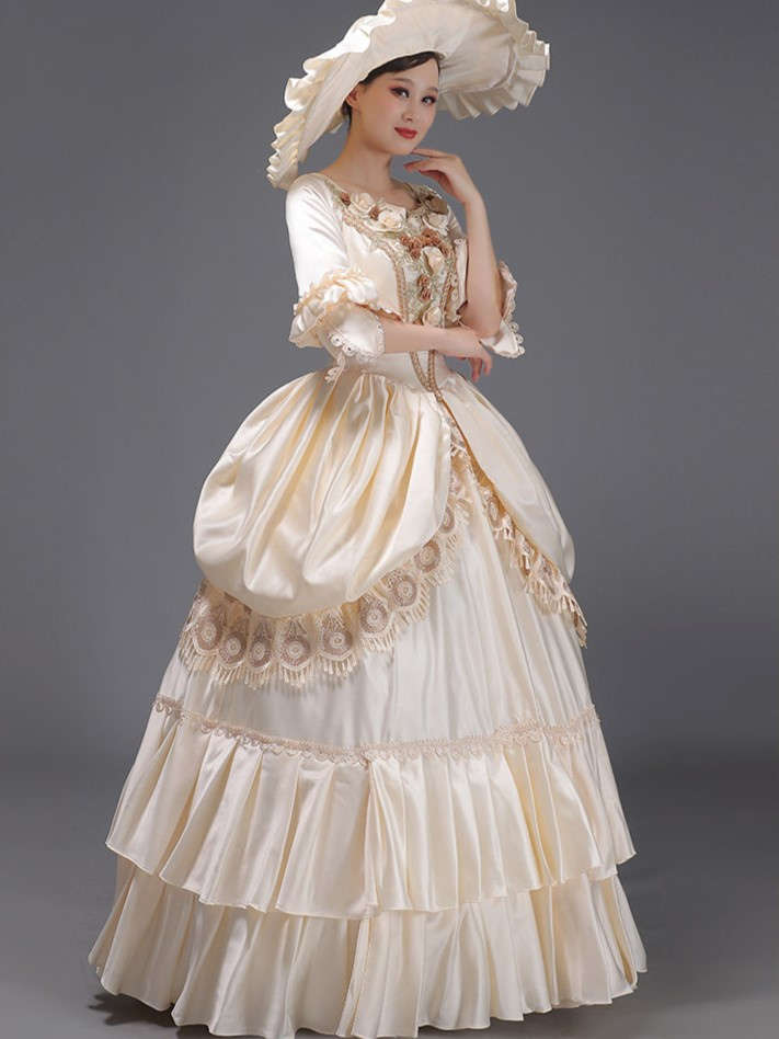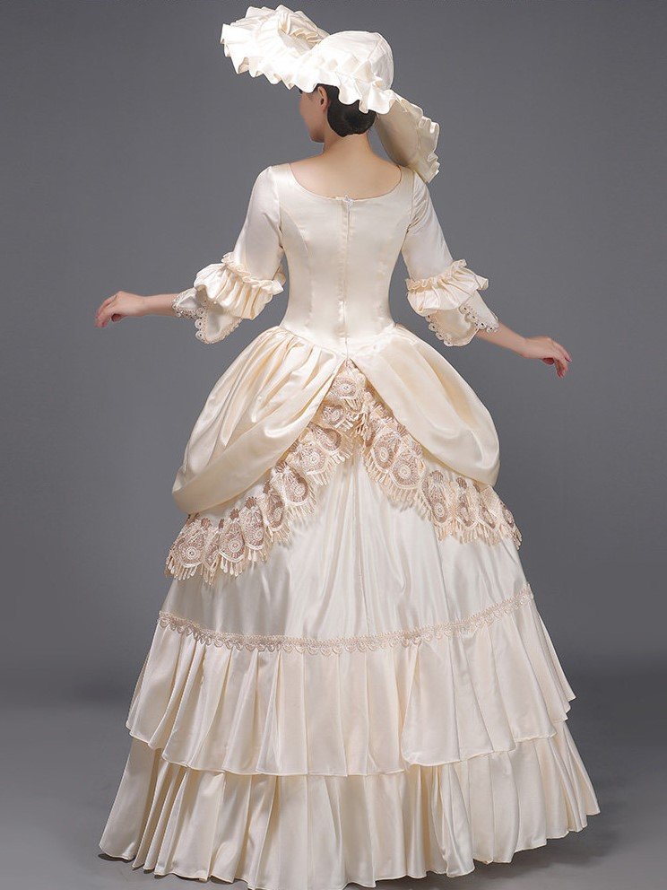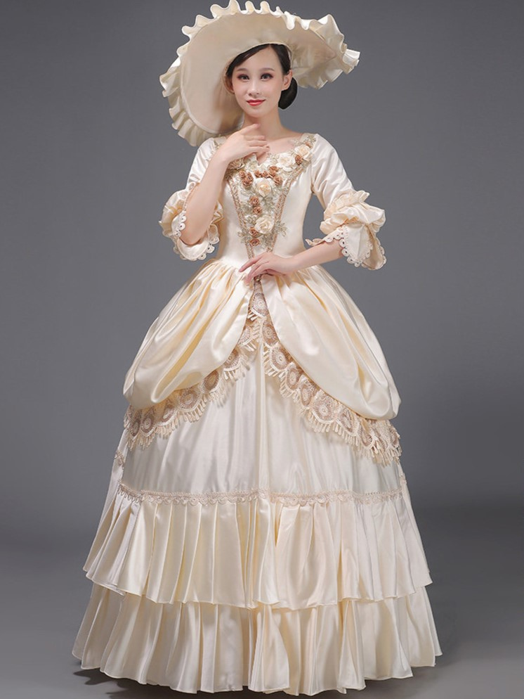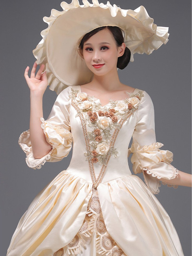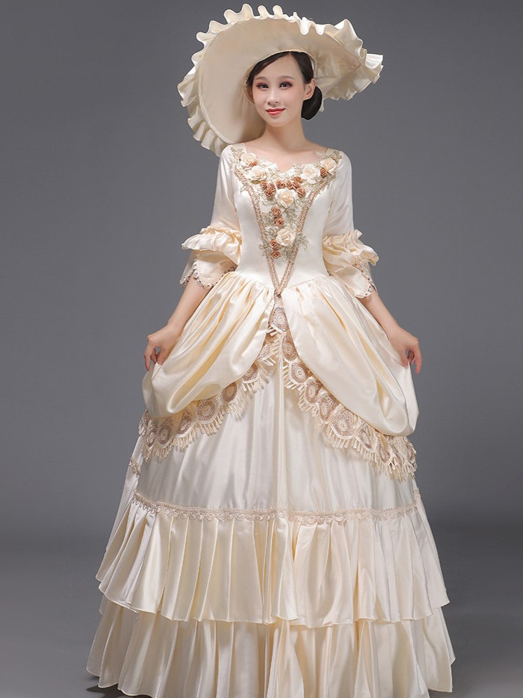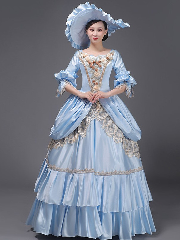 ライトスカイブルーレトロ衣装レースポリエステル帽子女性のマリーアントワネット衣装ロイヤルチュニック仮面舞踏会ボールガウン
