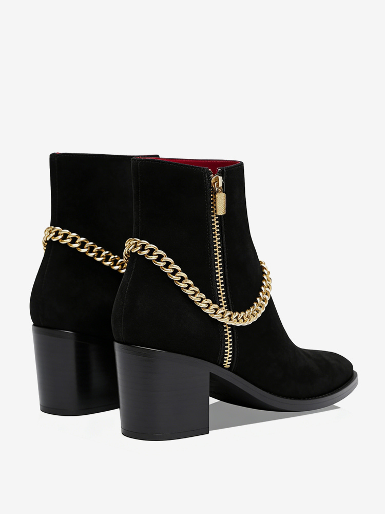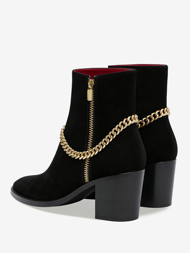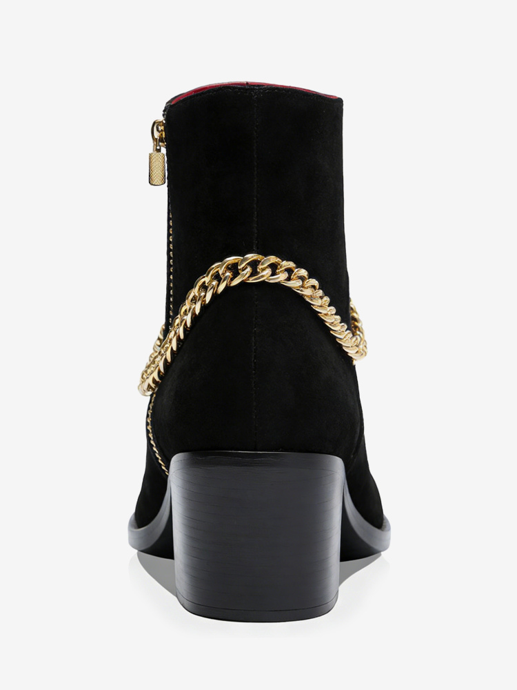 男性のハイヒールブーツチェルシーブーツブラックスエードレザーポインテッドトゥチェーンパーティープロムドレスブーツ