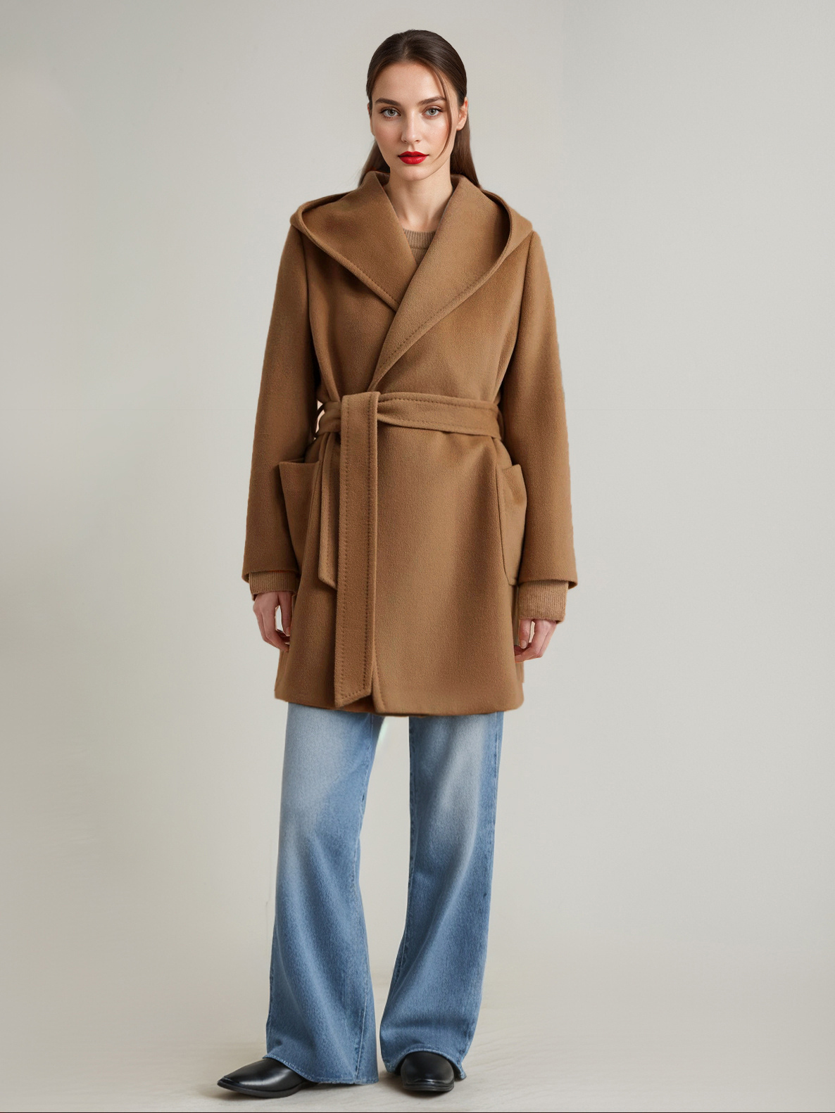ウール カシミア ブレンド コート フード付き キャメル ベルト付き ダブルフェイス ショート ラップコート レディース 2025