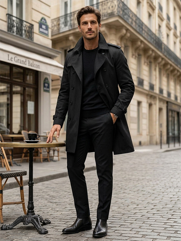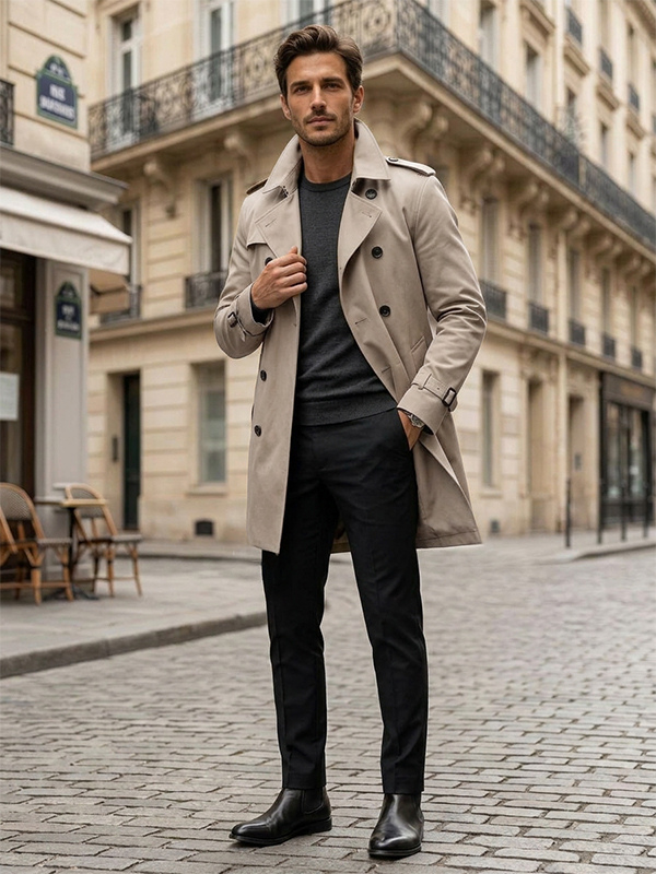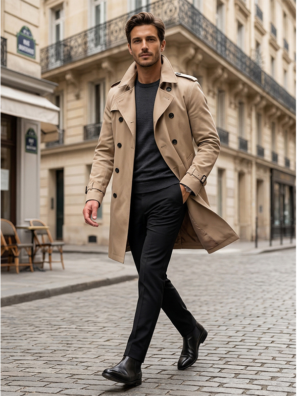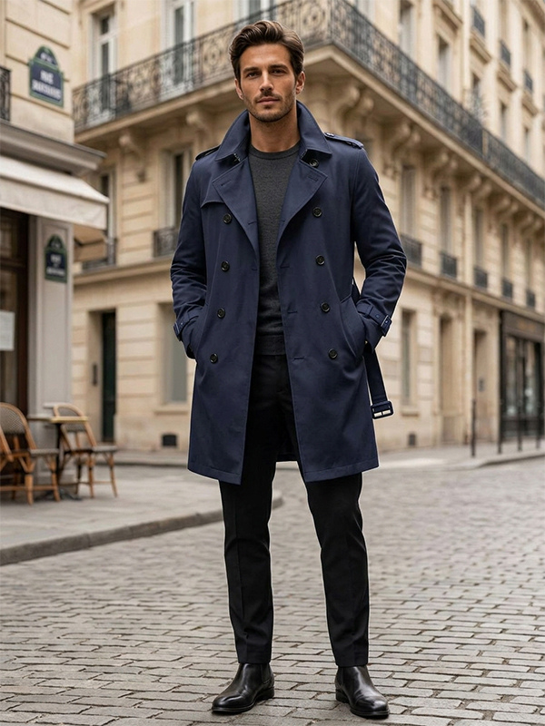 メンズ ベルト付き 長袖 ダブルブレスト コート