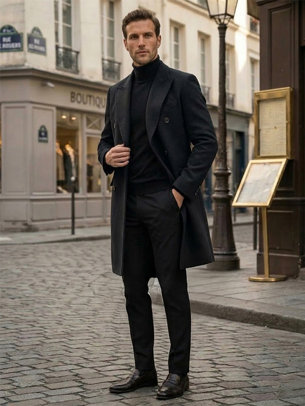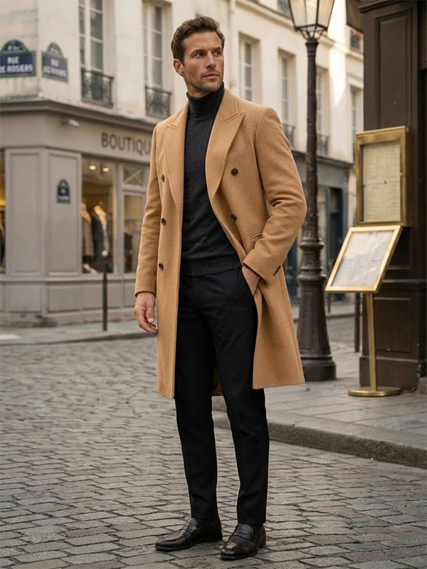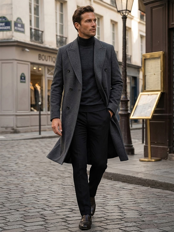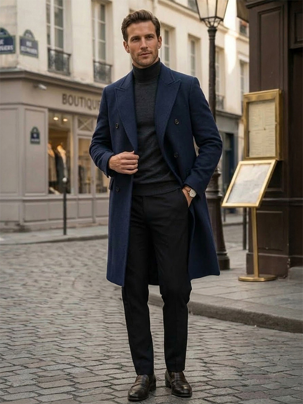 メンズ ウールコート ミドル丈 ダブルブレスト ロングライン ピーコート