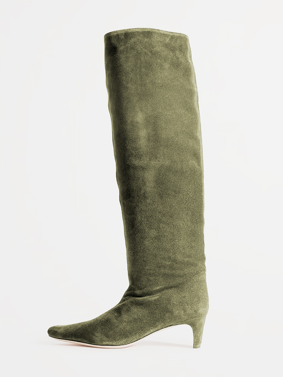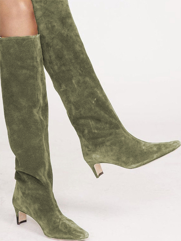 マイクロスエードアッパー ダークグリーン スクエアトゥ キトンヒール ミッドカーフブーツ レディース ブーツ
