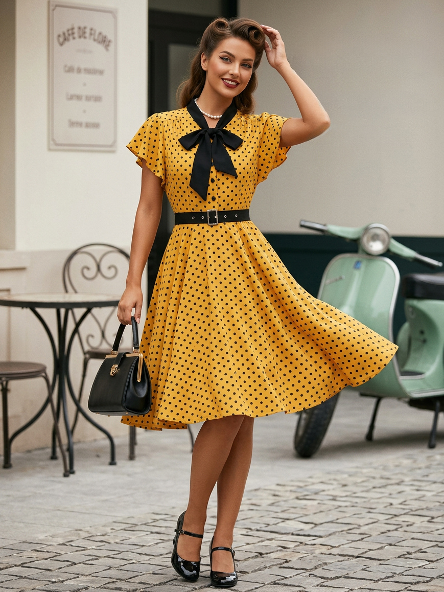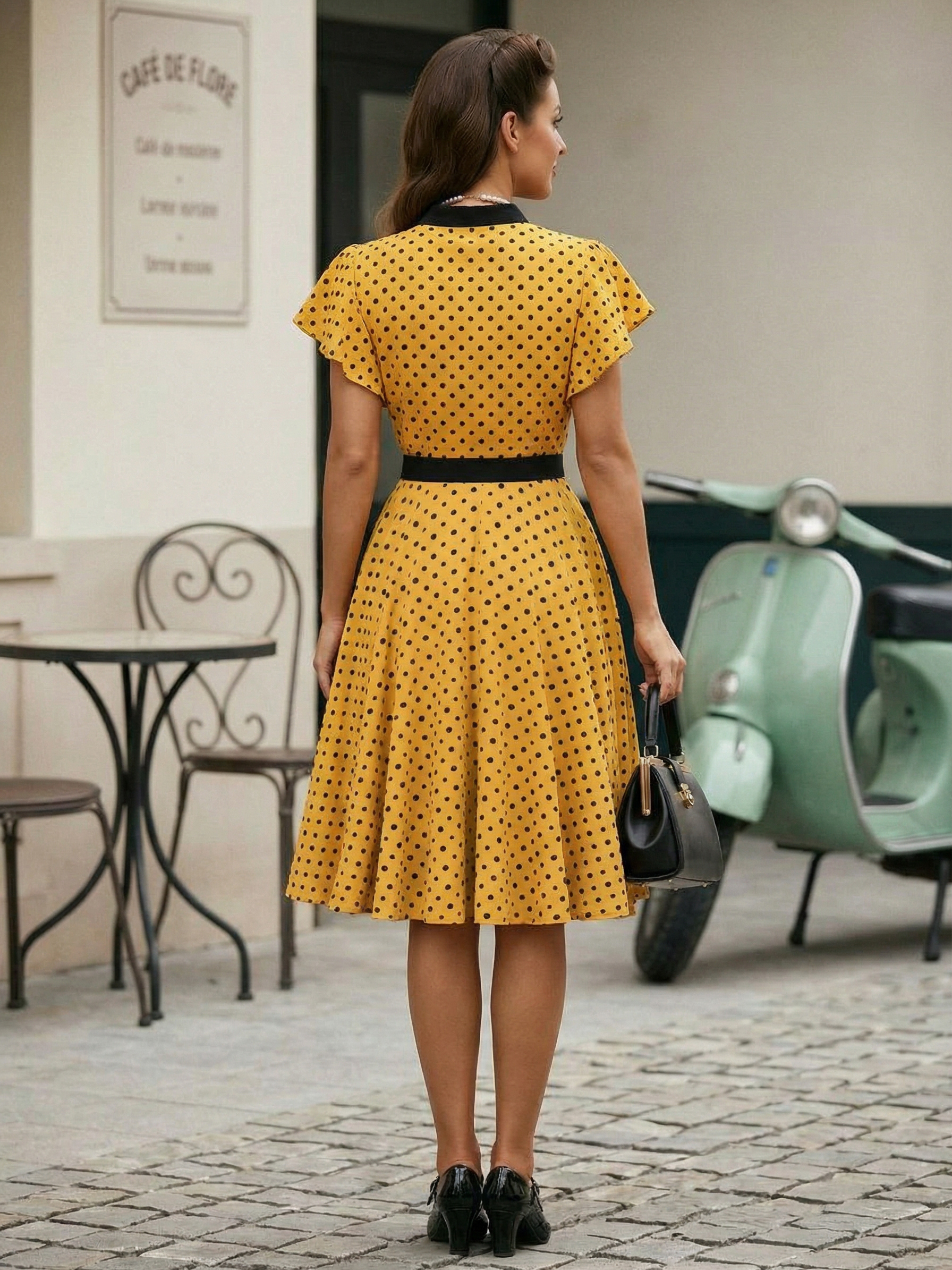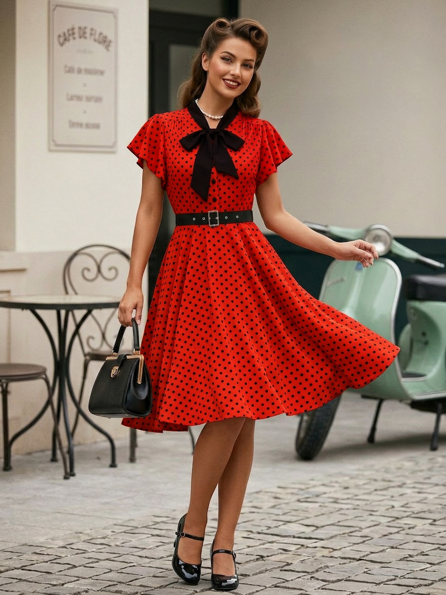 ドット柄シャツドレス、ネクタイとベルト付き、フラッタースリーブ、ヴィンテージミディドレス、レディース 2026