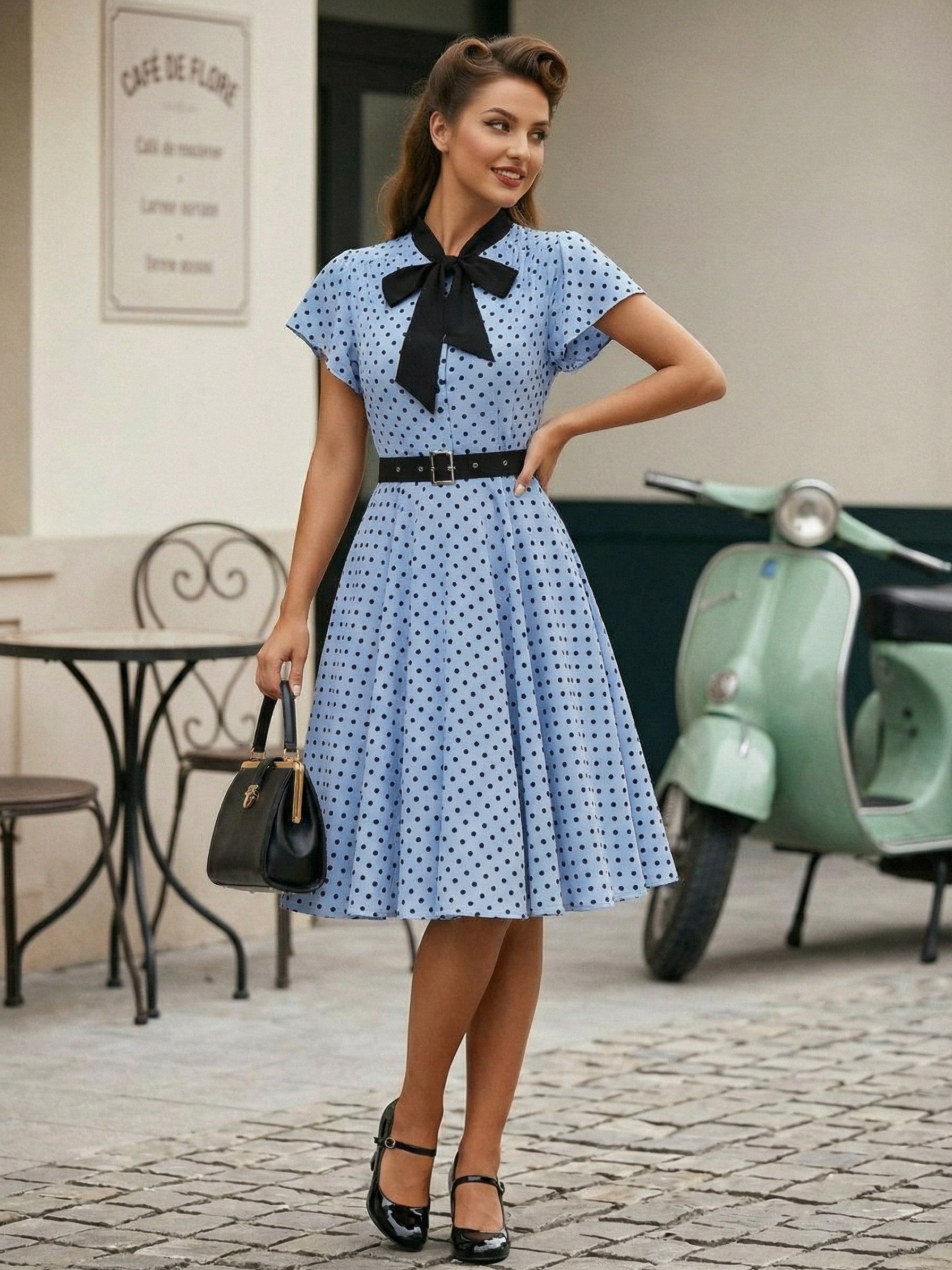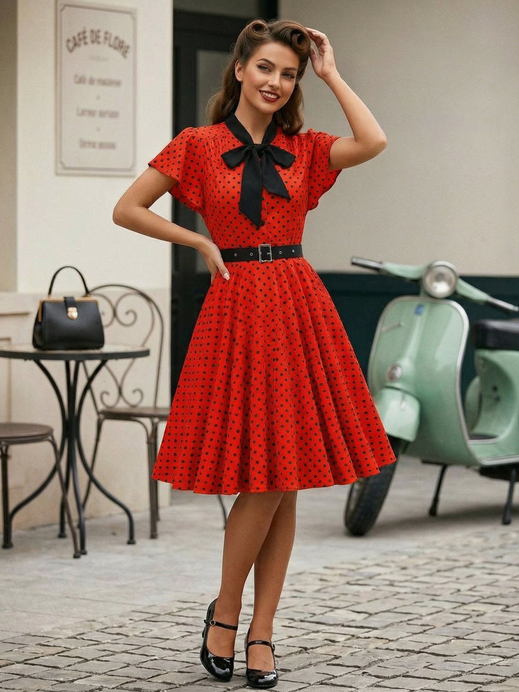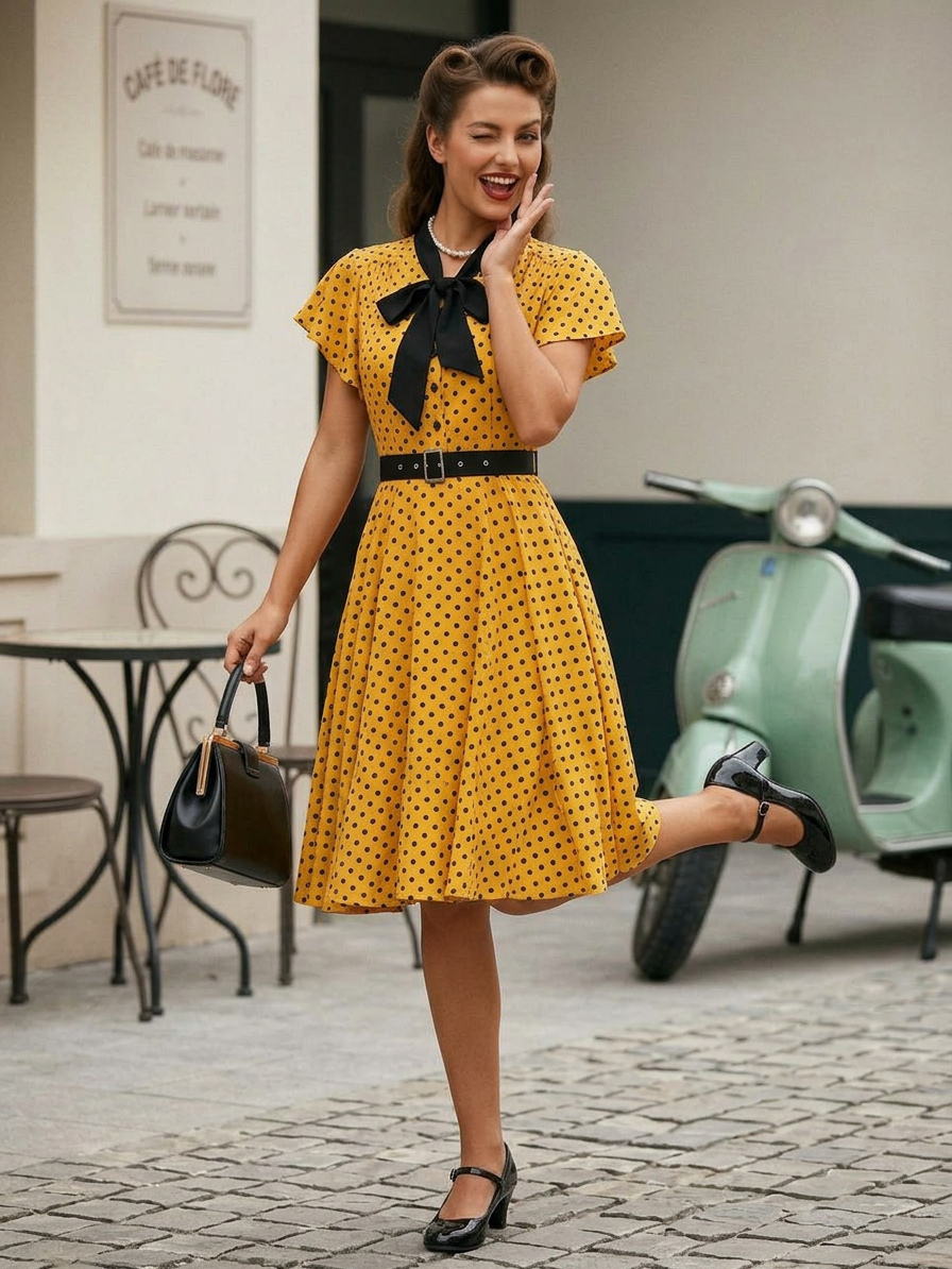 ドット柄シャツドレス、ネクタイとベルト付き、フラッタースリーブ、ヴィンテージミディドレス、レディース 2026