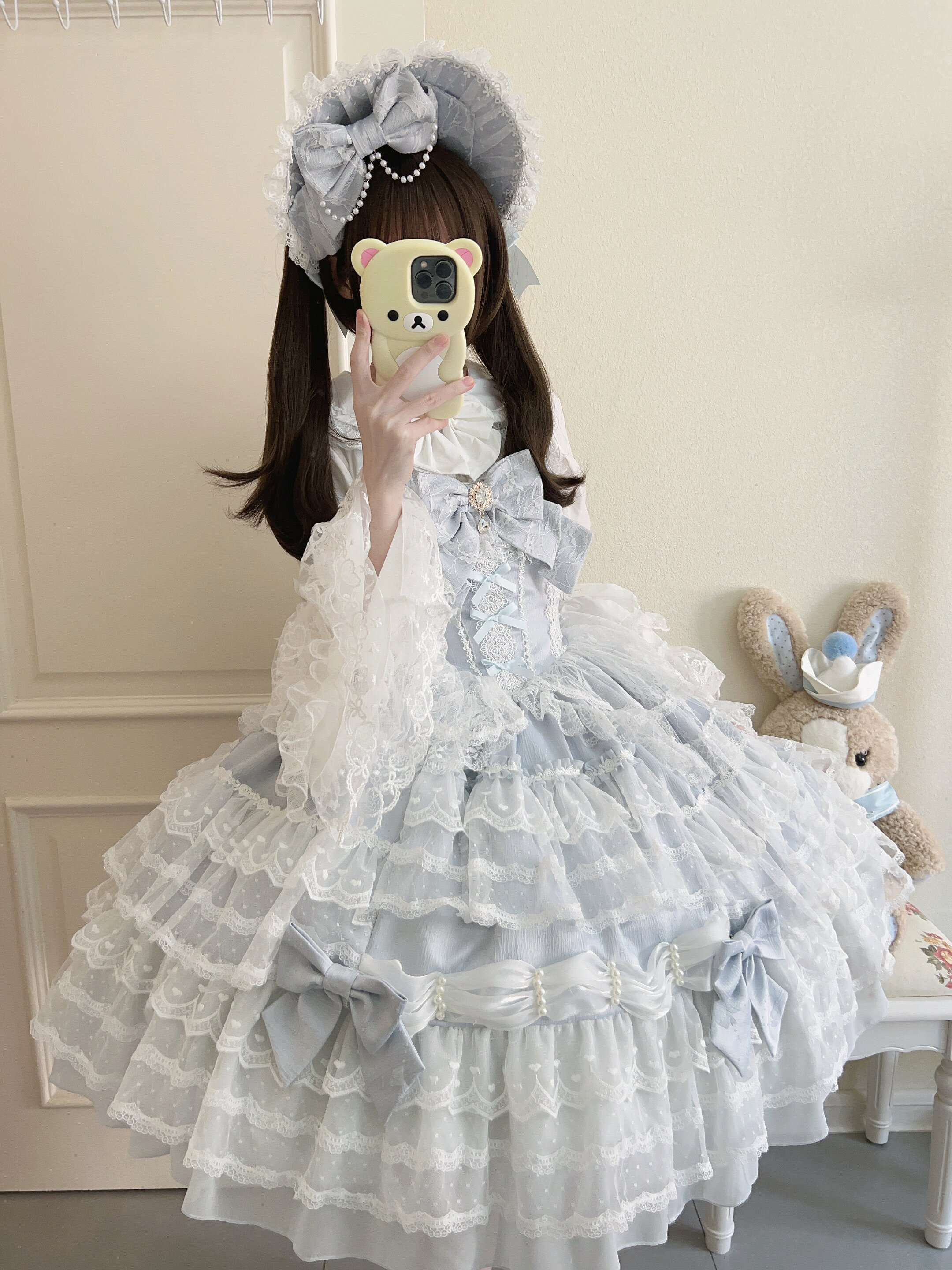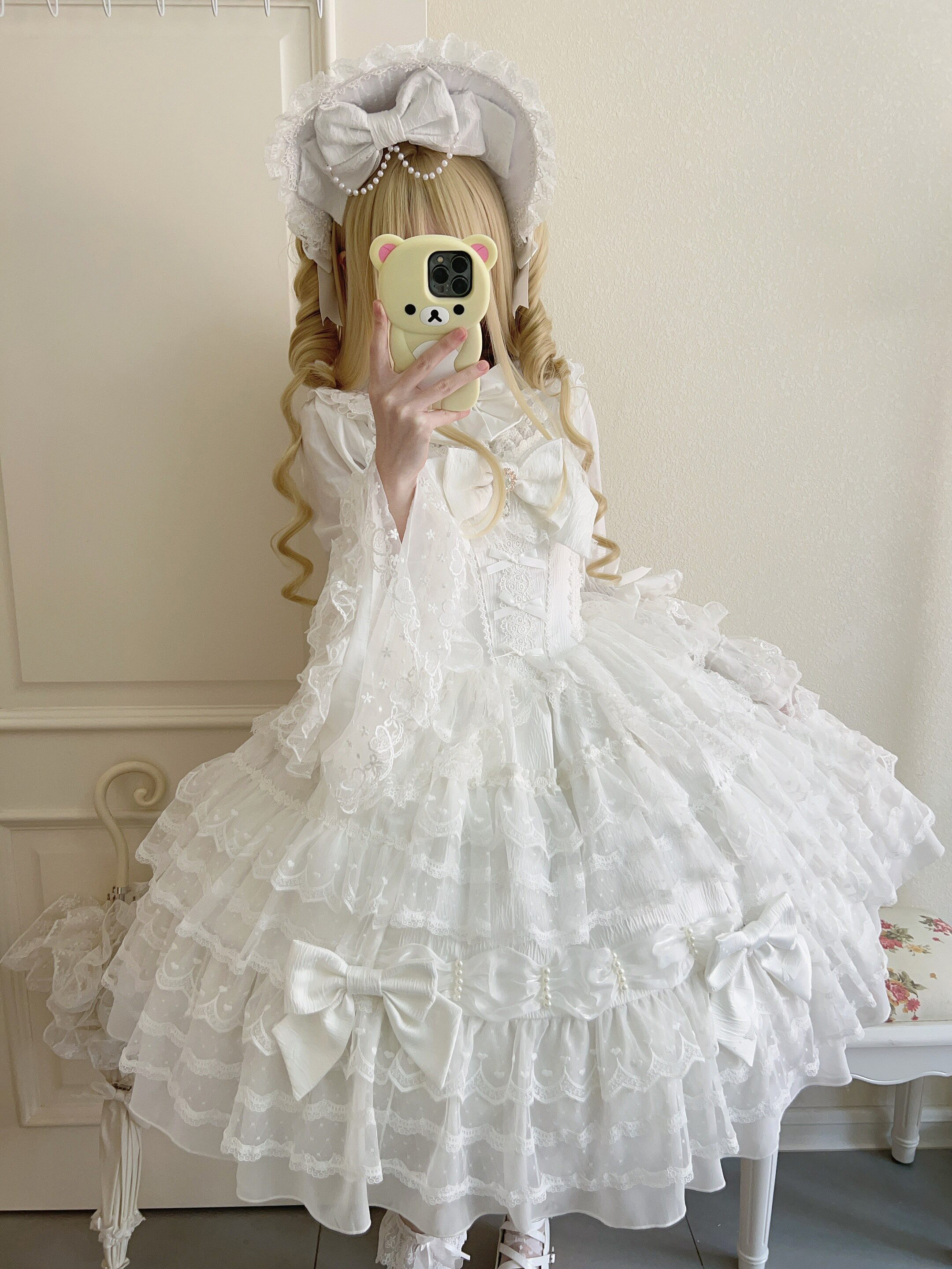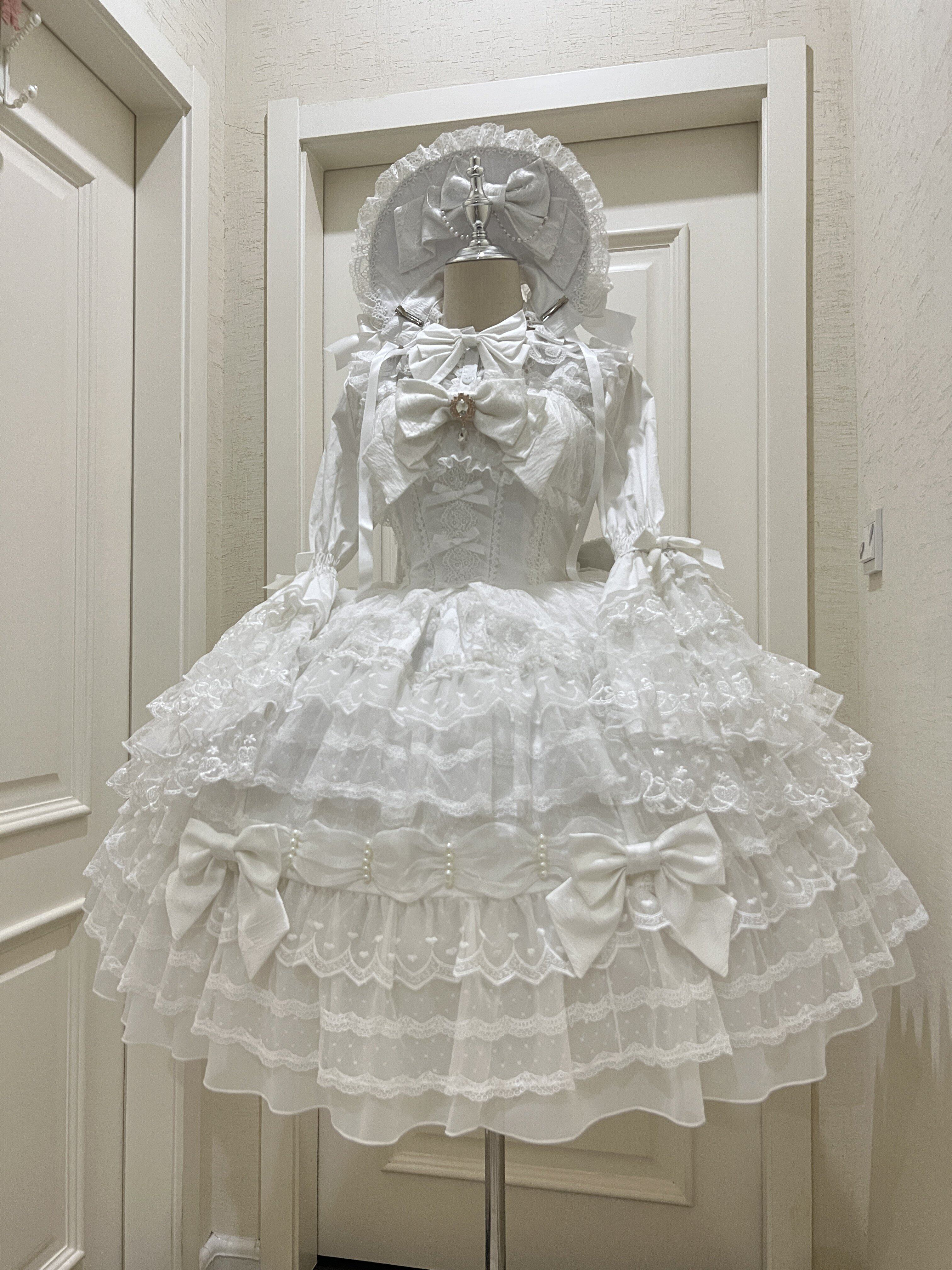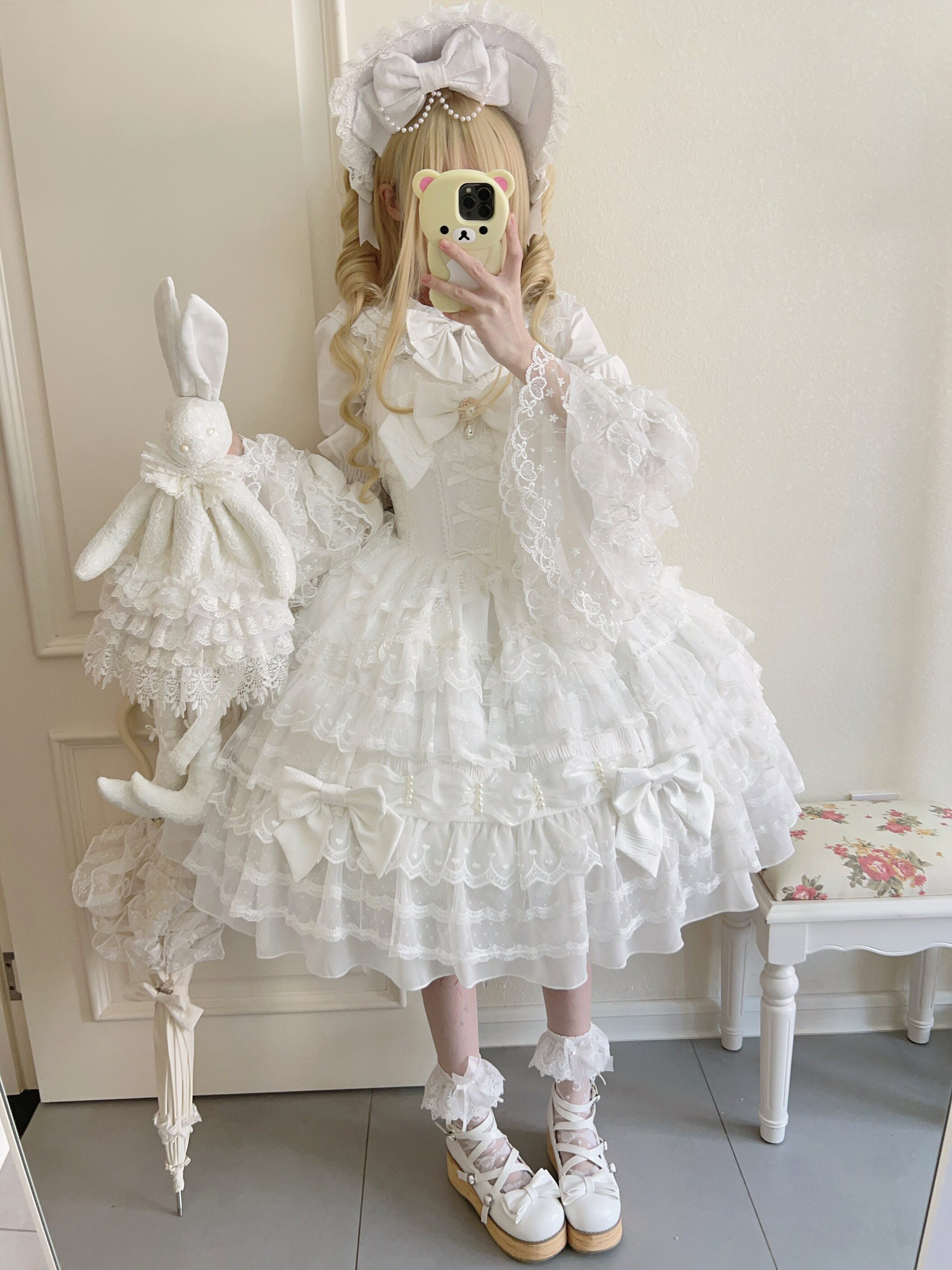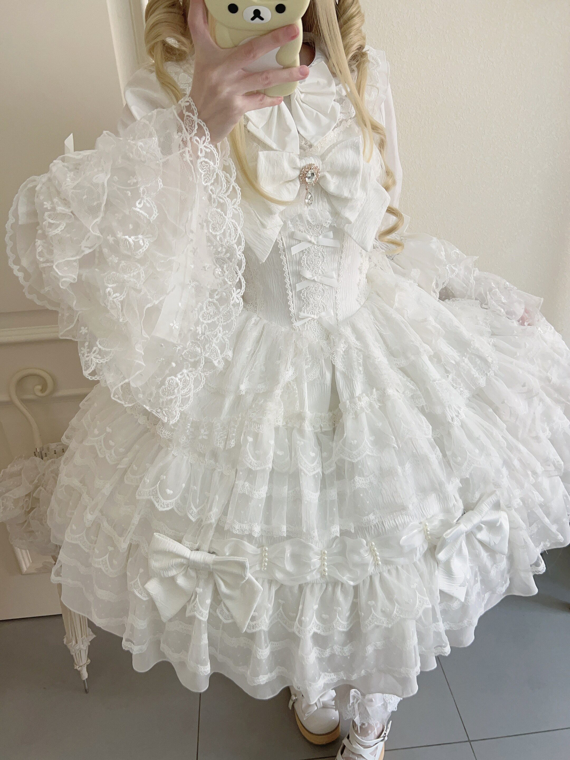 T****yフィット感:ちょうどいいサイズこのジャンパースカートとブラウスのセットにすっかり惚れ込んでいます!職人技が素晴らしく、リボン、パール、レースのフリルが一つ一つ完璧に配置されています。プリーツのショルダーストラップが可愛らしさをプラスし、背中のシャーリングが快適な着心地と美しいシルエットを実現しています。ブラウスのパフスリーブと袖口のリボンで、まるでお姫様気分!梱包も丁寧で、配送も迅速でした。今では私のお気に入りのロリータアイテムです。お値段以上の価値がありました!