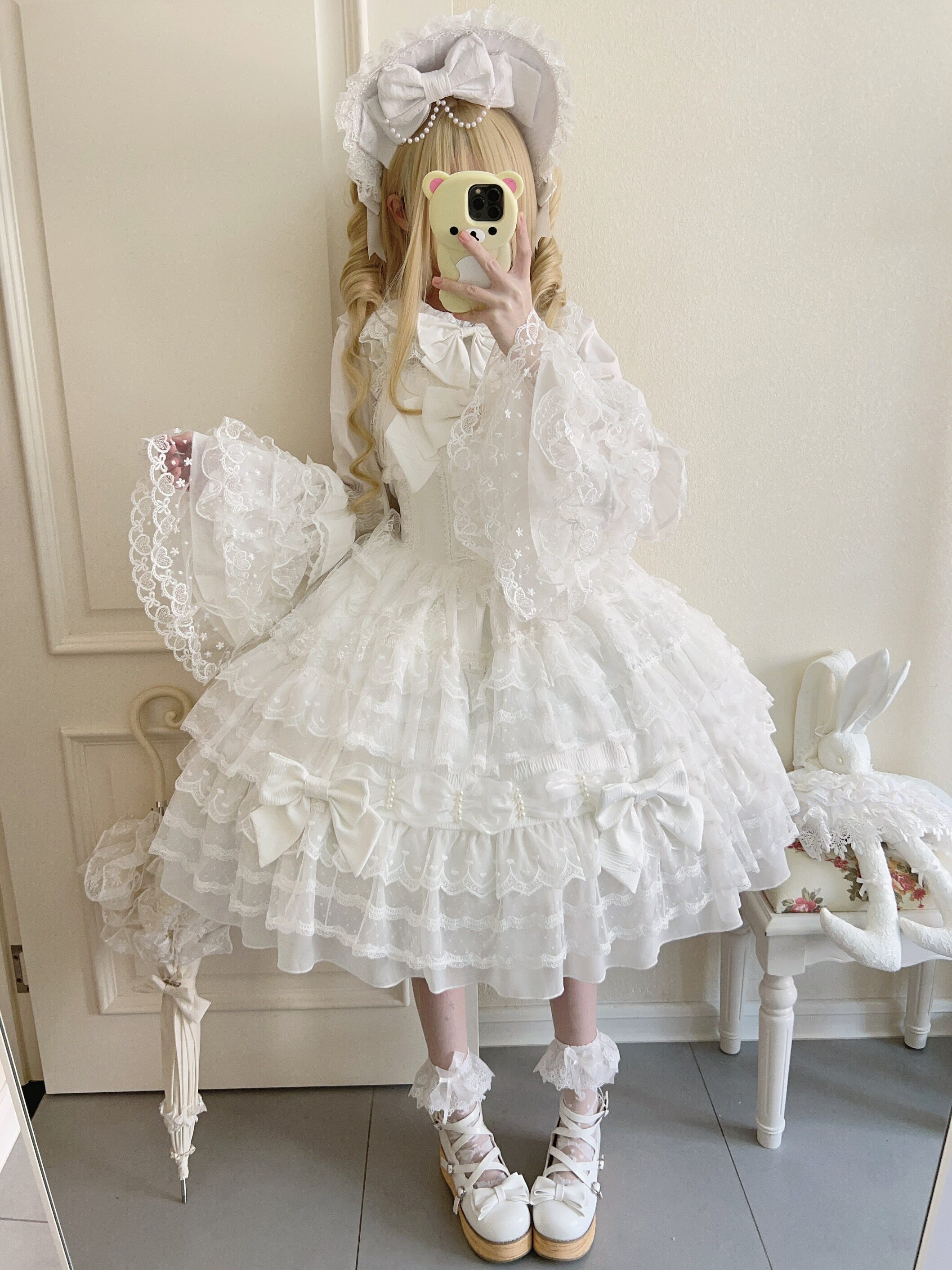 ◎キュートなロリータスタイルを完成させる、素敵なブラウス。レースを幾重にも重ねたプリンセススリーブと、袖口のキュートなリボンがポイント。襟元のリボンがエレガントな雰囲気を添えています。