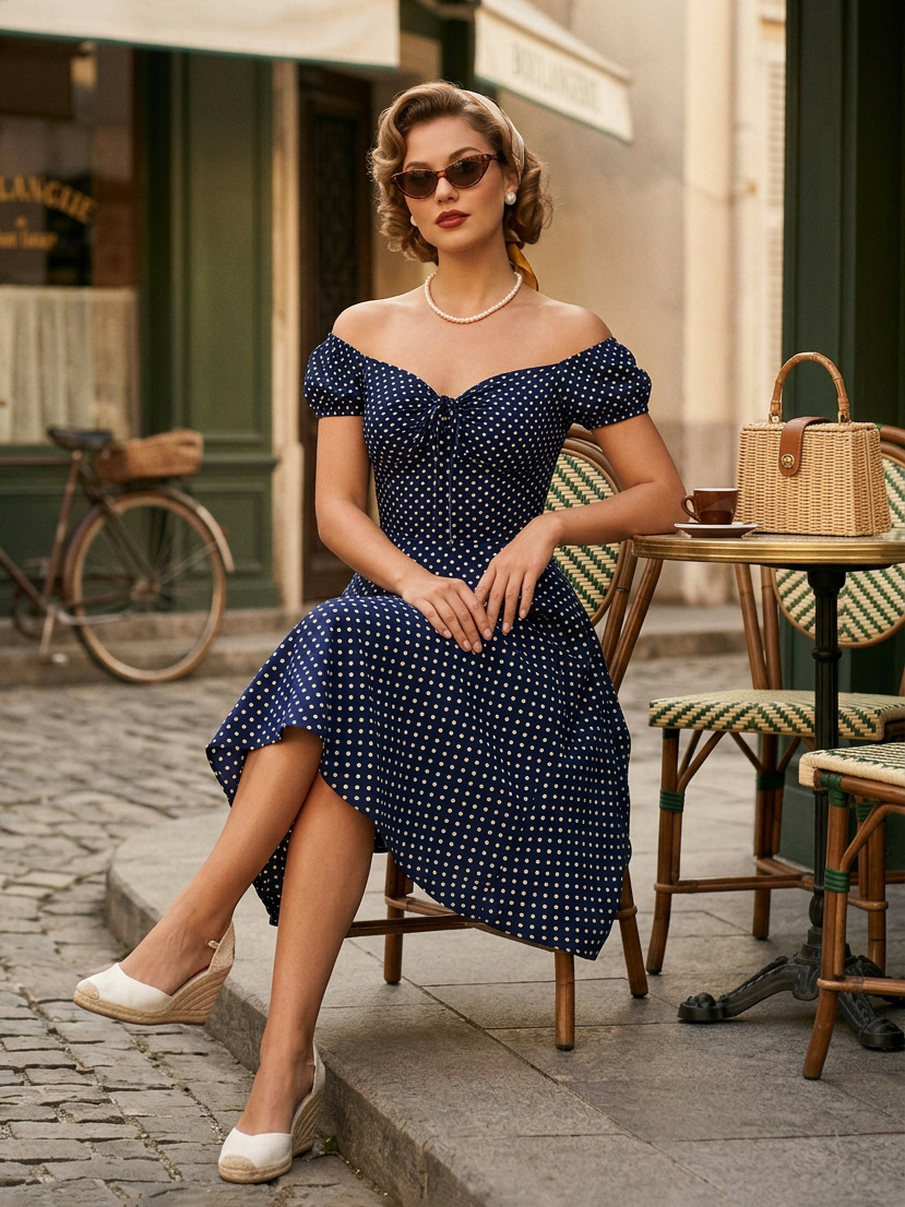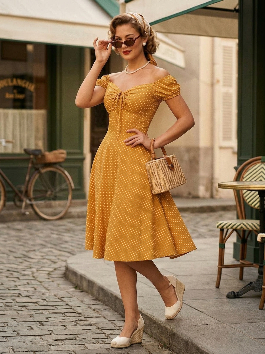 パフスリーブとフロントタイが付いた水玉模様のミディ丈ヴィンテージドレス 2026