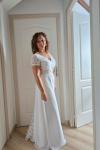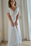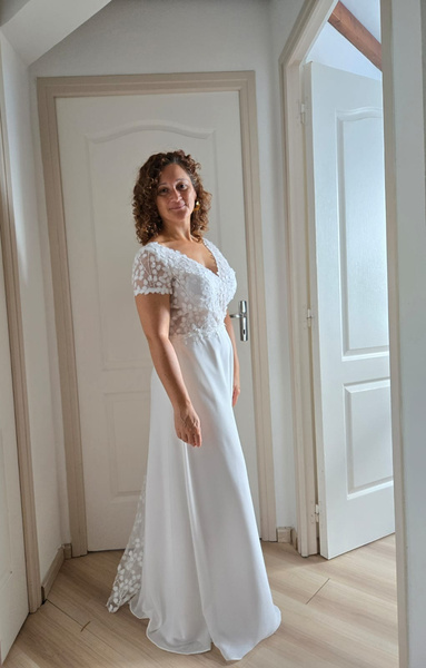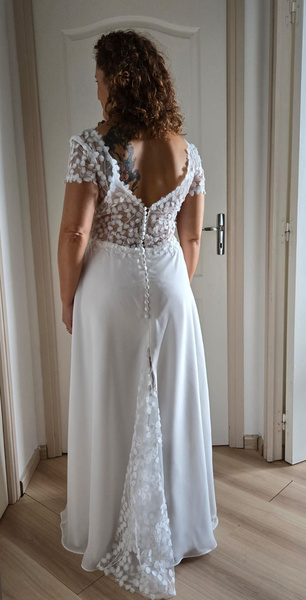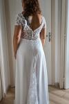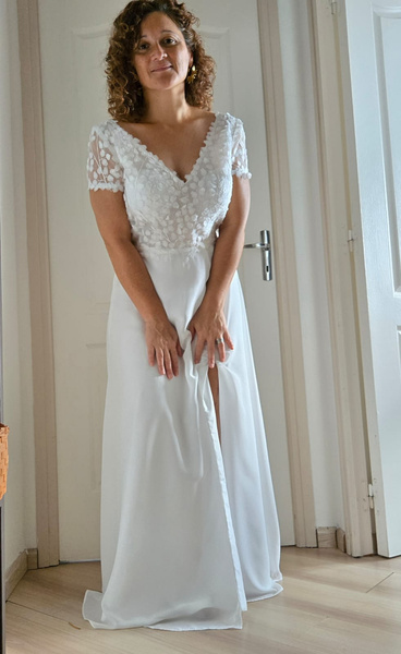 ボヘミアンウェディングドレス Vネック 半袖 トレーン付き レースブライダルガウン