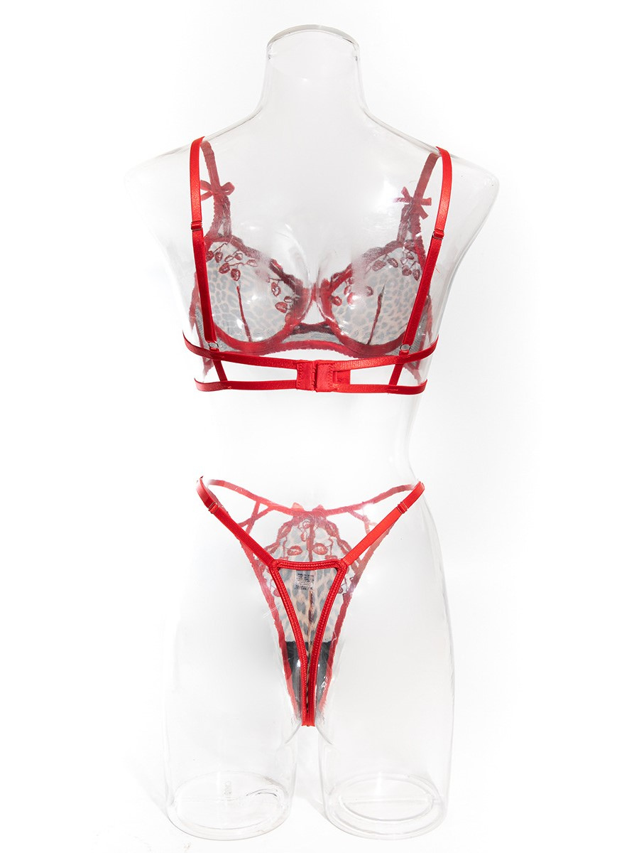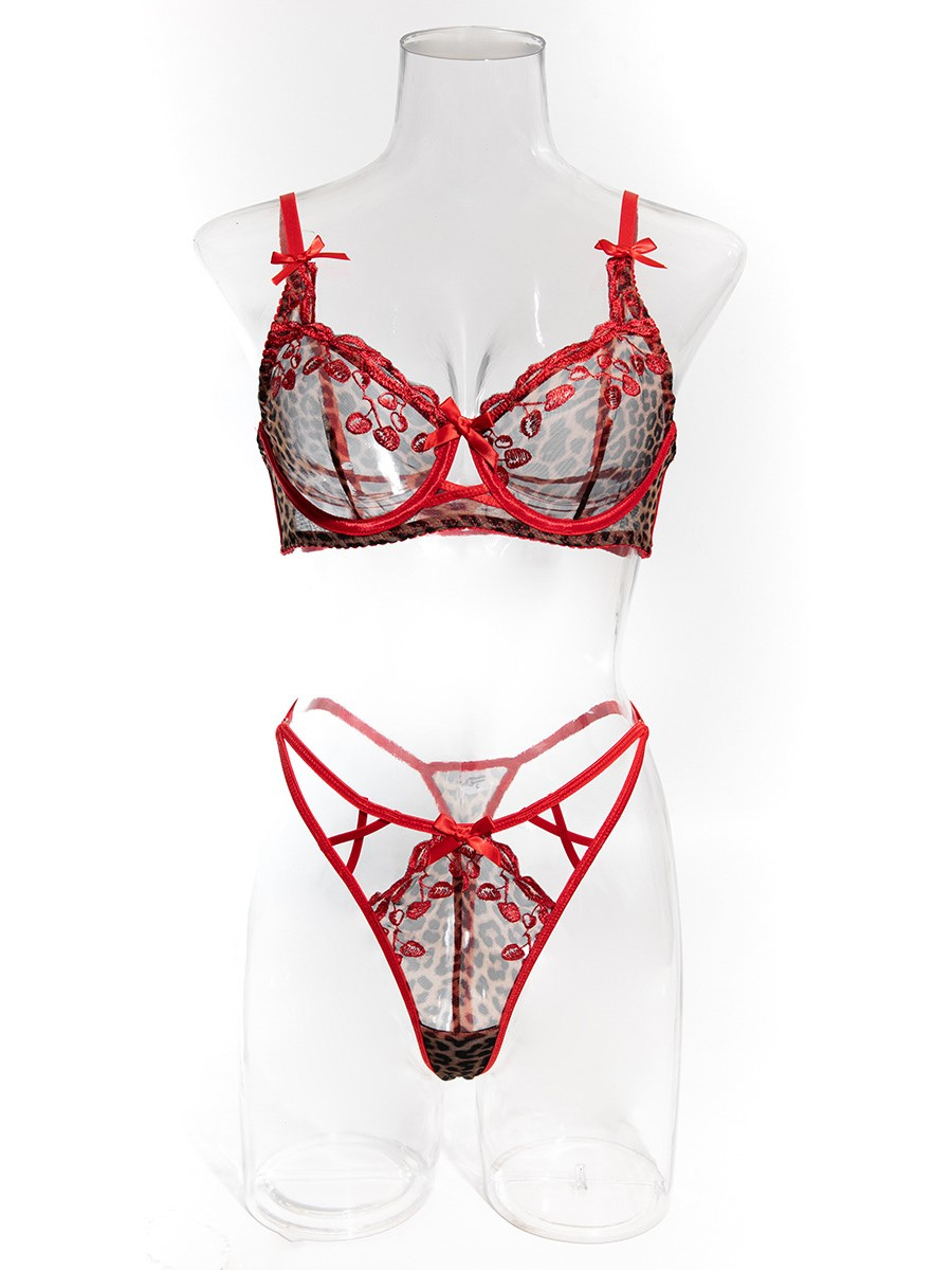 2ピースランジェリー シースルーレッド ヒョウ柄 ブラ&パンティセット