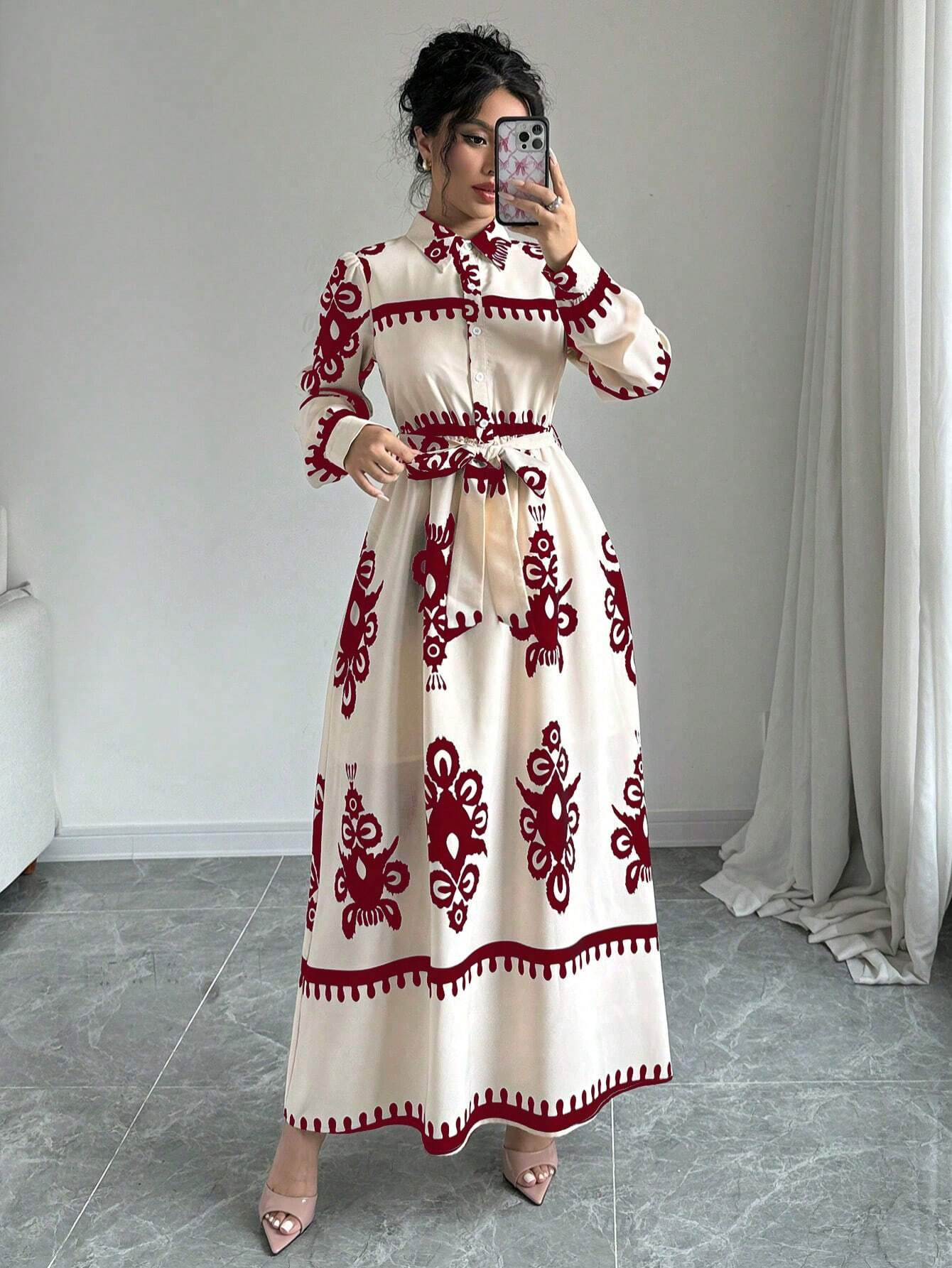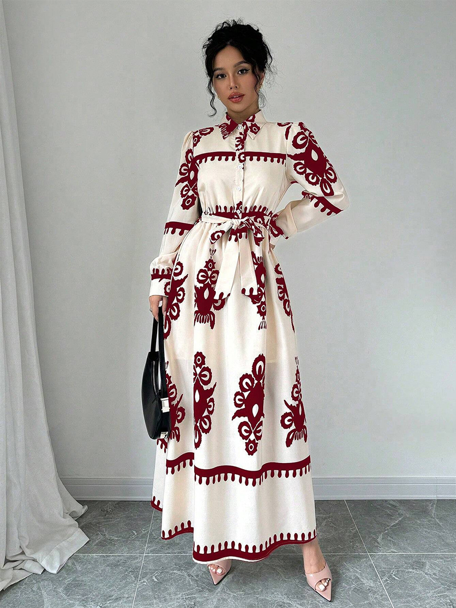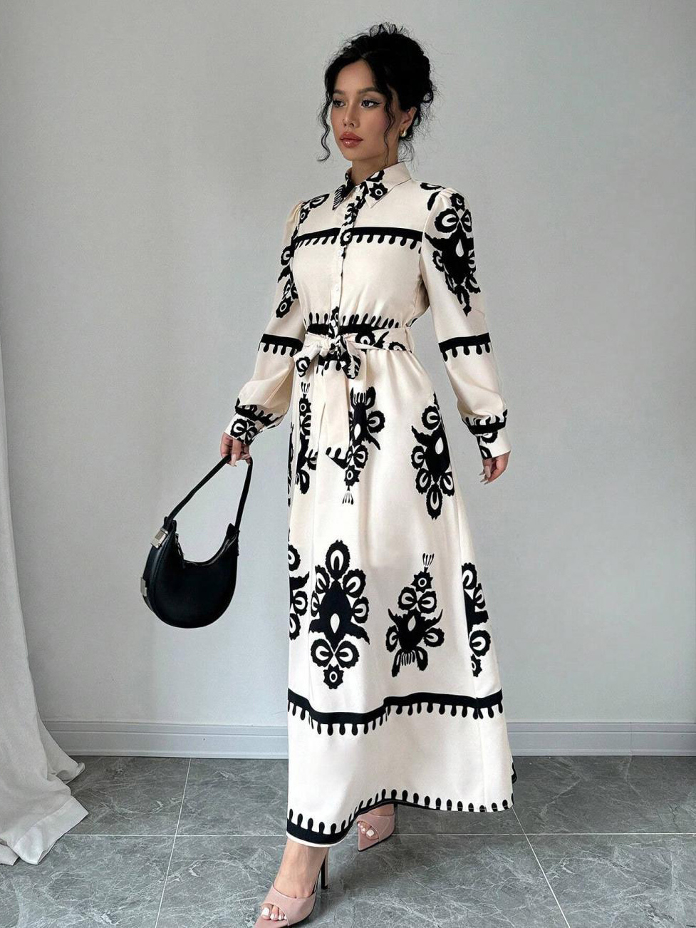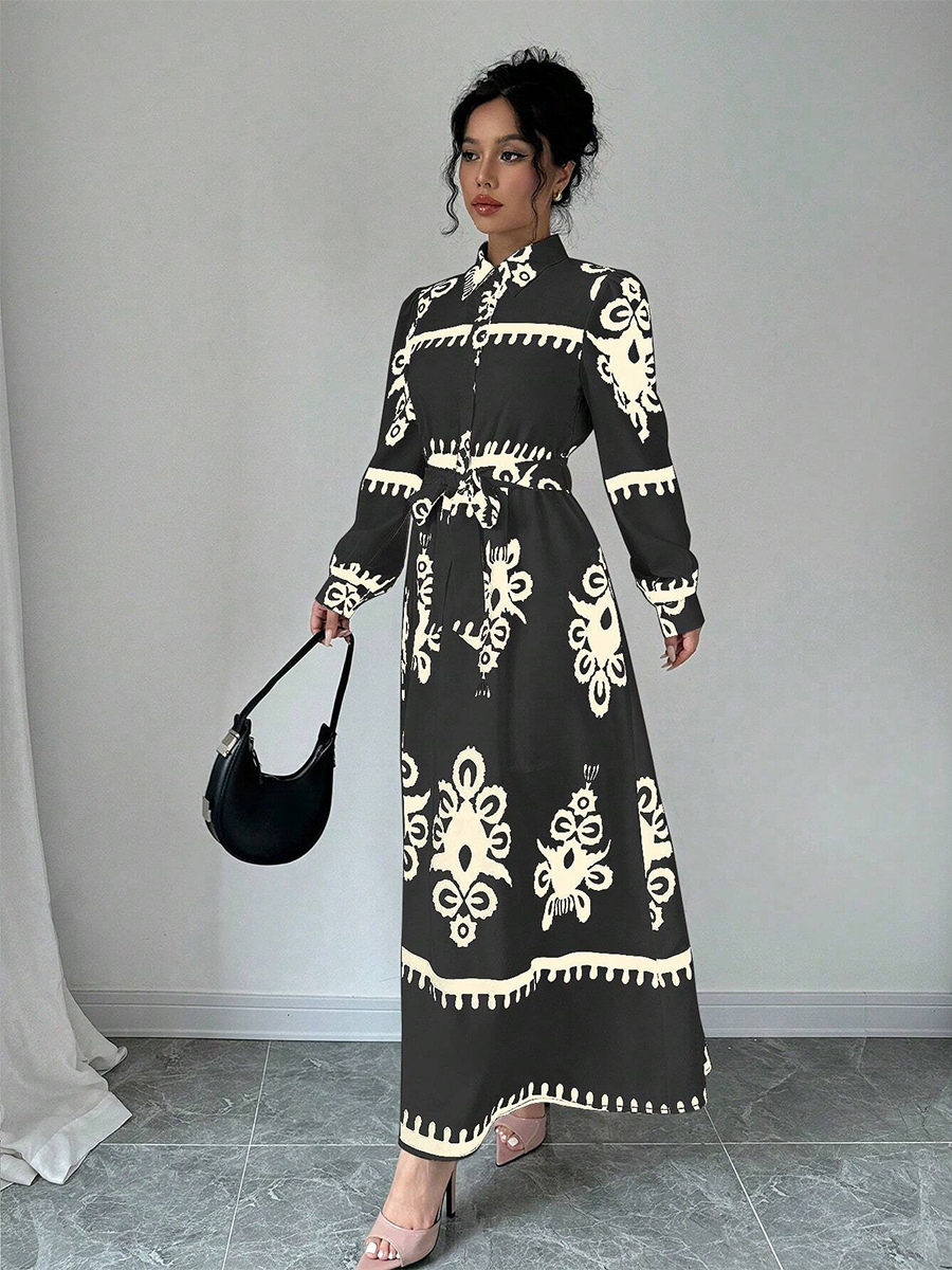 抽象的なプリントとベルトが付いた女性用マキシシャツドレス 2025