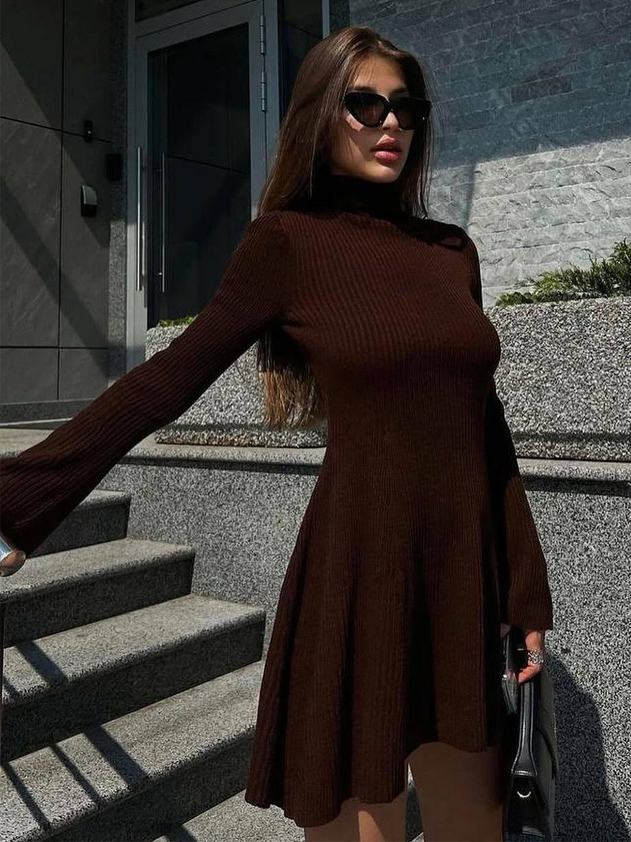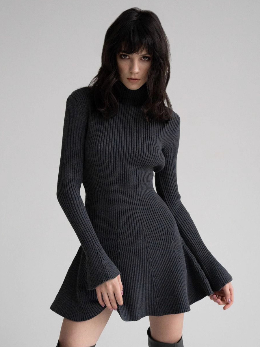 Aラインの裾とフレアスリーブが特徴のリブニットショートドレス(レディース 2025)