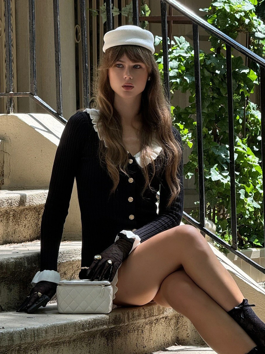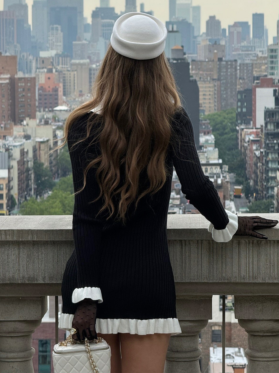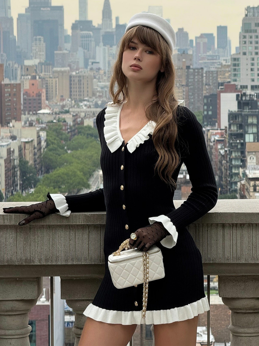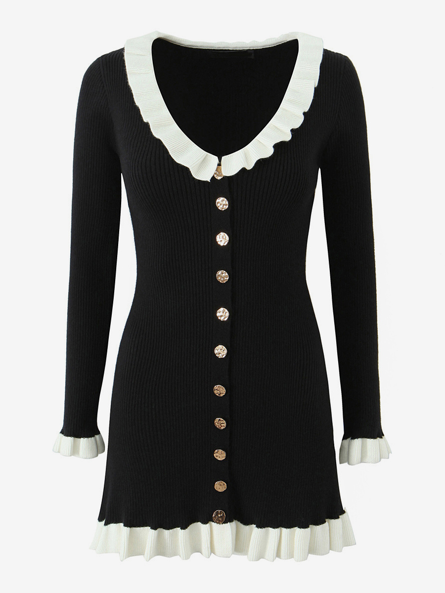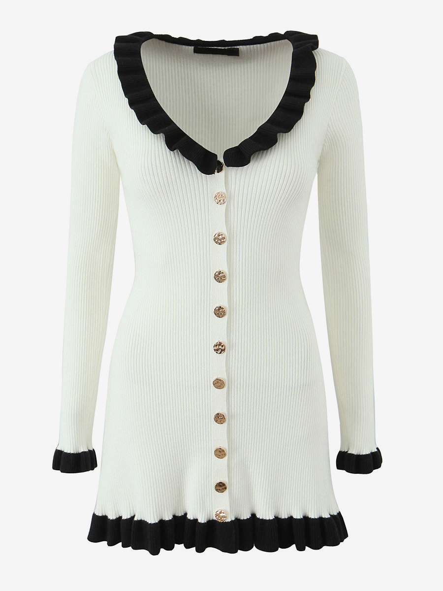 コントラストのフリルトリムとゴールドボタンが特徴のニットミニドレス(レディース 2025)