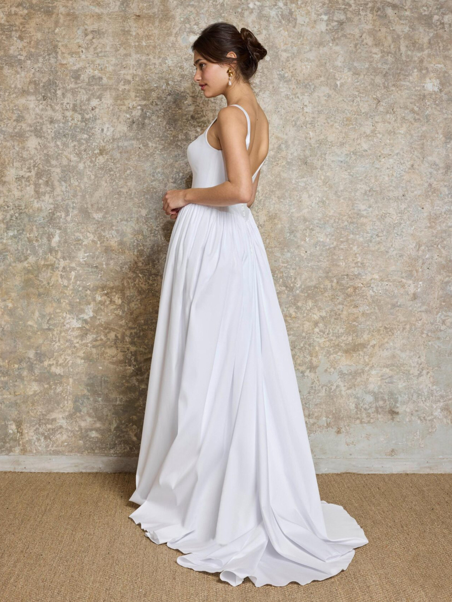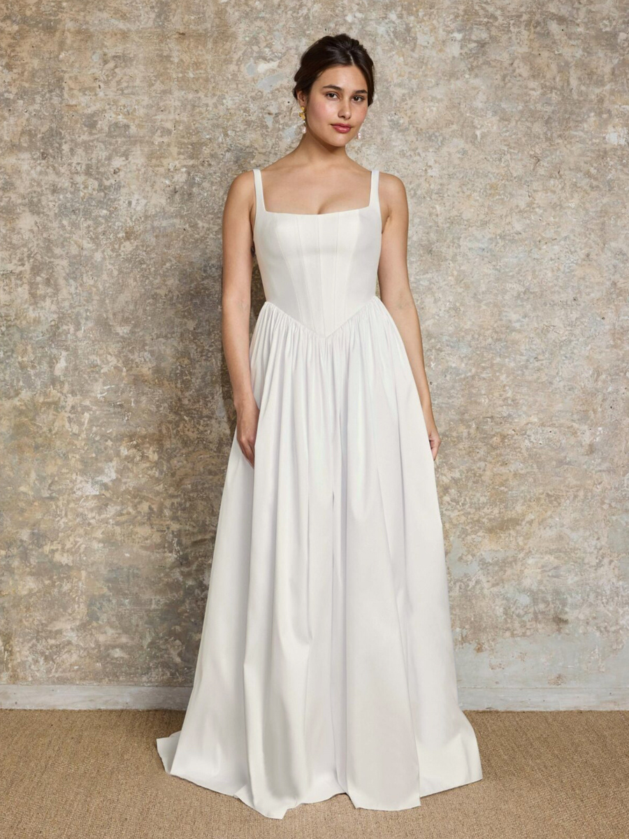 ヴィンテージウェディングドレス バスクウエスト サテン生地 スクエアネック ノースリーブ プリーツ Aライン シンプルブライダルガウン