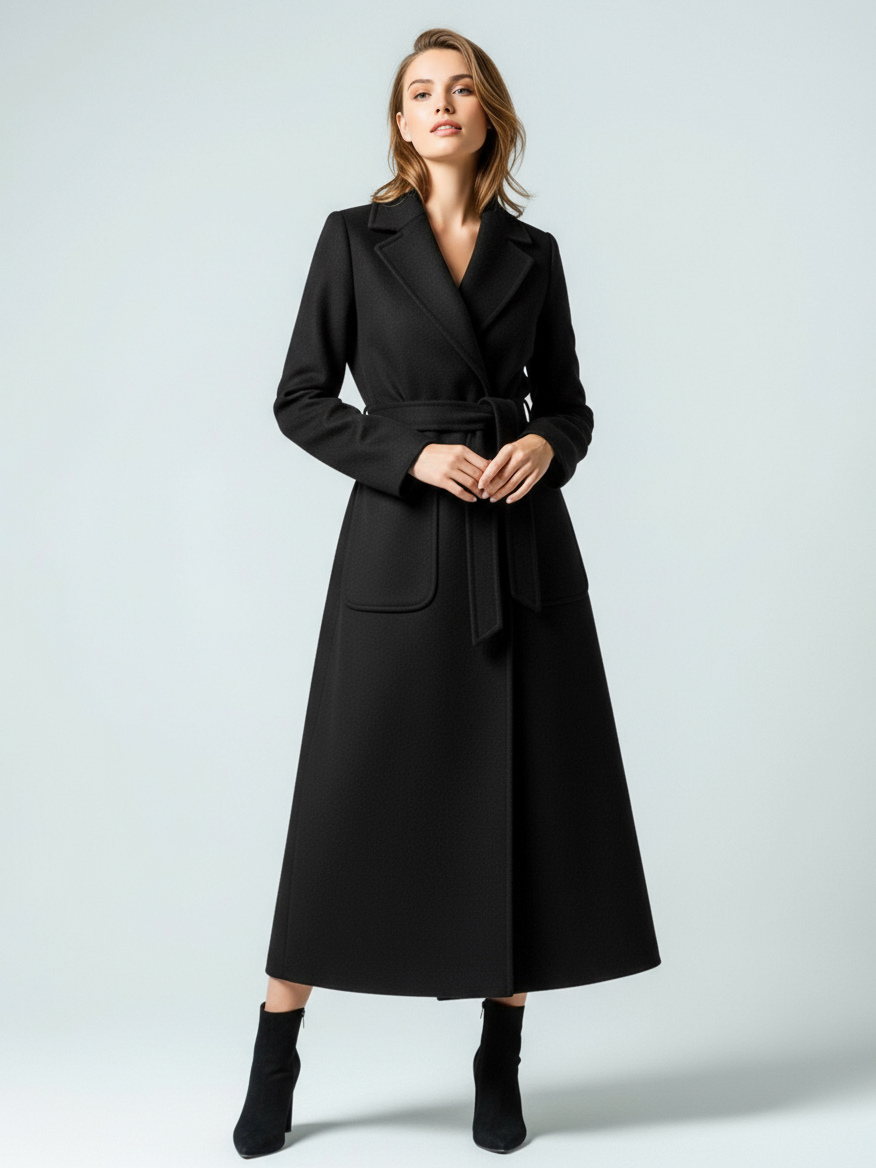 ノッチラペル付きベルト付きロングラップウールコート(レディース)2025