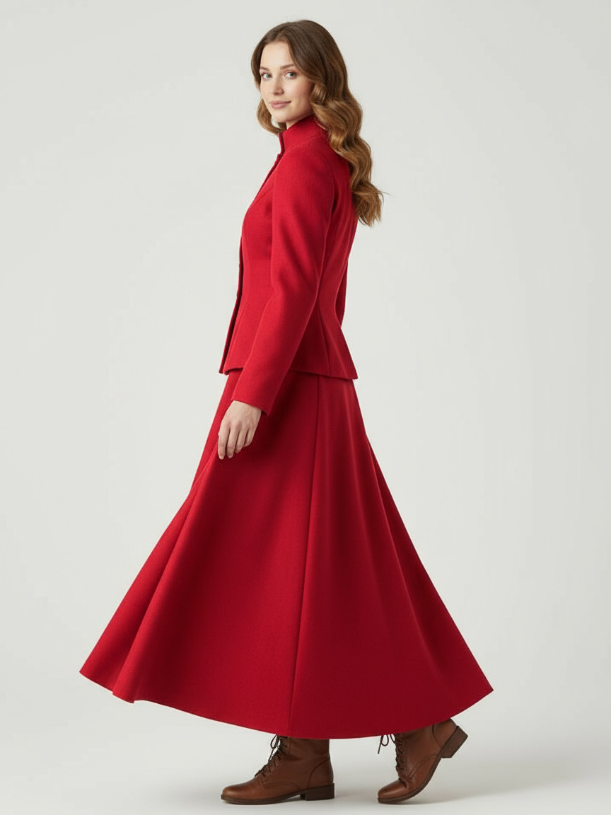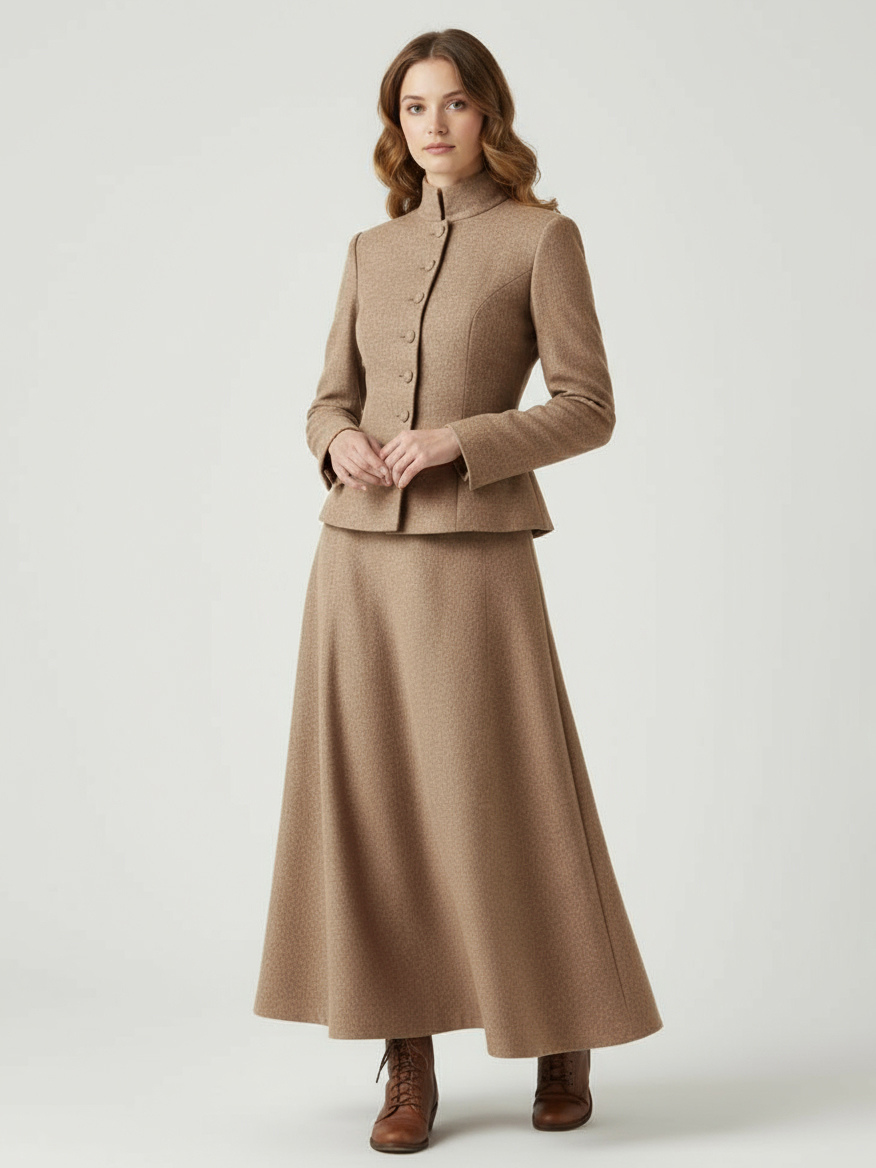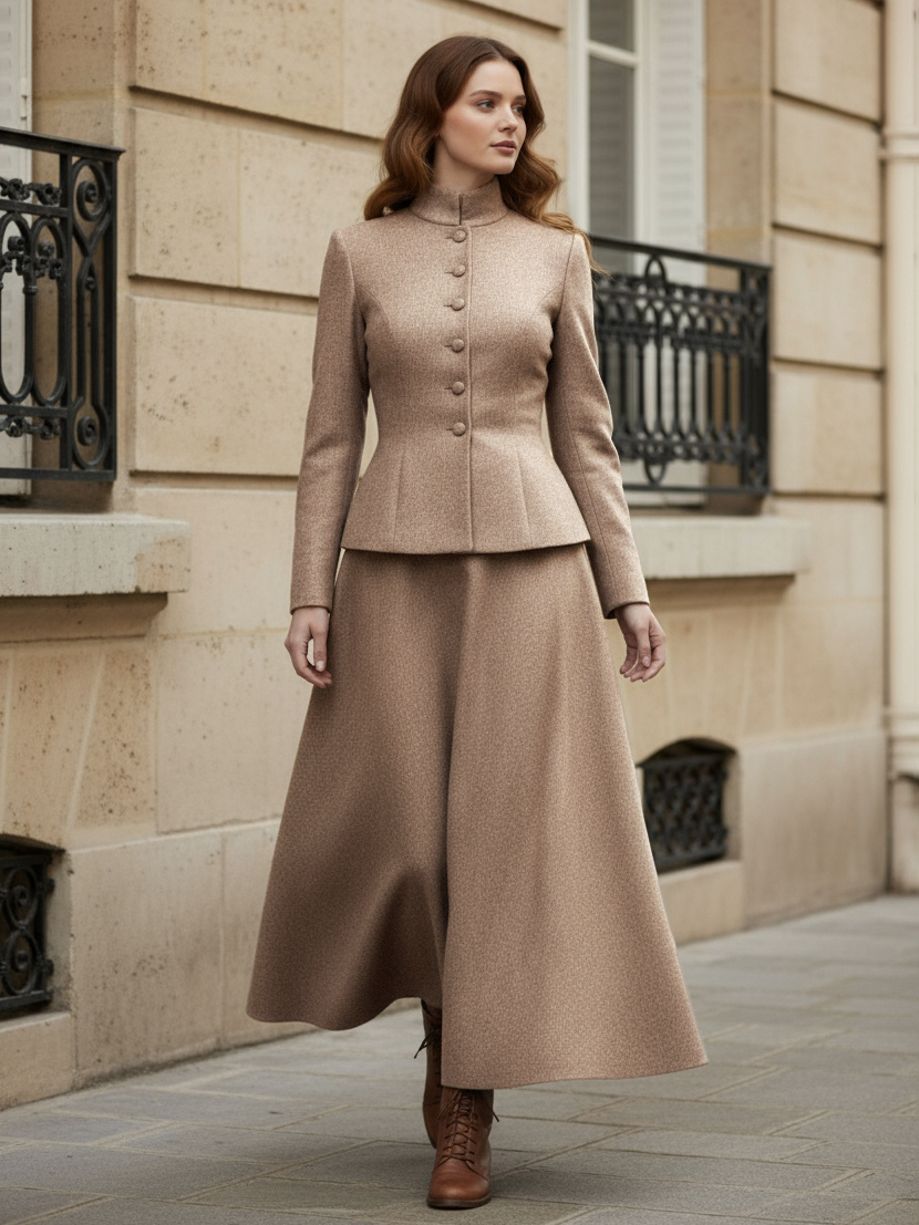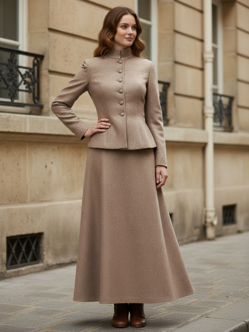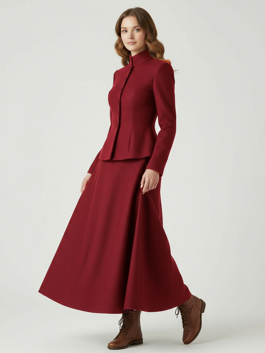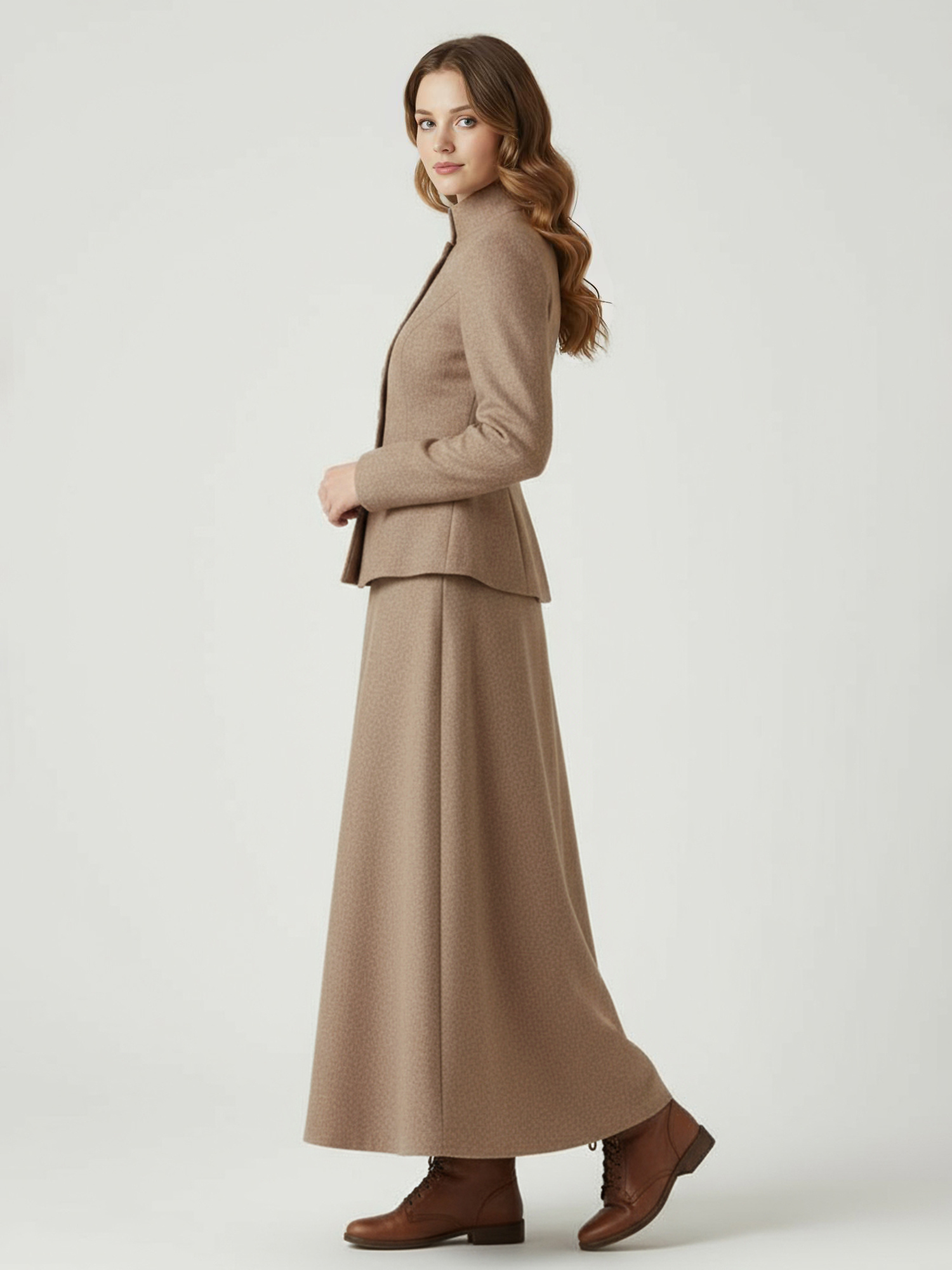 スタンドカラーペプラムジャケットとマキシスカートのウールブレンドツーピースコーデセット(レディース2025年)