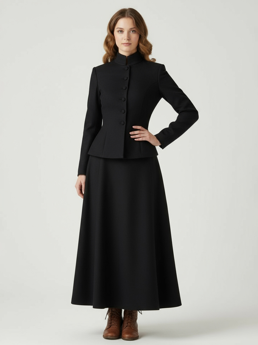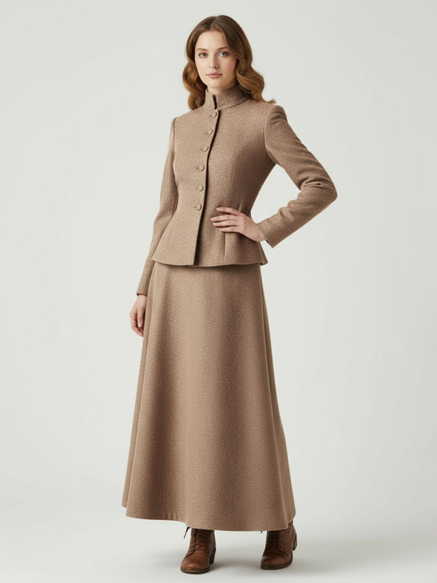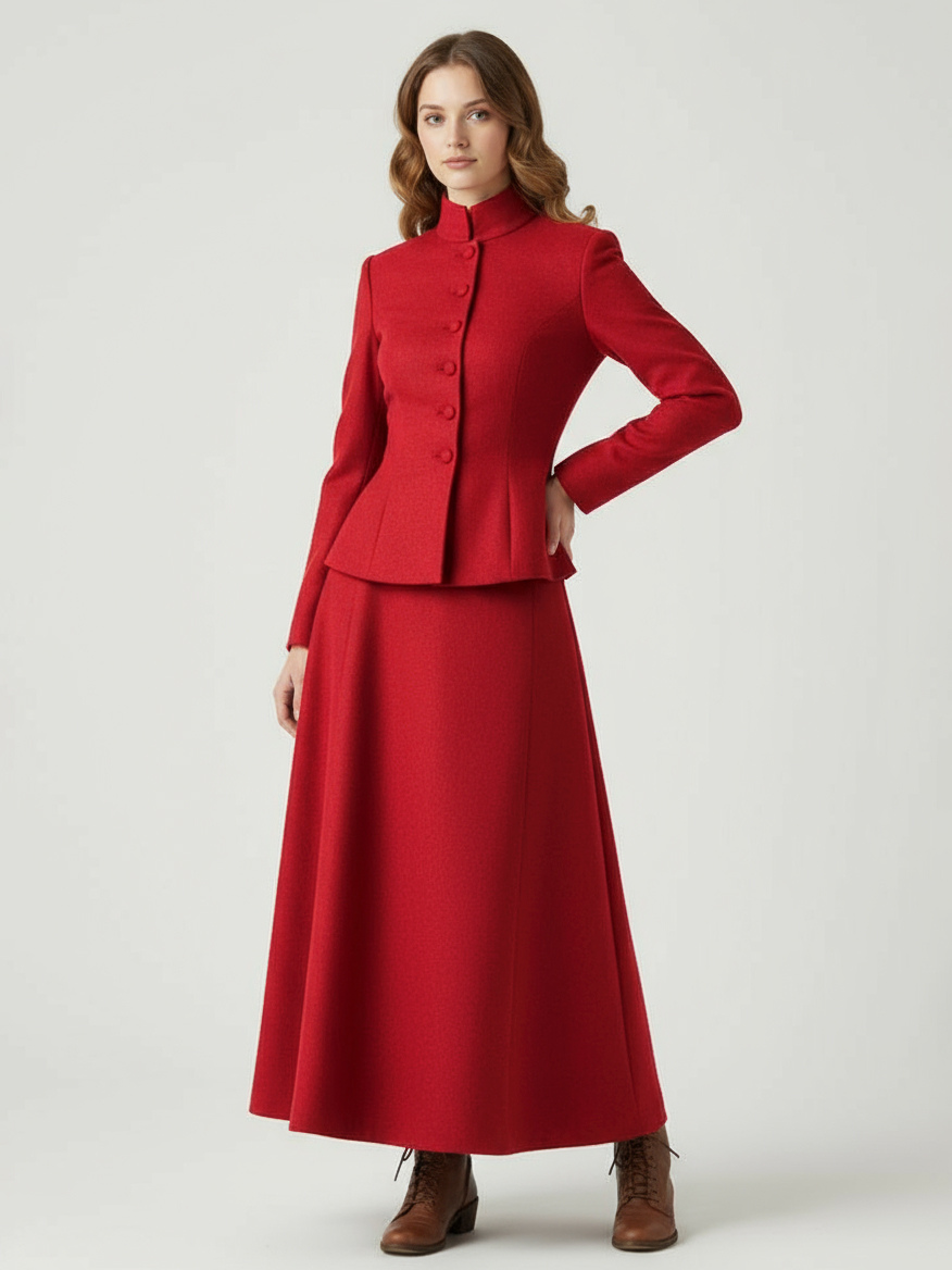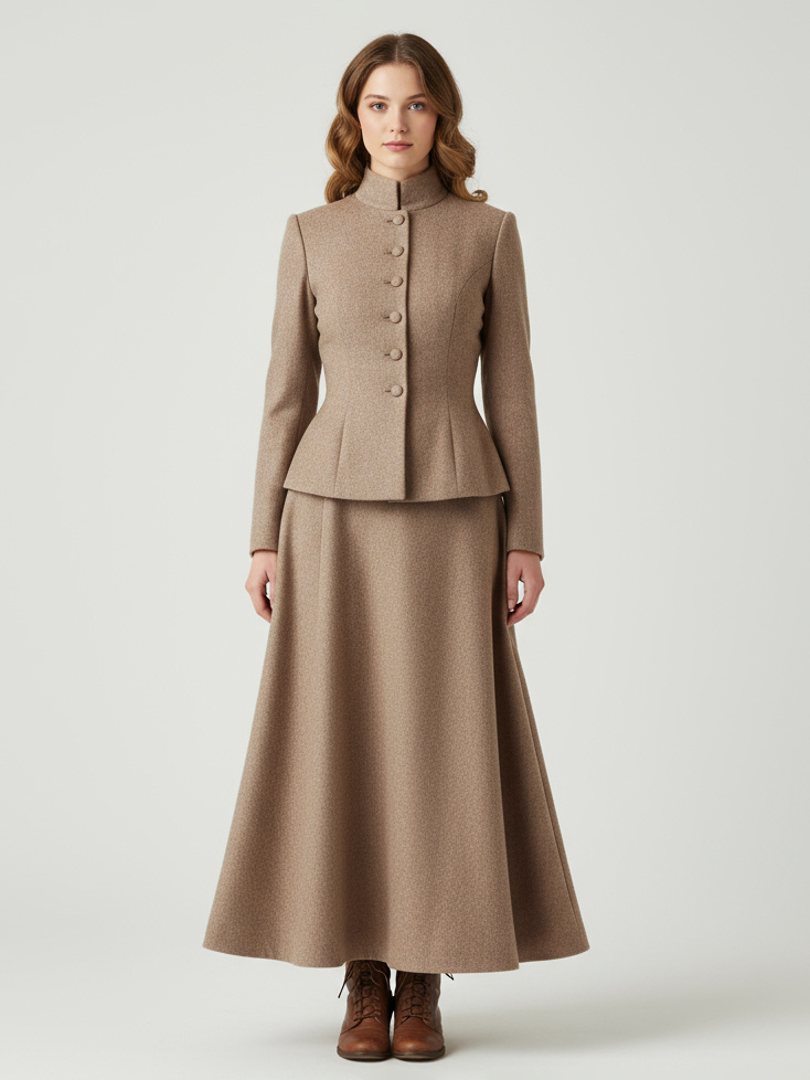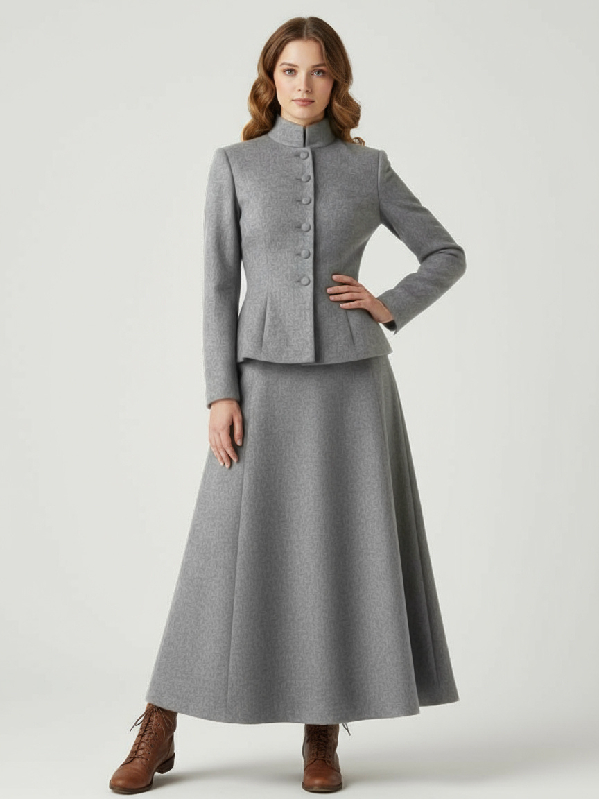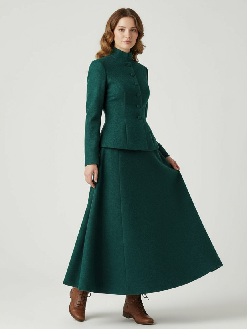 スタンドカラーペプラムジャケットとマキシスカートのウールブレンドツーピースコーデセット(レディース2025年)