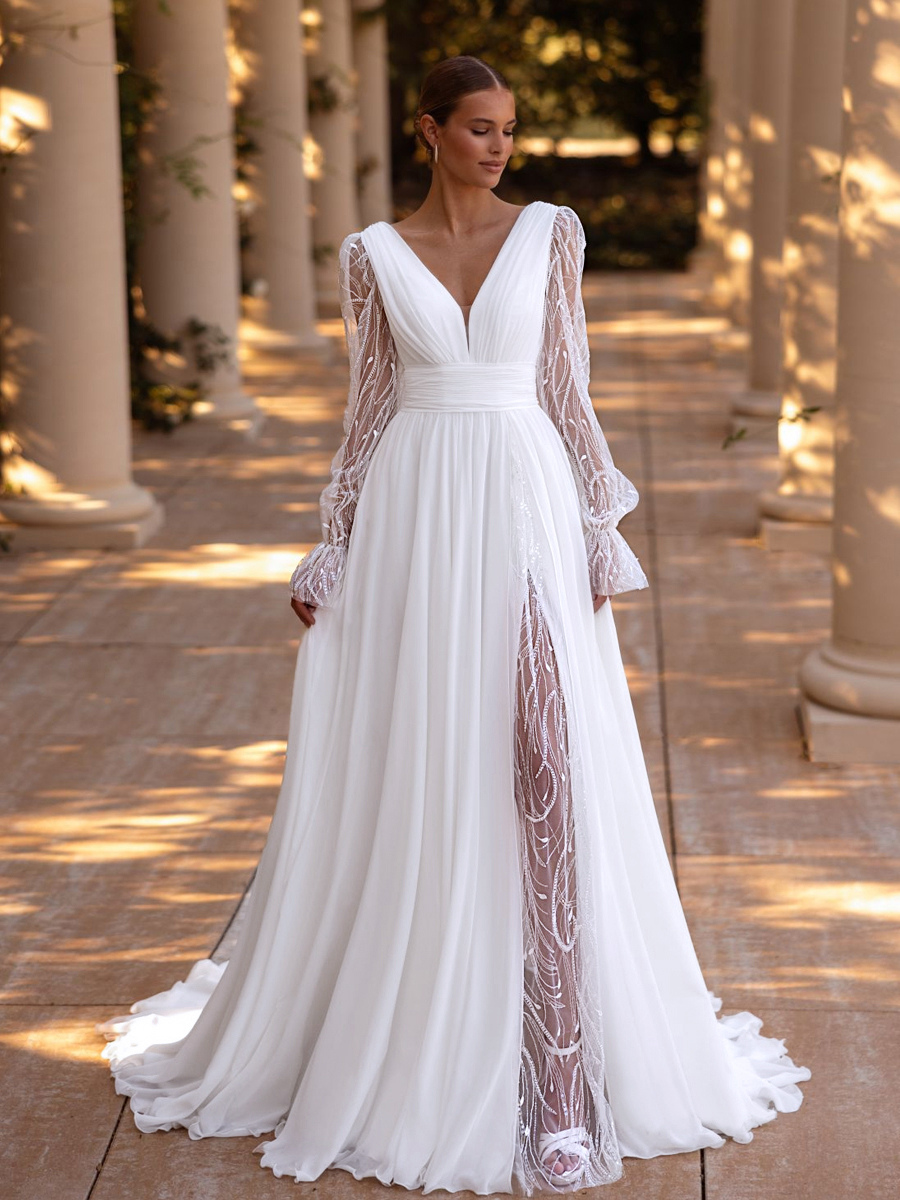 ボヘミアンウェディングドレス、トレーン付きAライン、長袖、レース、Vネック、ブライダルガウン