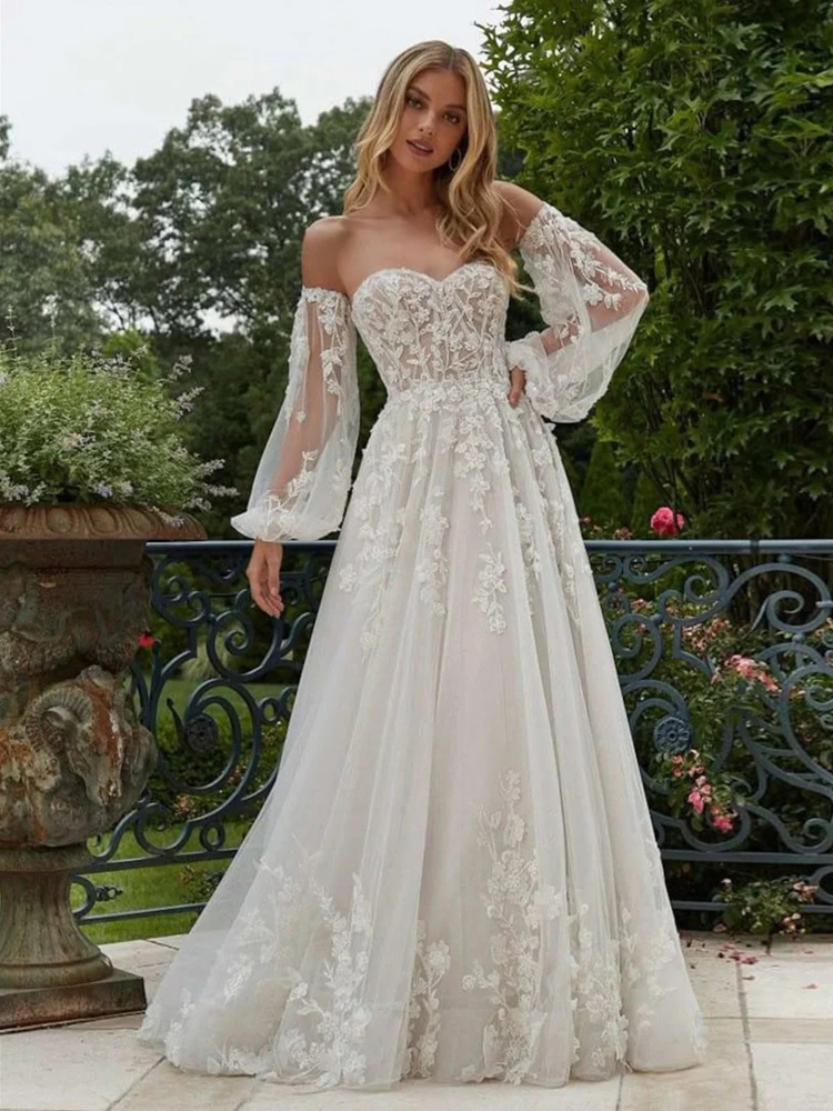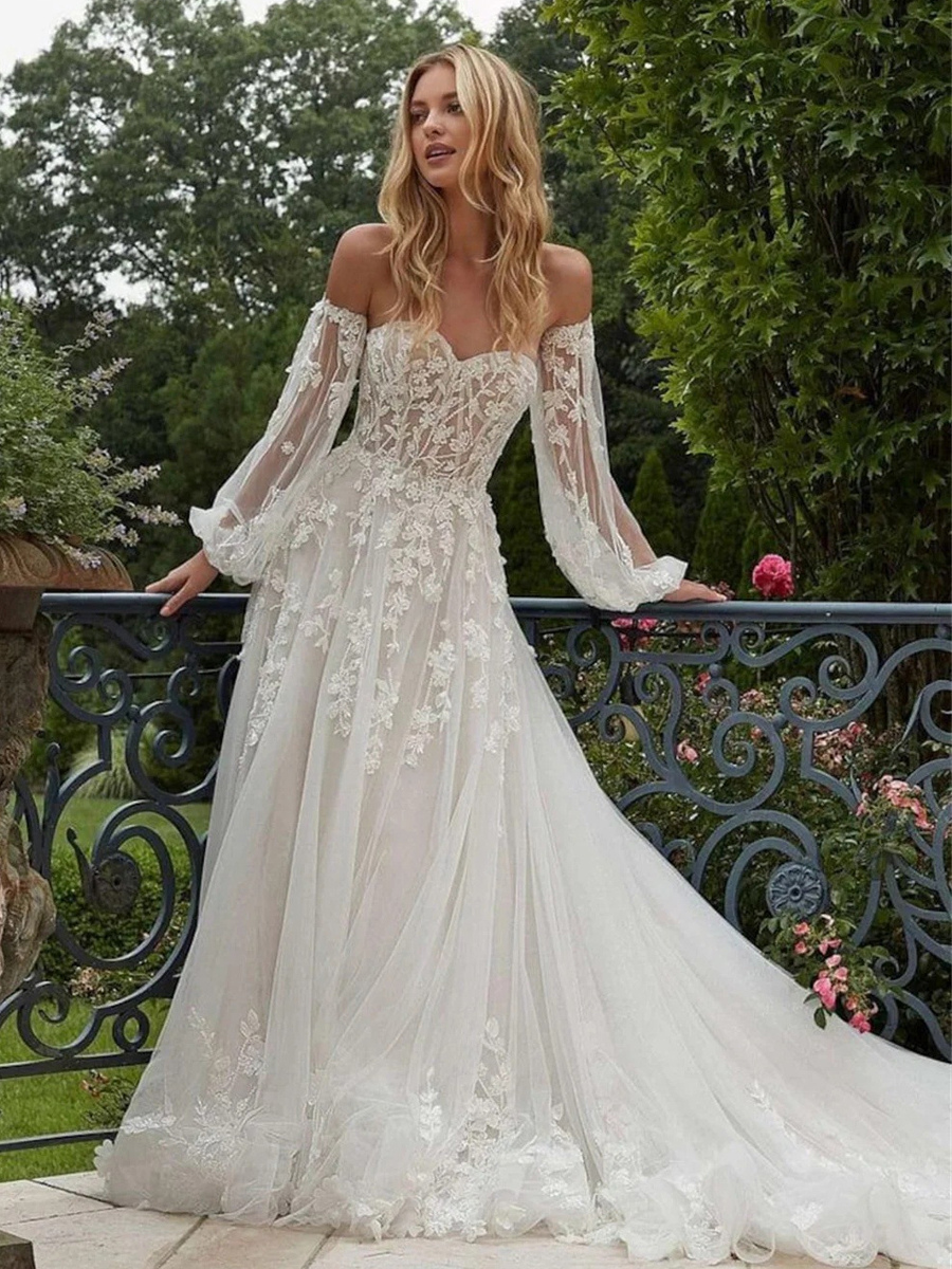 ウェディングドレス スウィートハートネック 取り外し可能な袖 トレーン付き レースブライダルドレス