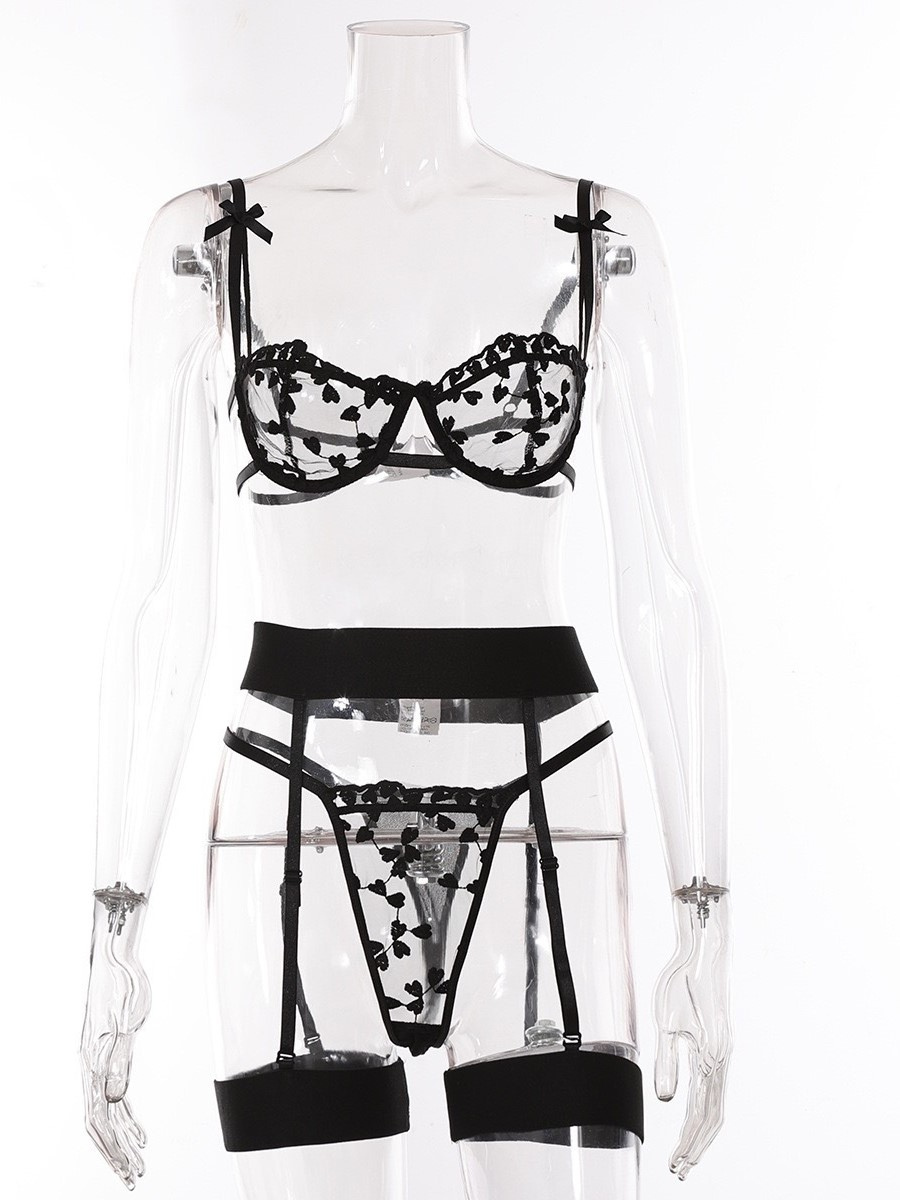 3ピースランジェリー シースルーレースアップ レッド ブラ&パンティセット