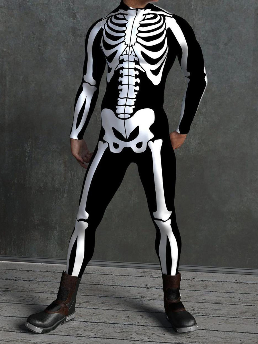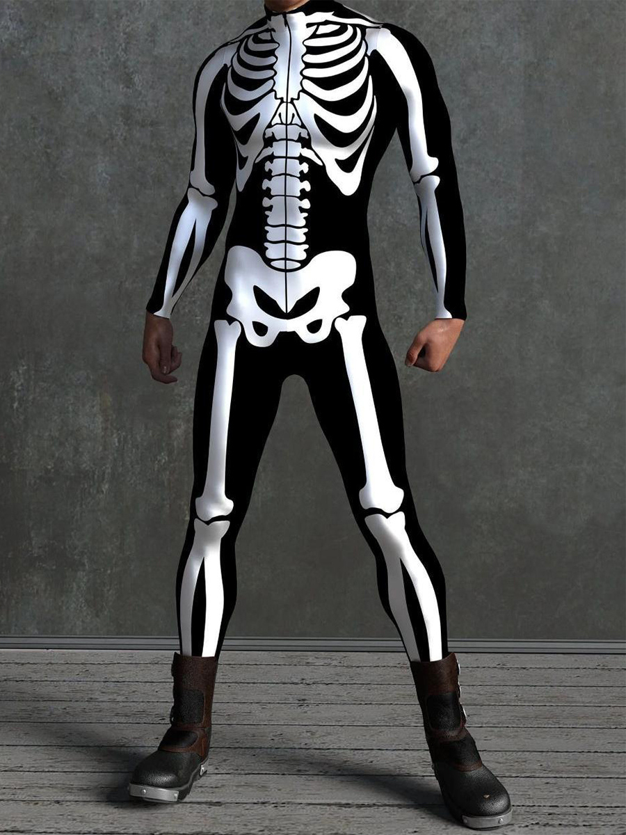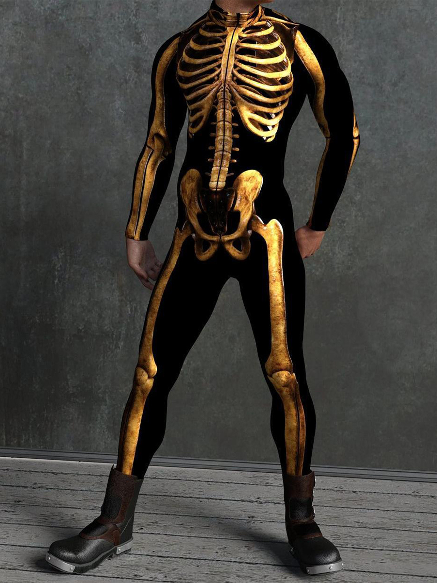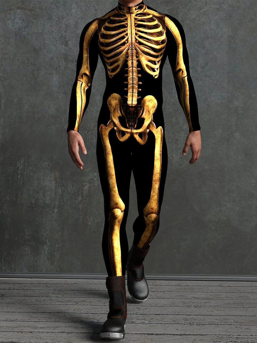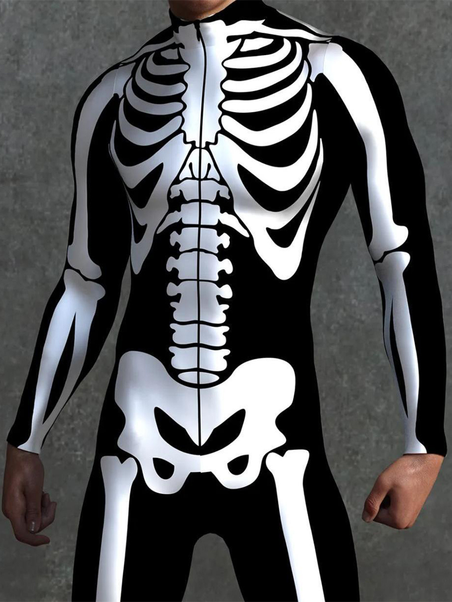 This Halloween skeleton bone bodysuit features anatomically accurate 3D-printed bone detailing, creating a form-fitting jumpsuit that delivers a striking skeletal illusion for spooky seasonal wear.
